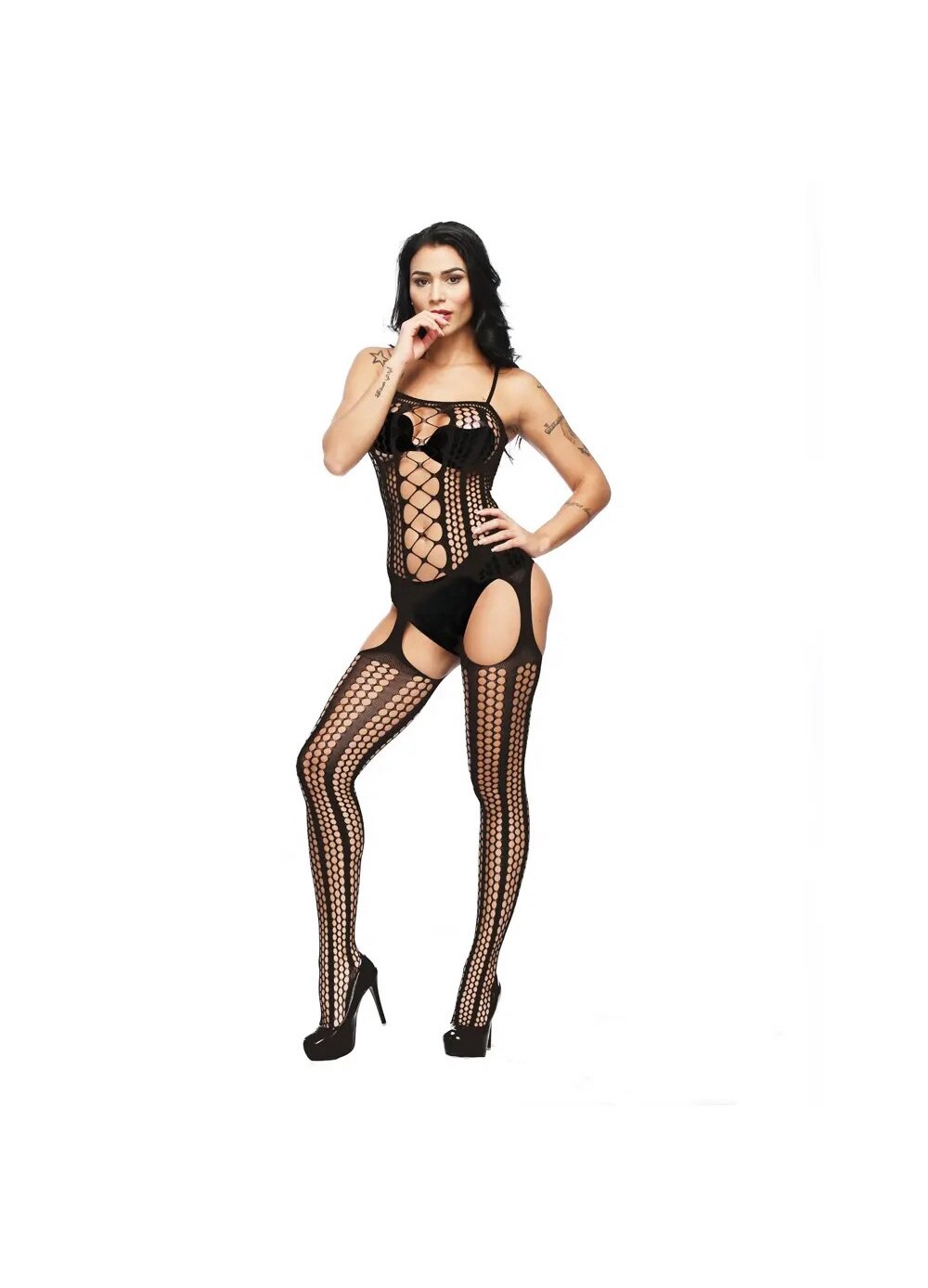 Set lenjerie sexy premium, plasa seducatoare, dantela, ciorapi cu bretele subtiri Negru one size