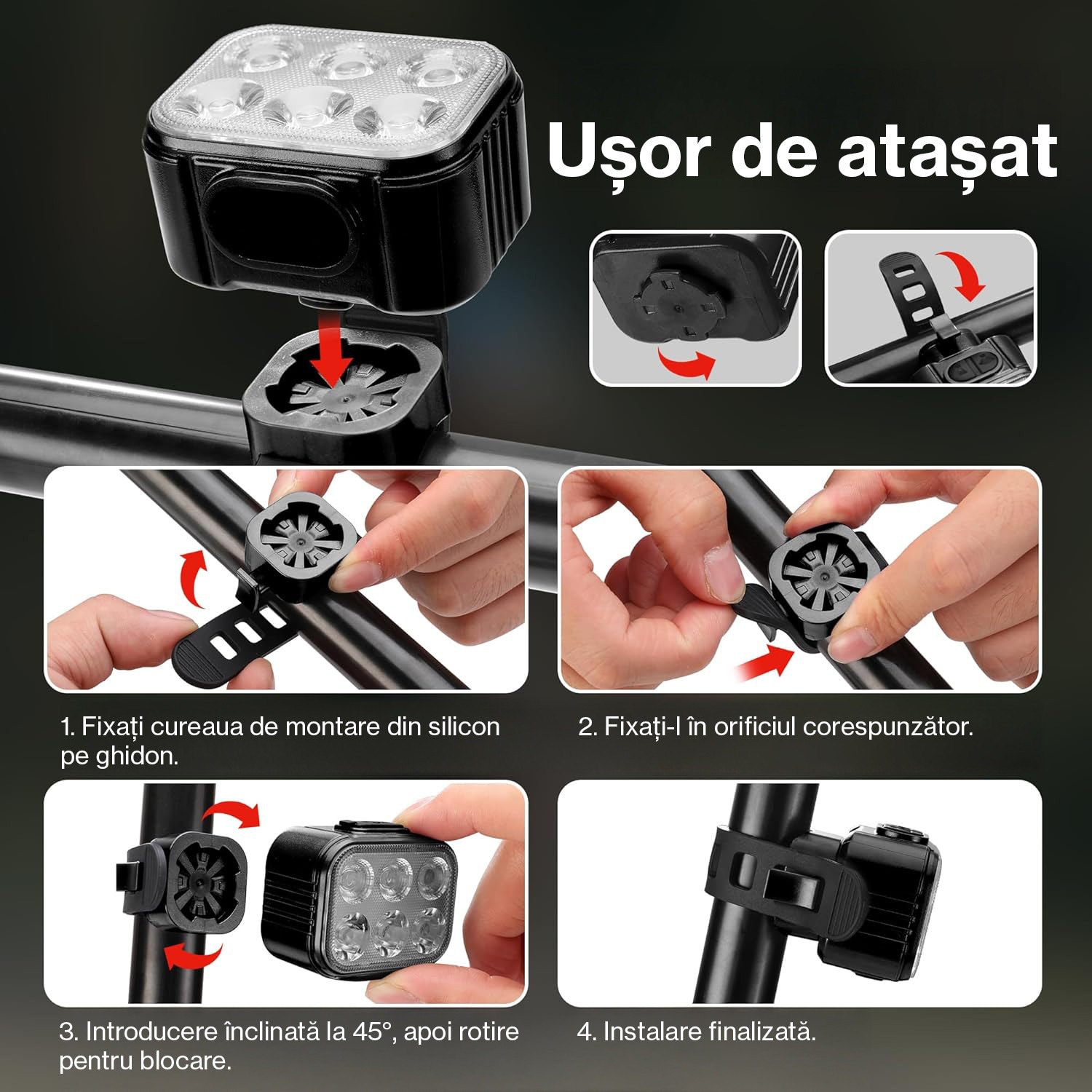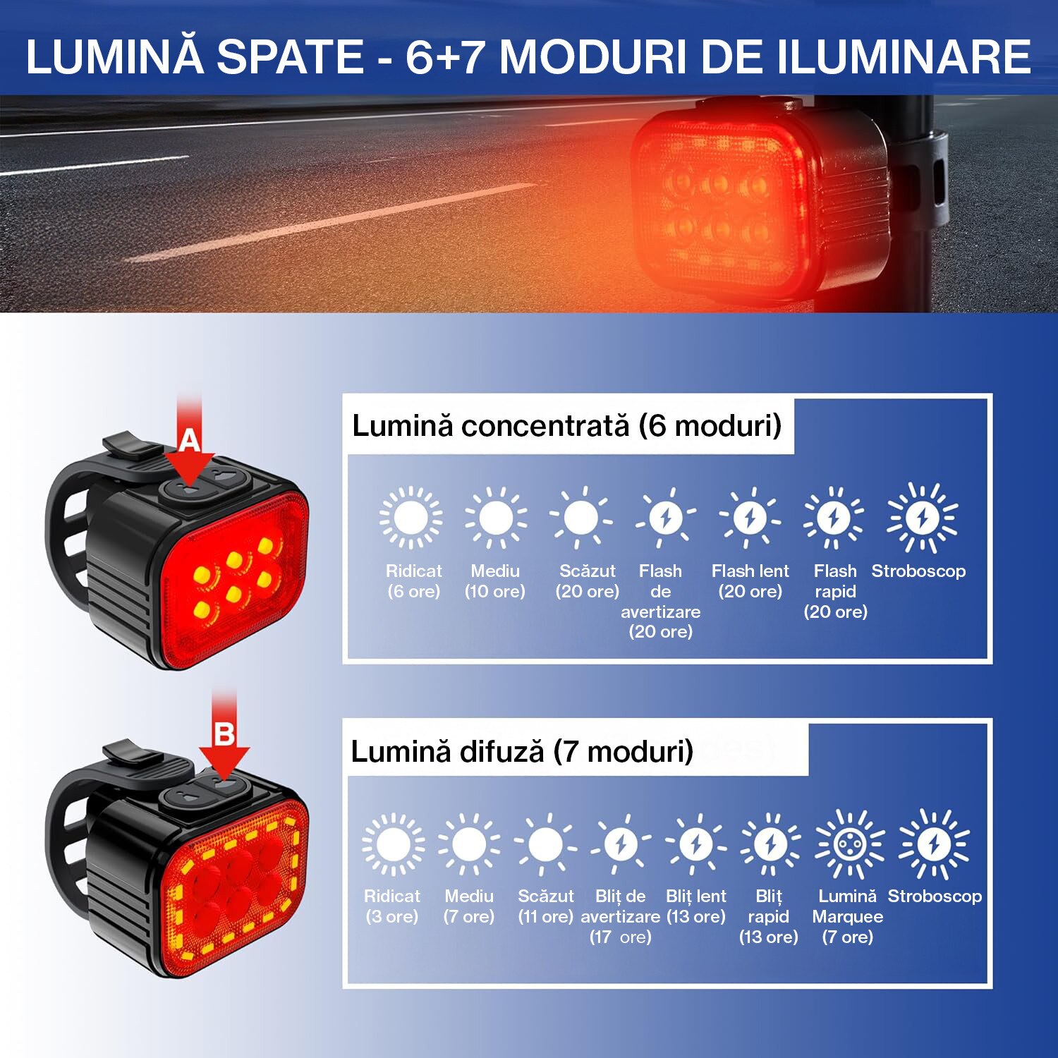 Set lumini bicicleta 25 de LED-uri, far bicicleta fata spate BeGenius®, USB reincarcabil cu acumulator 1100mAh, 4 Moduri de Iluminare, Montaj Simplu si Rapid, Rezistent la Apa IP65, Alb/Rosu
