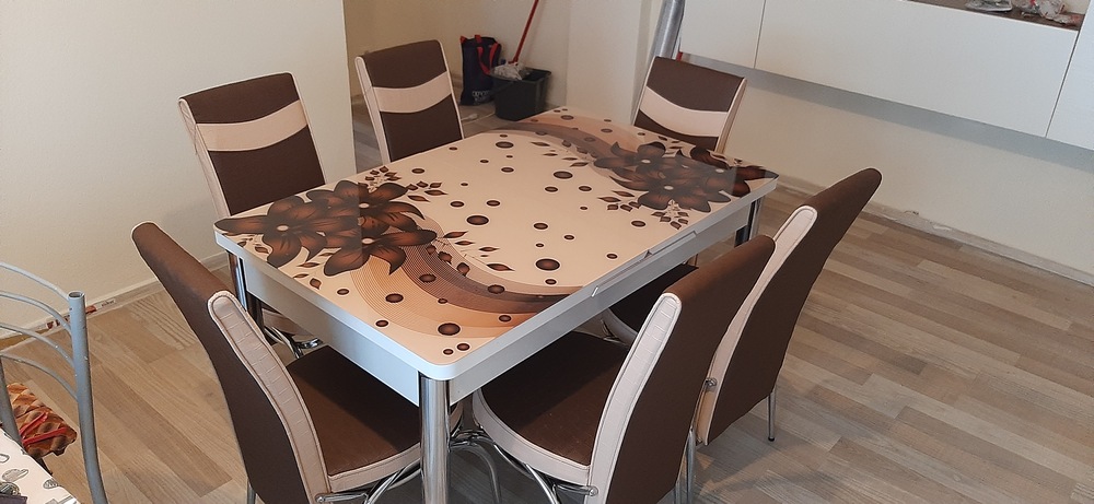 Set masa extensibila geam securizat +6 scaune piele eco, decor floral Anka Modella 170 x 80 x 76 cm, maro/bej