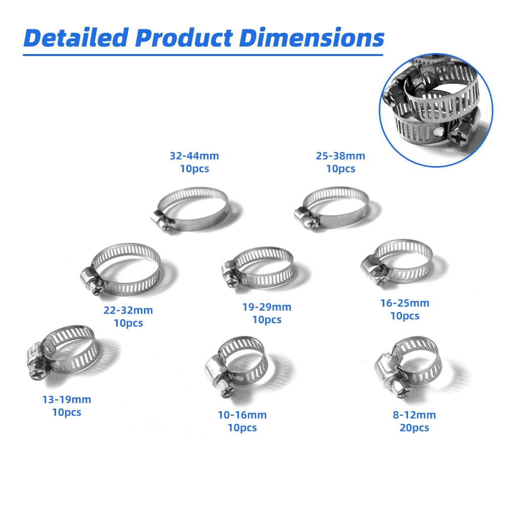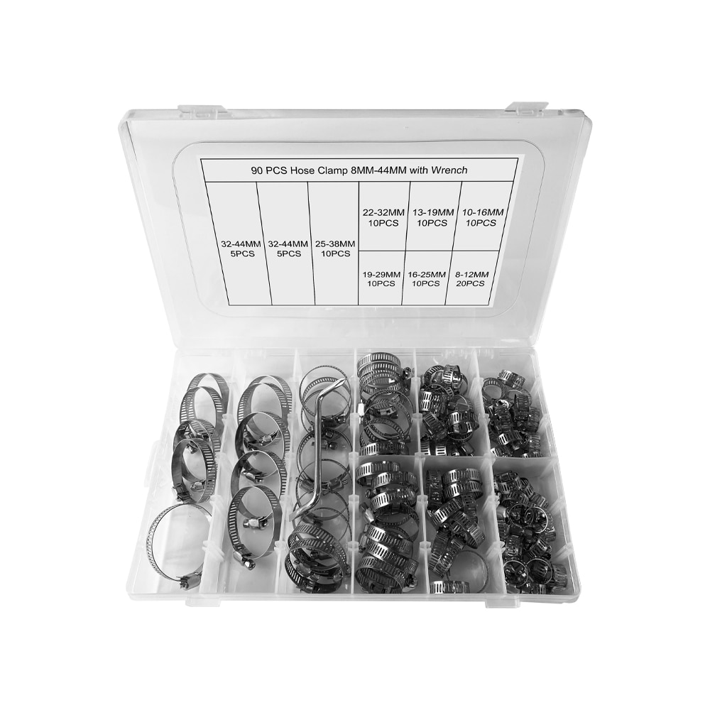 Set mixt 90 buc. cleme, coliere de furtun otel inoxidabil 8-38mm cu surub MaxTech®, Organizate in trusa semi-transparenta