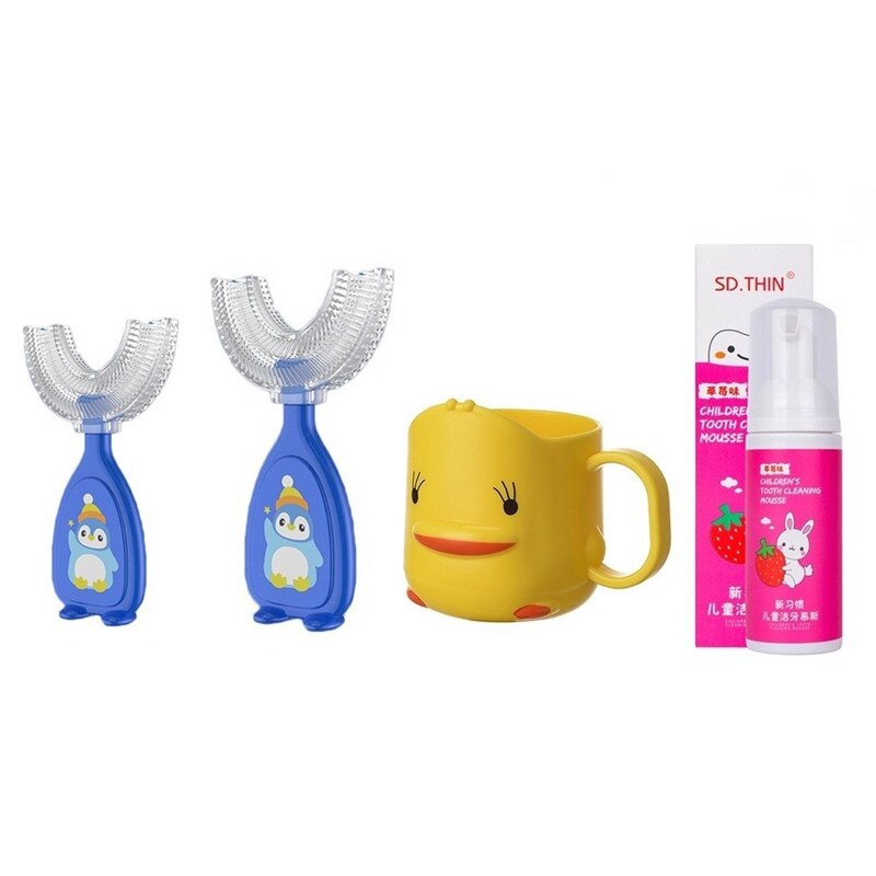 Set periute de dinti pentru copii, 4 piese, cu pahar pentru gura si pasta de dinti spuma, albastru, 10.3x5.8cm, 9.8x5cm