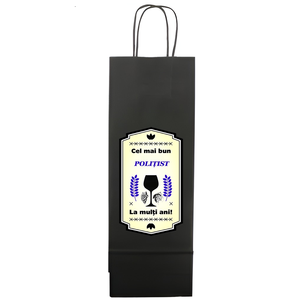 Set personalizat sticla de vin alb, demisec, Sauvignon Blanc, 750 ml si punga de cadouri cu imprimeu Cel mai bun politist