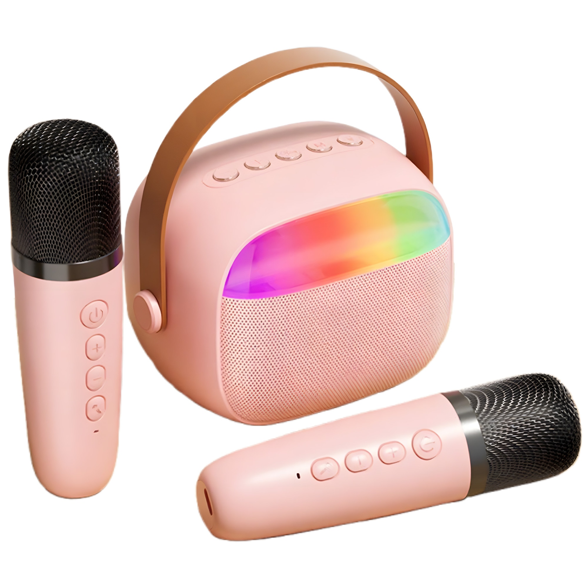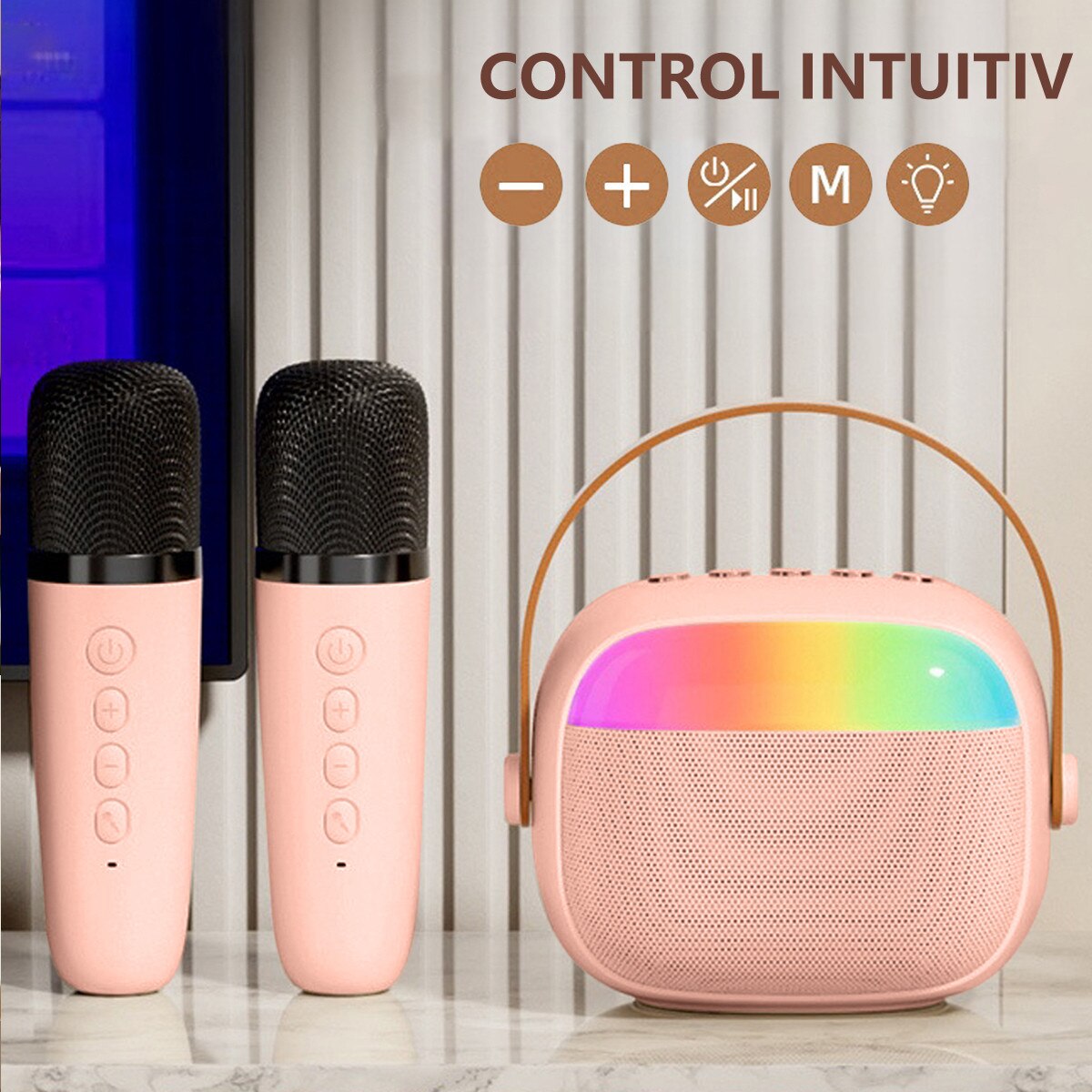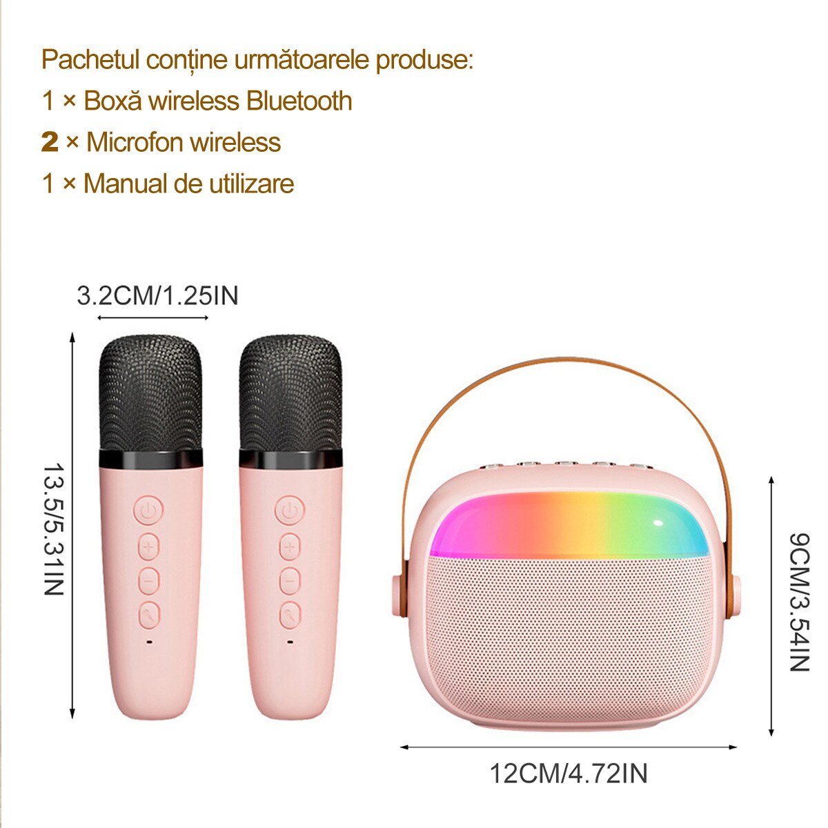 Set Sistem Karaoke Portabil cu 2 Microfoane Wireless, Boxa cu Lumini RGB, Schimbator de Voce si Bas Puternic, Conectivitate Bluetooth/USB/Card TF/AUX, pentru Petreceri, Copii, Acasa si Gradina, Cadou pentru Zile de Nastere si Craciun,Roz