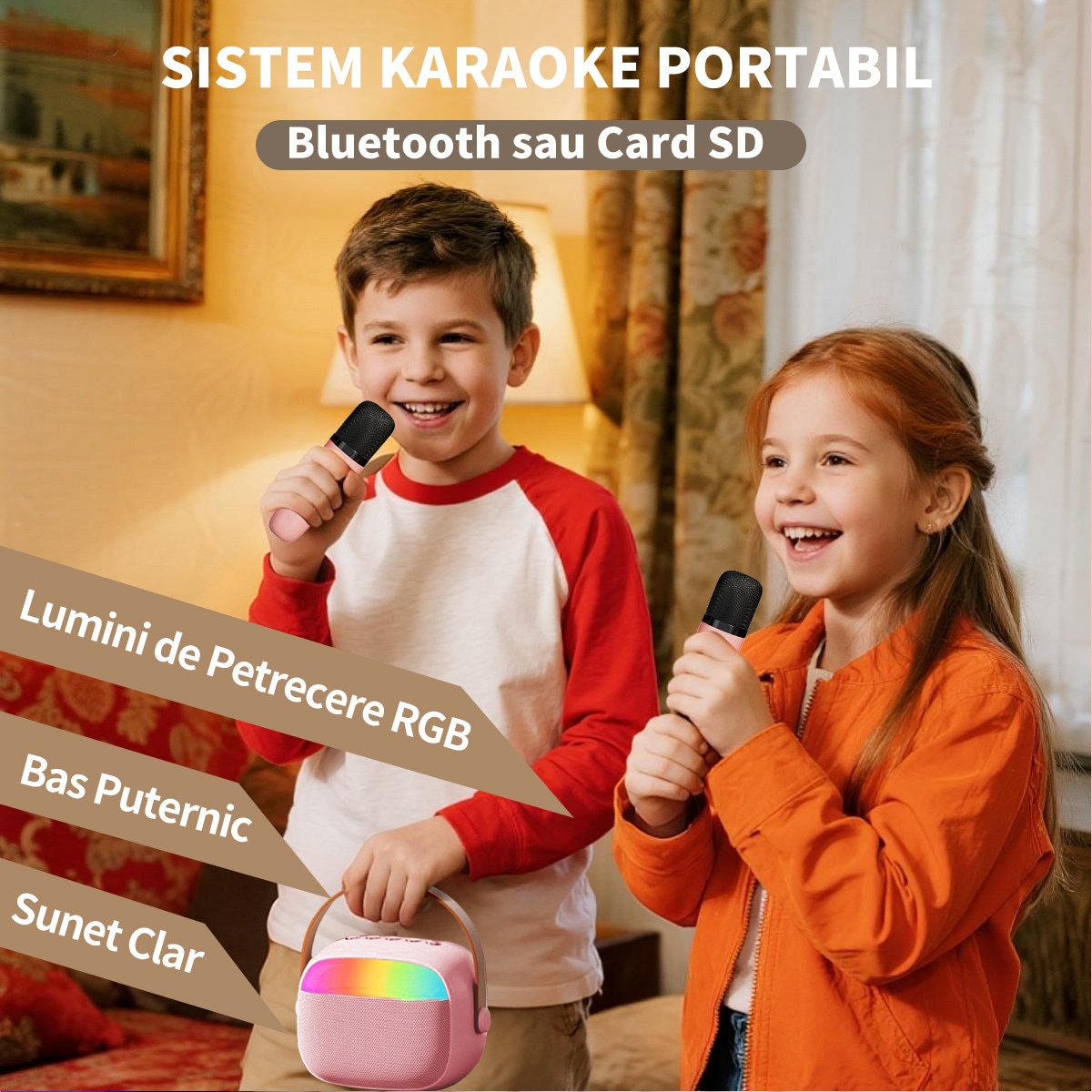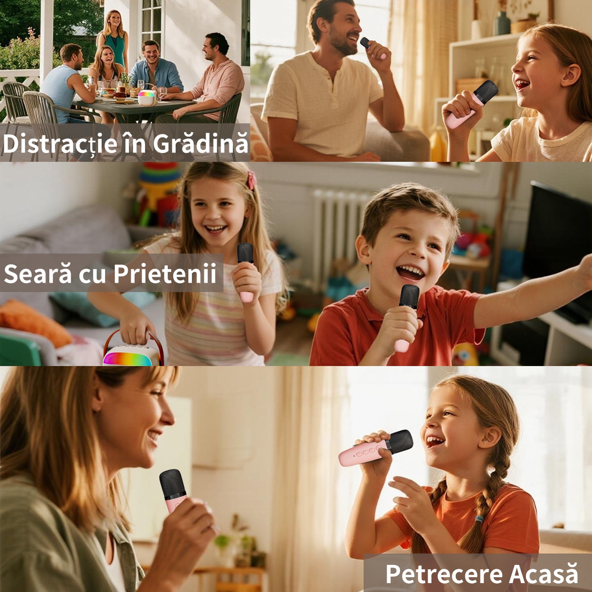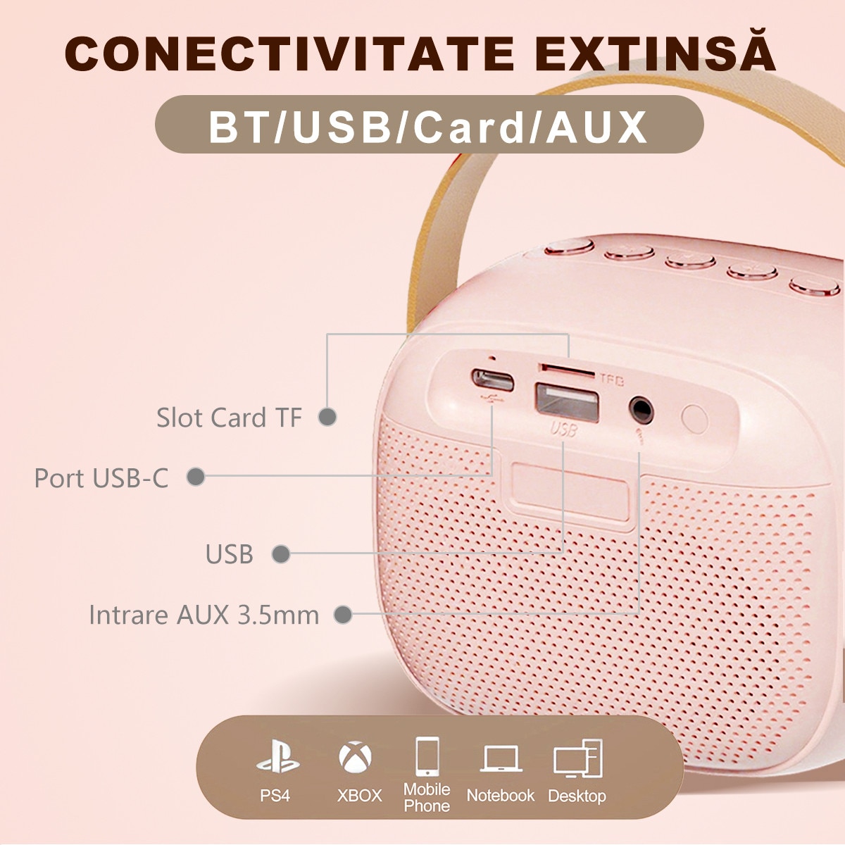 Set Sistem Karaoke Portabil cu 2 Microfoane Wireless, Boxa cu Lumini RGB, Schimbator de Voce si Bas Puternic, Conectivitate Bluetooth/USB/Card TF/AUX, pentru Petreceri, Copii, Acasa si Gradina, Cadou pentru Zile de Nastere si Craciun,Roz