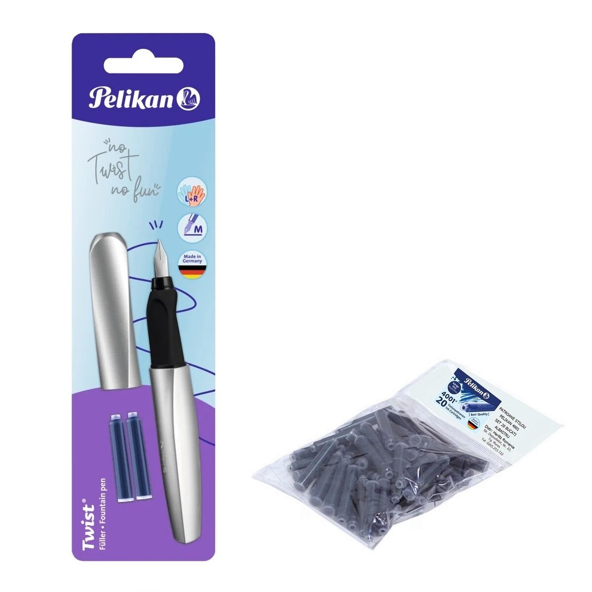 Set stilou Pelikan Twist argintiu, blister, penita M, cu 20 rezerve cerneala Pelikan