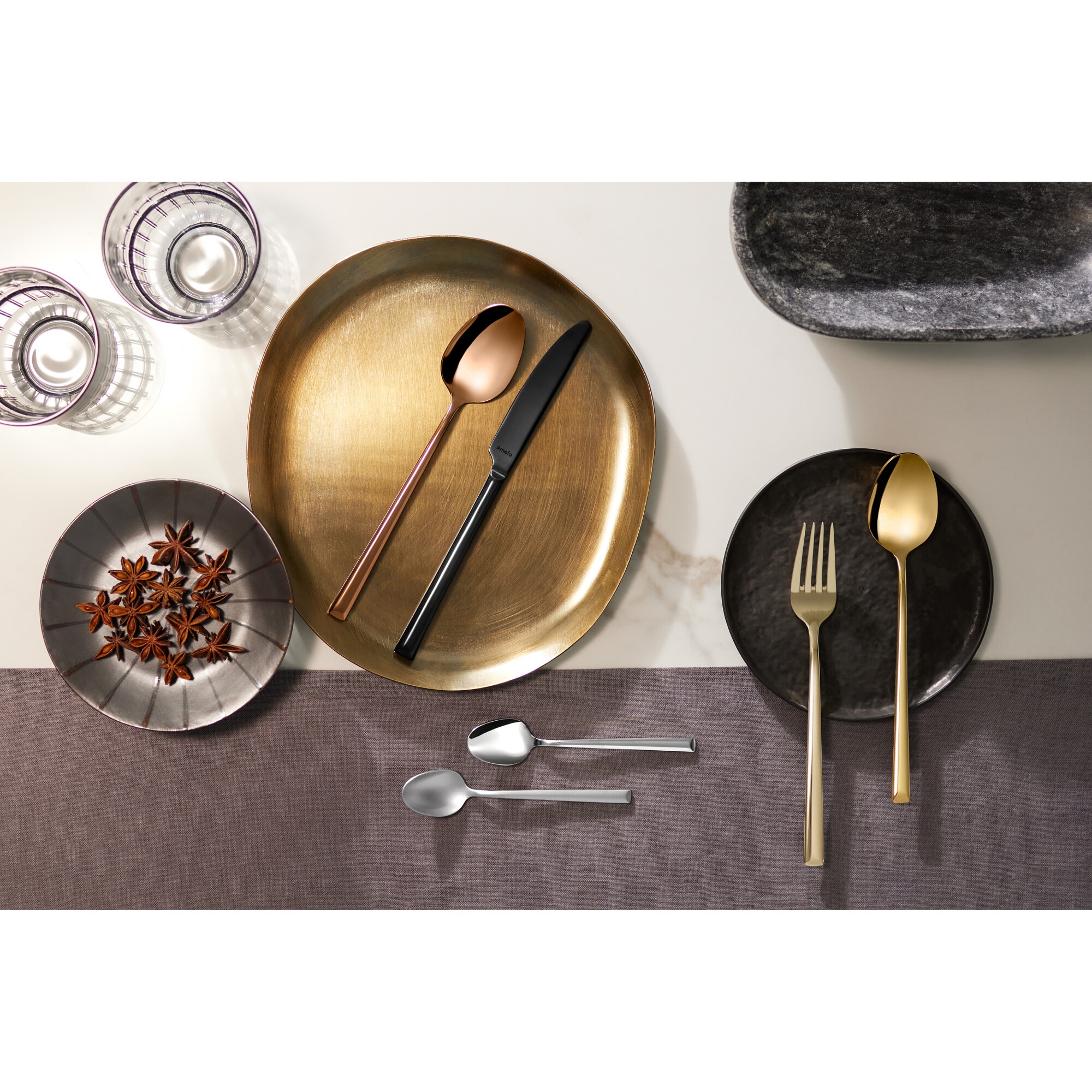 Linii lungi si subtiri cu un detaliu inclinat la capatul manerului. Un design bazat pe arhitectura contemporana a orasului, cu un aspect luxos si modern. Bucurati-va de mese cu tacamurile Amefa! Pentru fiecare zi si pentru acele momente speciale. Pentru gurmanzi, entuziasti si gurmanzi. Cu atentie la detalii si in concordanta cu cele mai recente tendinte, Amefa ofera o gama larga de tacamuri si produse aferente pentru a se potrivi fiecarui buget. Fie ca este vorba despre micul dejun cu familia, cina cu prietenii sau un gratar festiv, exista un design pentru fiecare ocazie si stil. Pentru cei care stiu ca adevarata maiestrie dureaza pentru totdeauna.