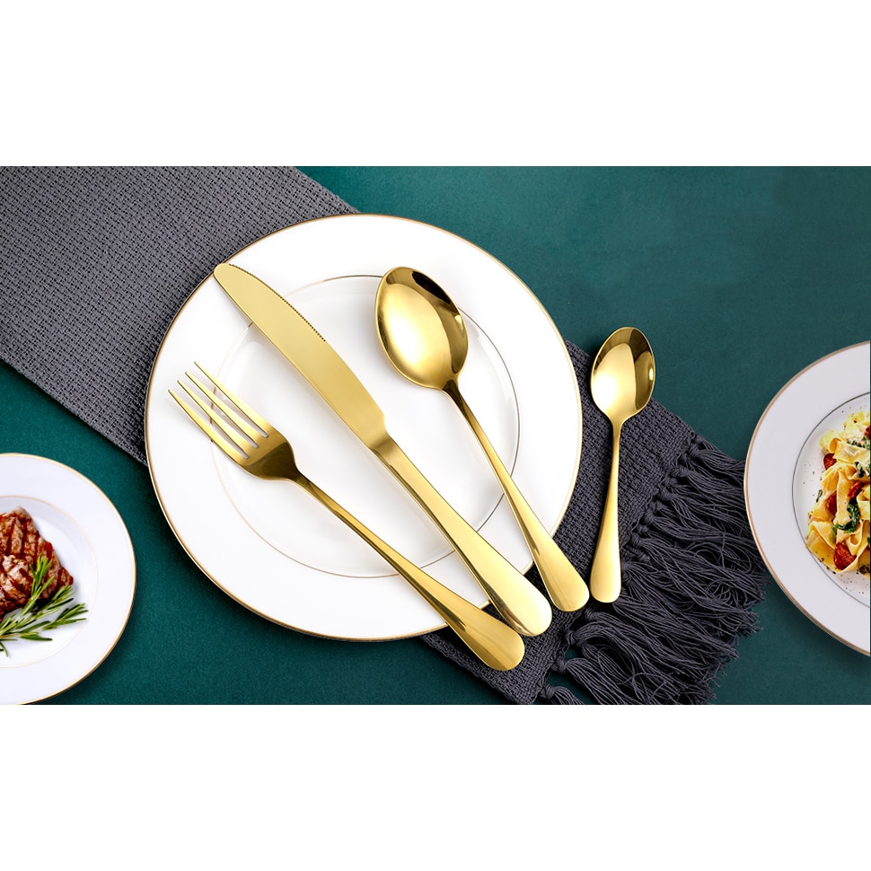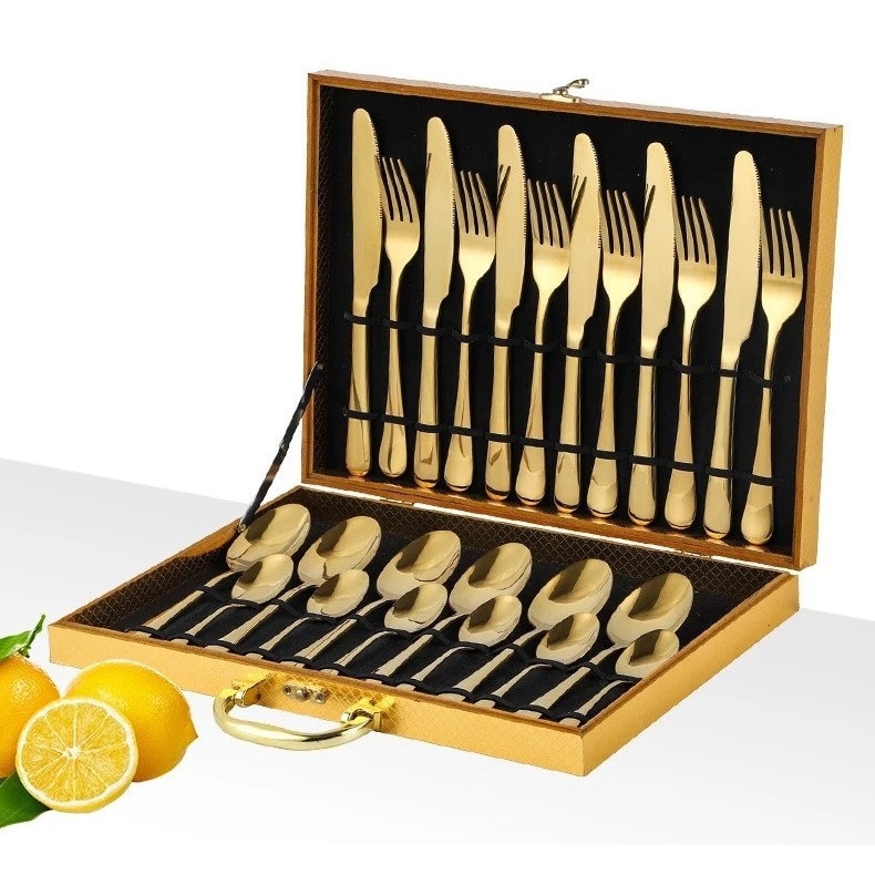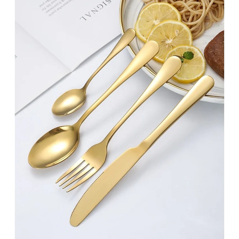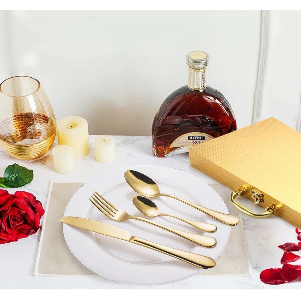 Set tacamuri din inox, 24 piese, 6 x linguri de masa, 6 x cutite, 6 x lingurite pentru ceai, 6 x furculite, Auriu
