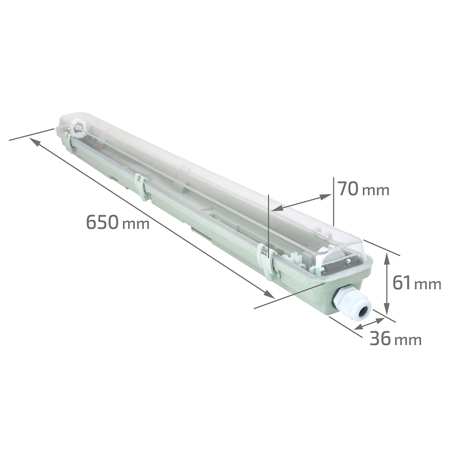 Dimensiunile corpului de iluminat ermetic sunt de 2x60 cm, ceea ce il face compact si versatil in aplicare. Lungimea de 664 mm este un standard popular care se potriveste cu majoritatea plafoanelor si structurilor standard. Inaltimea este de 58 mm, iar latimea de 111 mm.