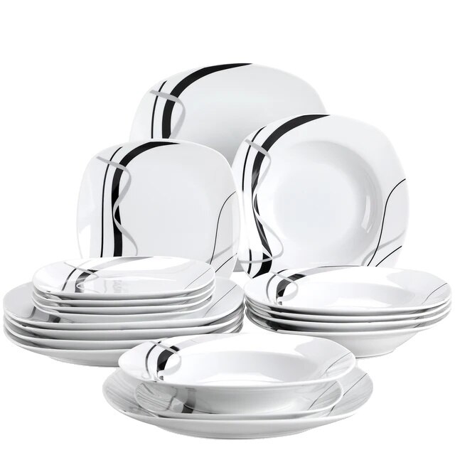 Set vesela de masa din portelan ceramic, design linii negre, 18 piese, rezistent la temperaturi inalte, negru, 9.75"x8.5"x7.5"
