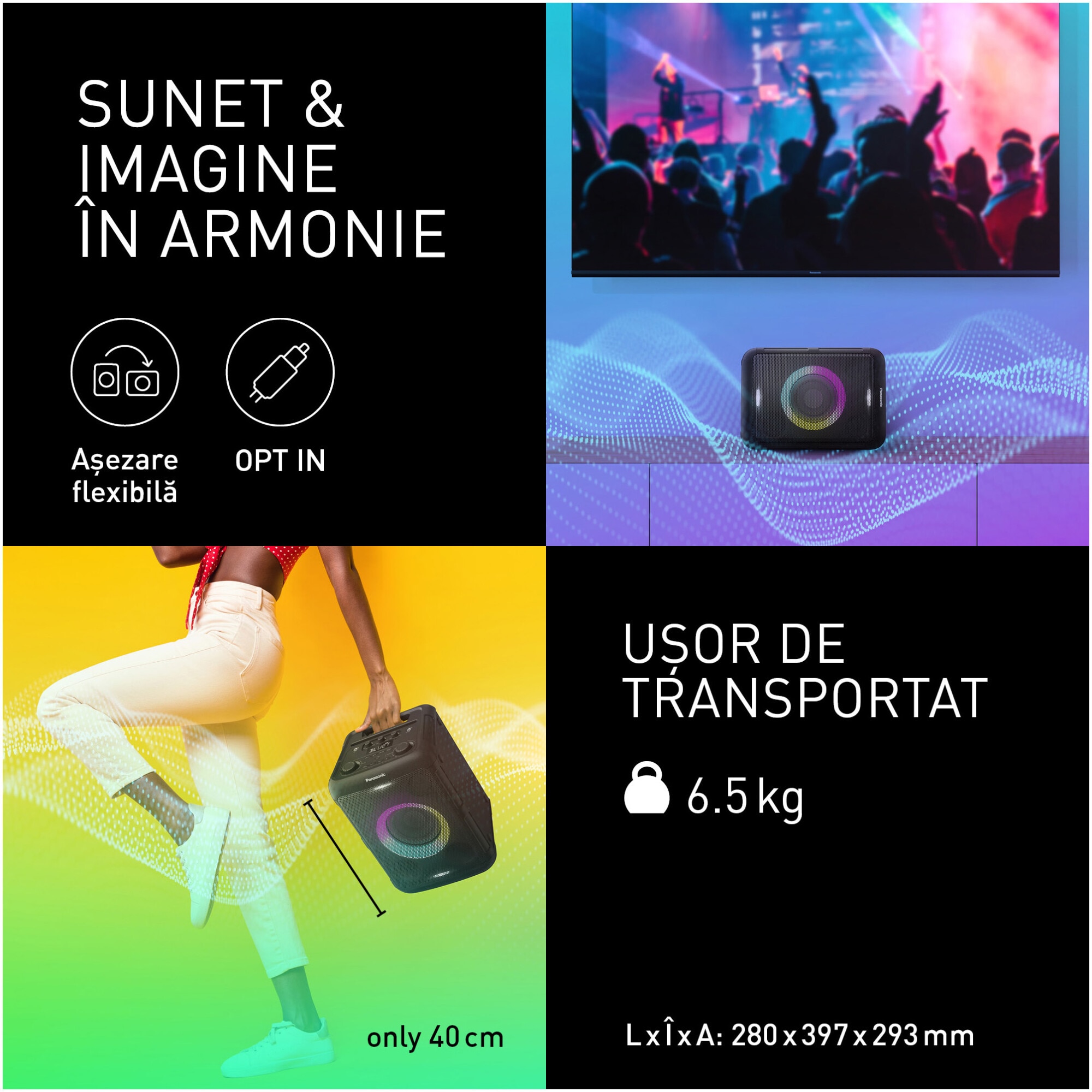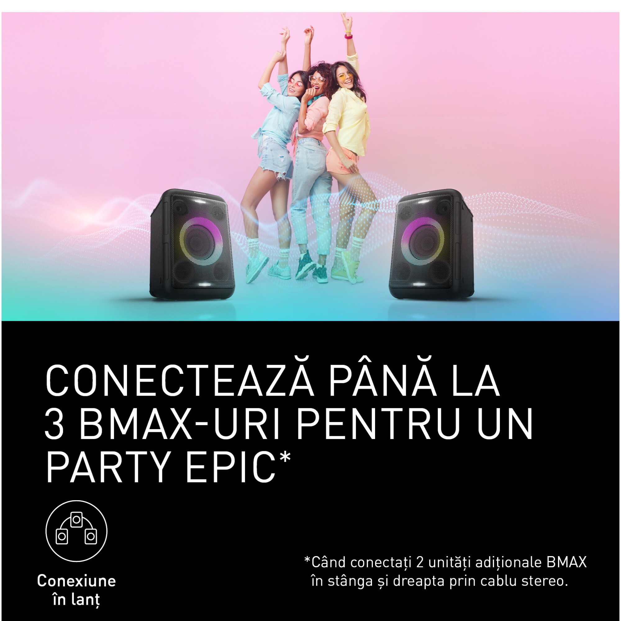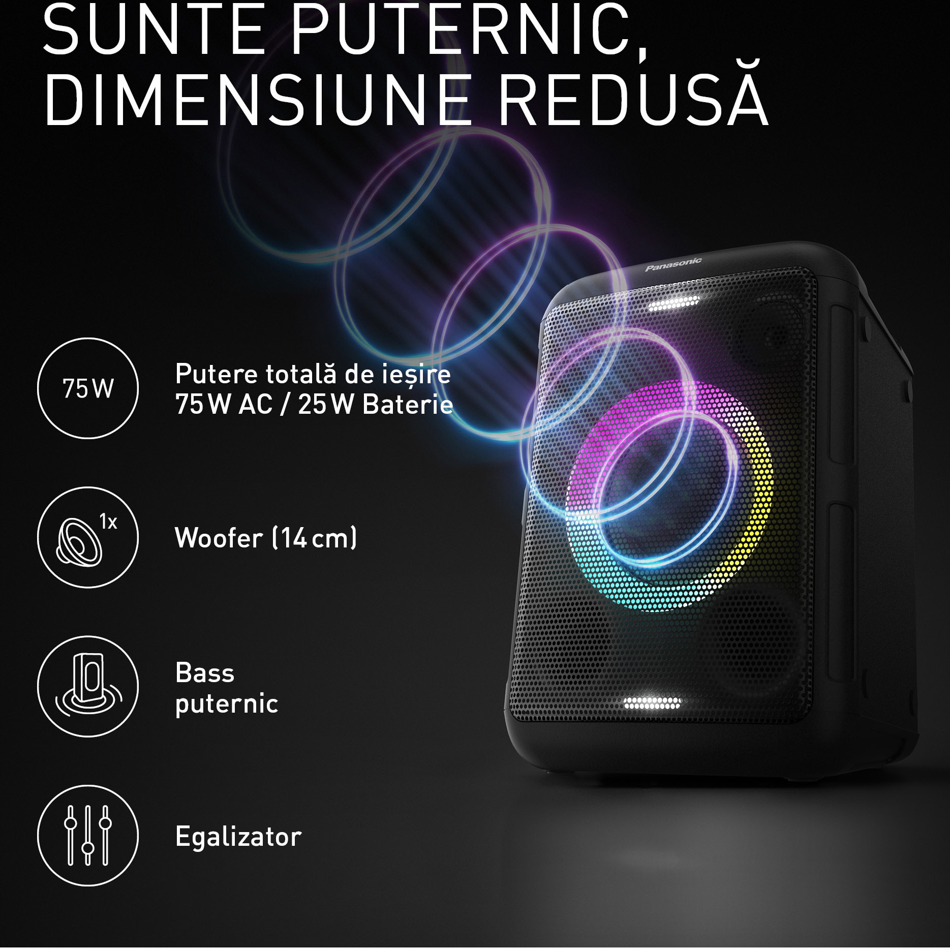 Sistem audio portabil Panasonic SC-BMAX5E-K, 75W, Bluetooth, Multi-point, Autonomie 9 ore, Karaoke, USB, AUX, Negru