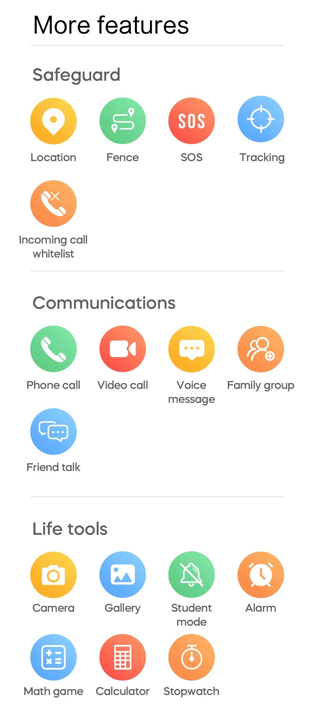 | Functii | Microfon incorporat Touchscreen Convorbire bi-directionala Music Control Alerta mesaj SOS Localizare GPS + LBS + Foto |