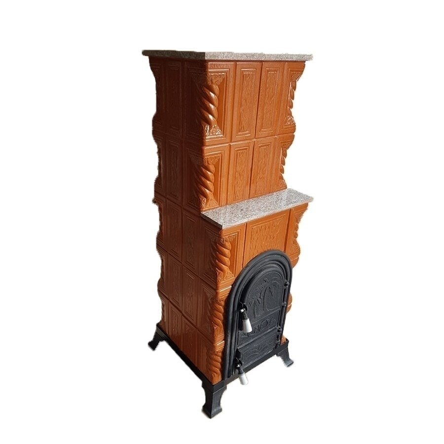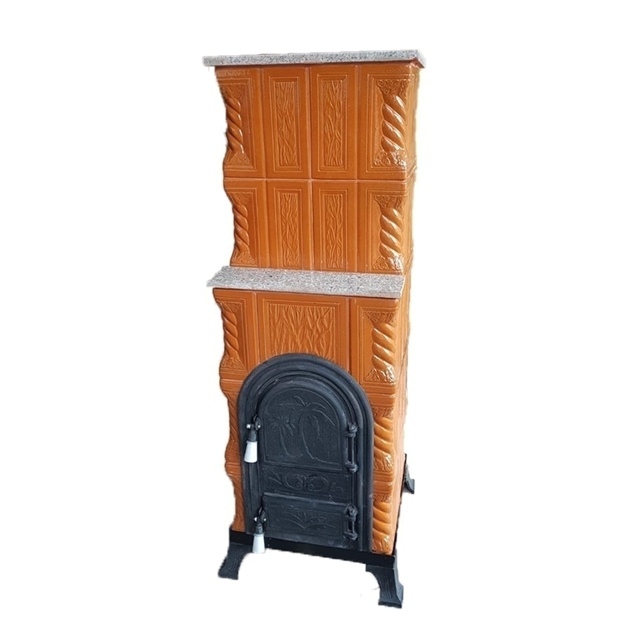 Soba teracota, Gospodarul, turn 5 randuri, serie mica, usa semirotunda, picioare fonta, coniac, 140 cm x 46 cm x 46 cm