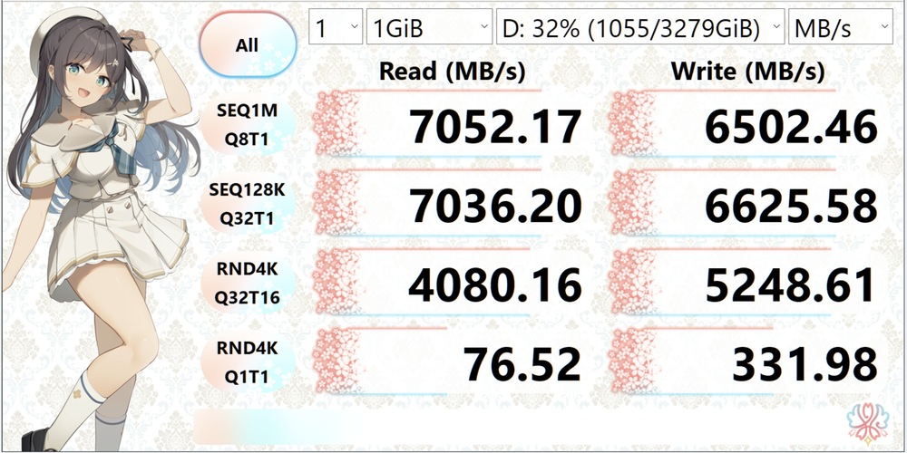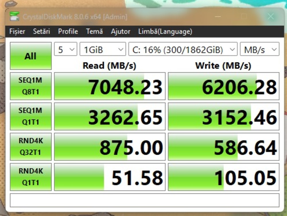 Testele în CrystalDiskMark pe un laptop ASUS ROG Zephyrus M16 (2023) au arătat valori oneste de peste 7000 MB/s la citire și peste 6600 MB/s la scriere. Dar, ATENȚIE, aceste rezultate au fost obținute doar după instalarea driverelor actualizate VMD de pe site-ul producătorului laptopului. Fără acestea, viteza a fost de câteva ori mai mică. De asemenea, performanța poate fi influențată de setările planului de alimentare al laptopului (de exemplu, după ieșirea din modul sleep), luați în considerare acest aspect.