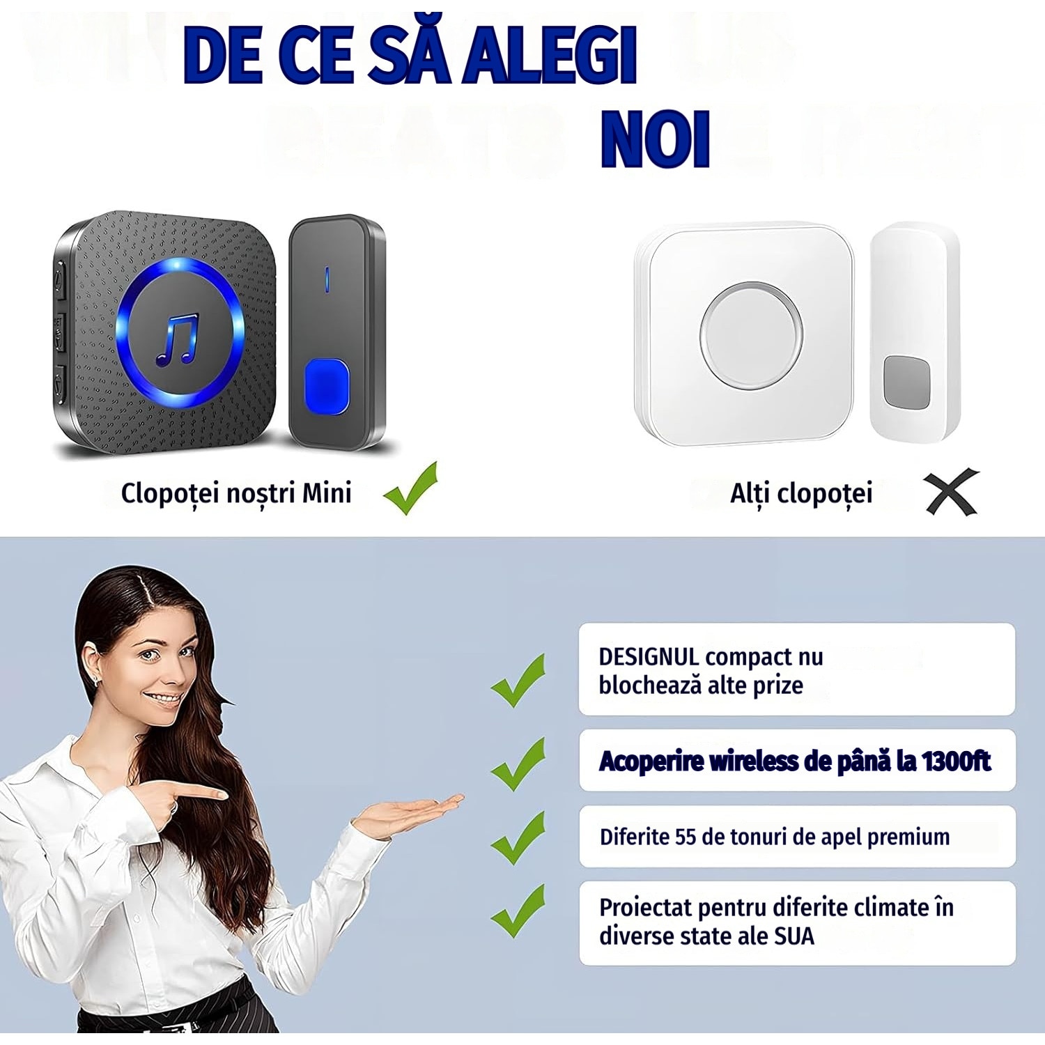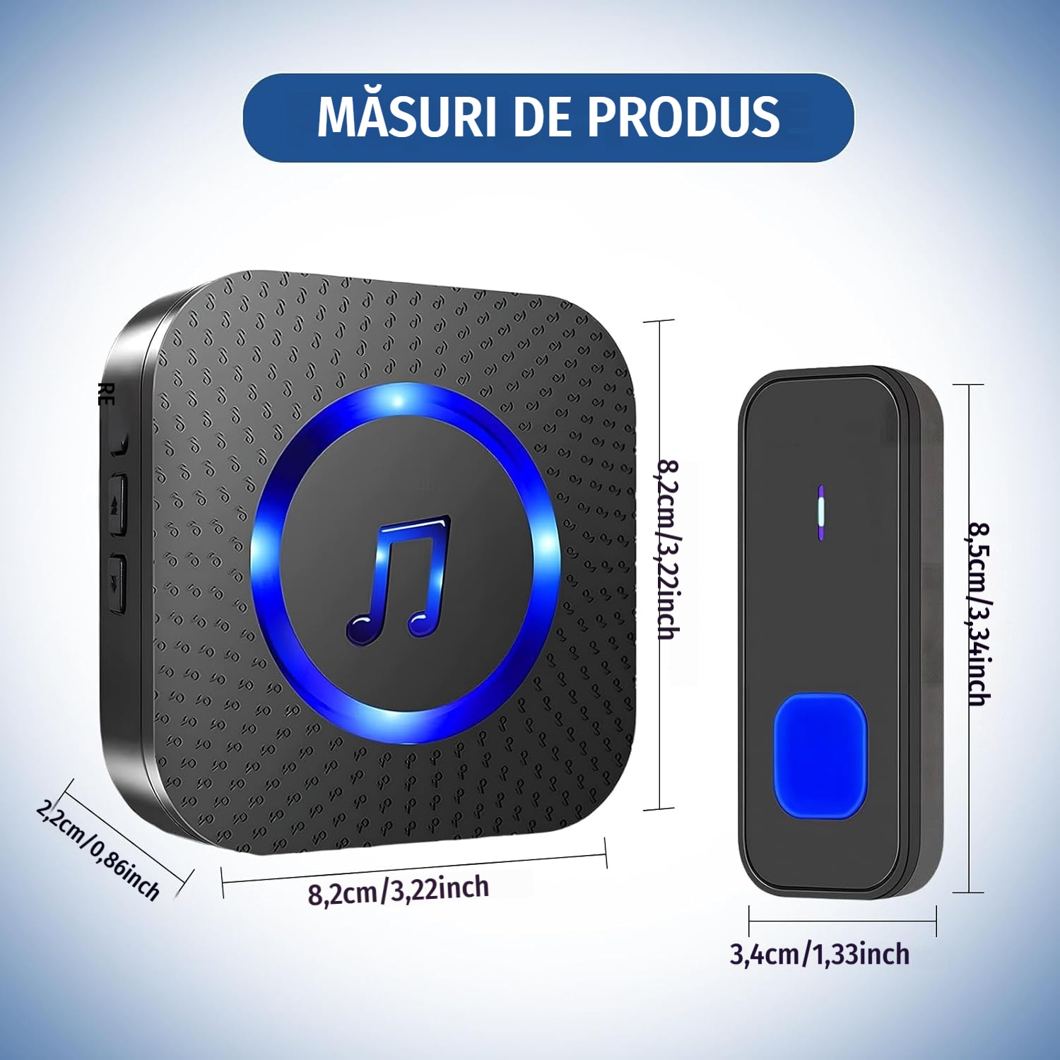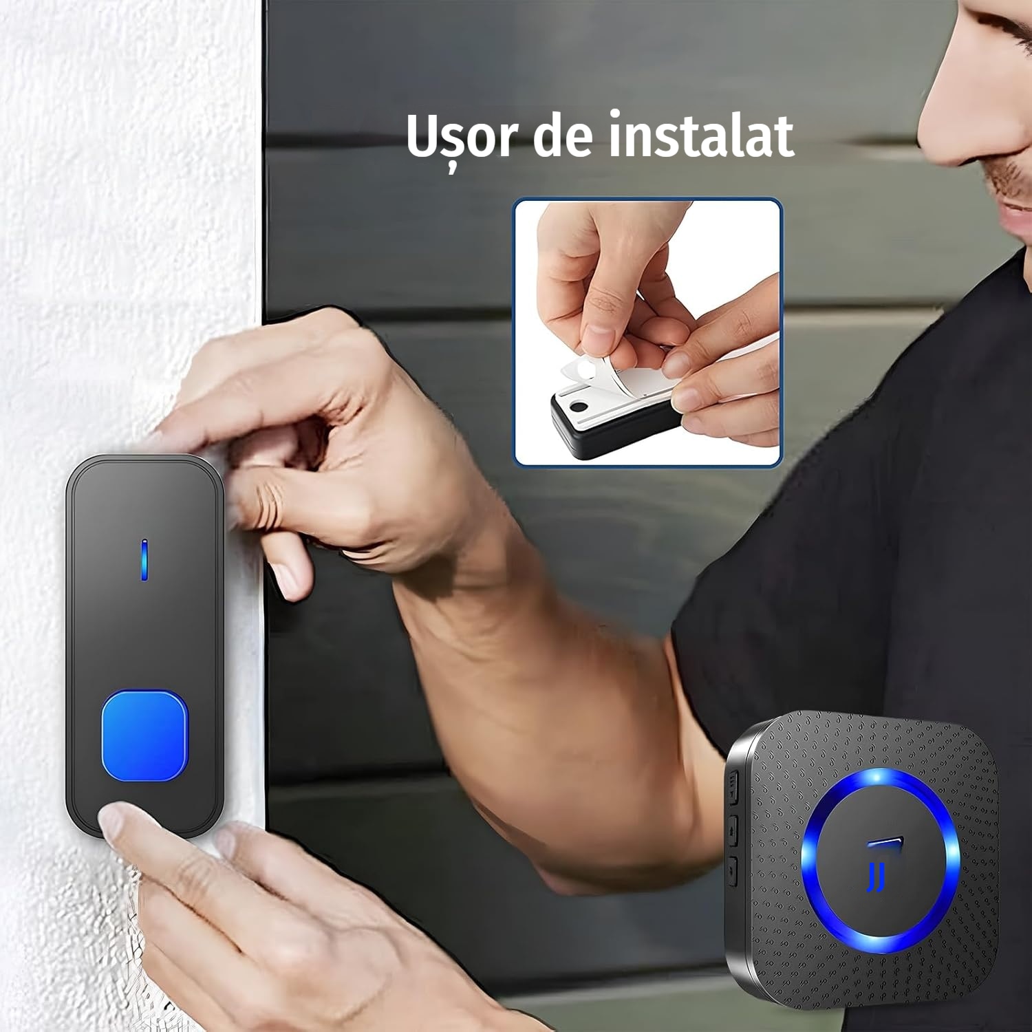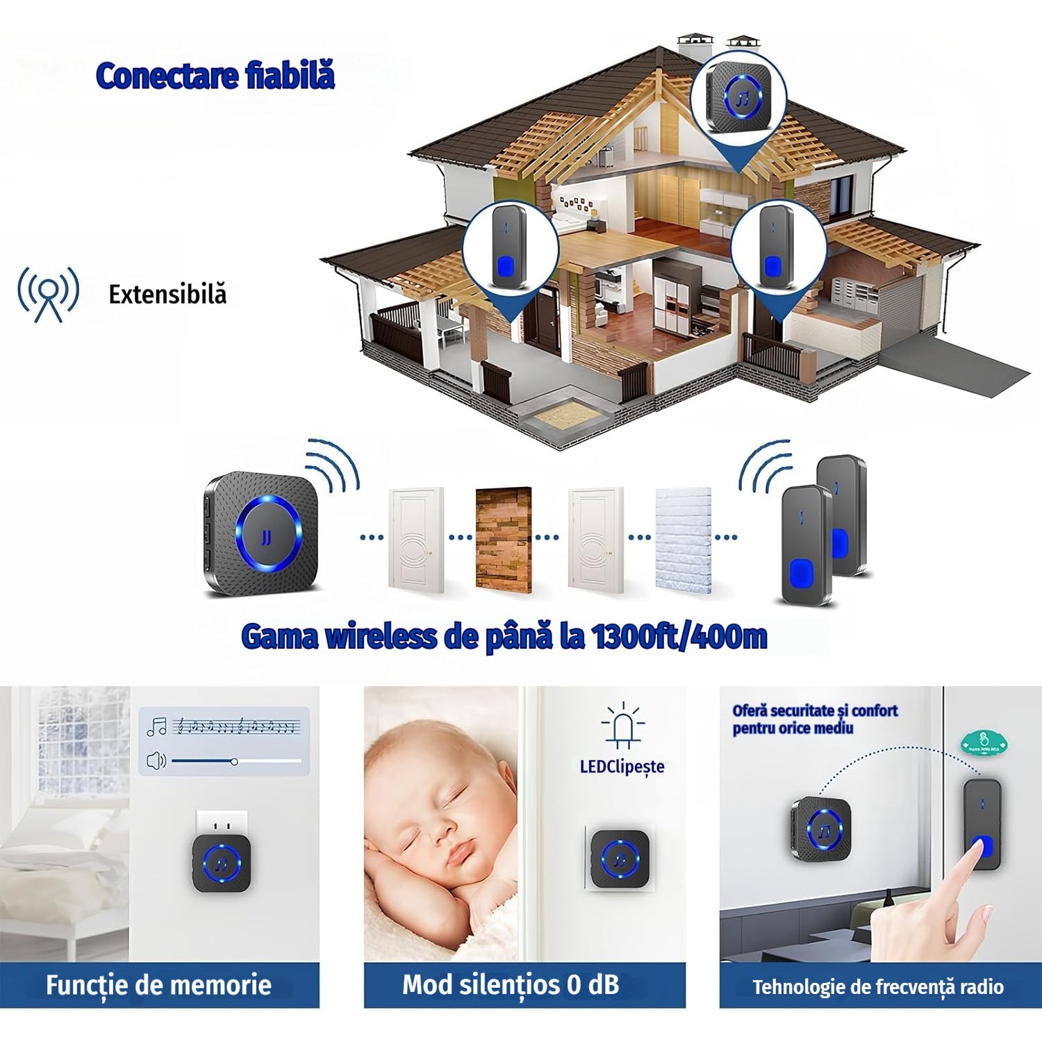 Sonerie Fara Fir Wireless, 400 m raza de actiune IP55, Rezistent La Apa, 5 niveluri de volum, 55 de melodii puternice, LED intermitent, ABS, negru