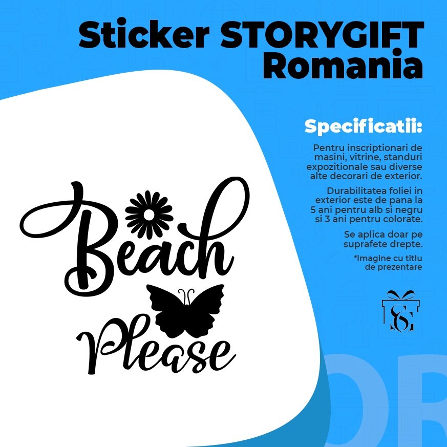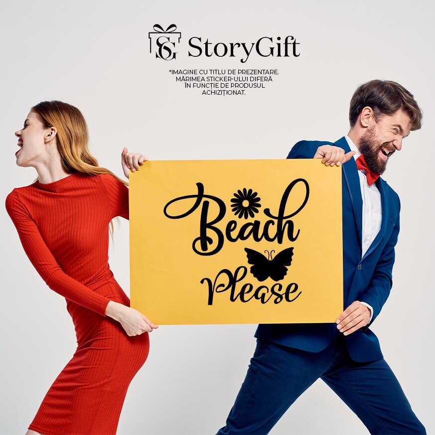 Sticker Exterior cu o floare si un fluture cu textul in engleza "Beach, please" - mai scuteste-ma plaja, Vinyl Negru, 90 cm
