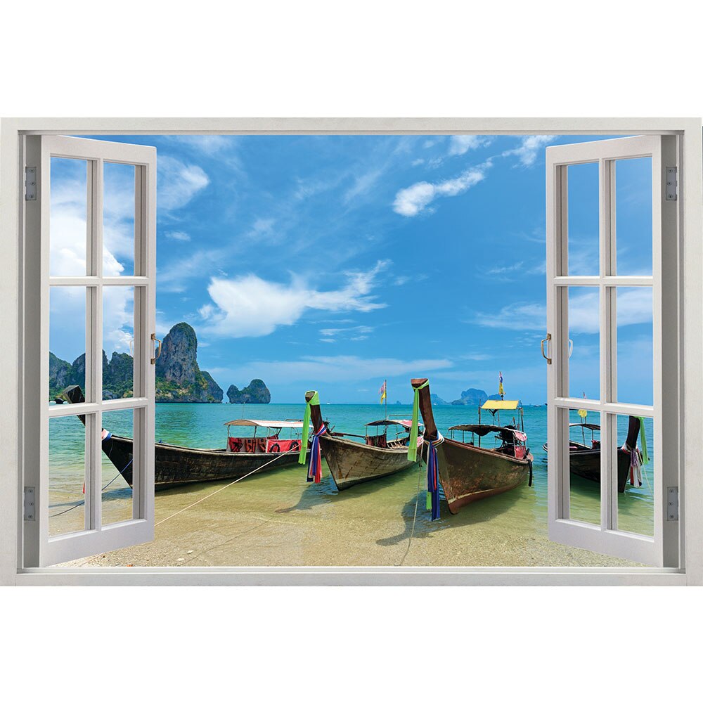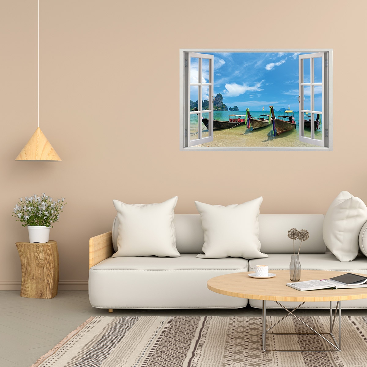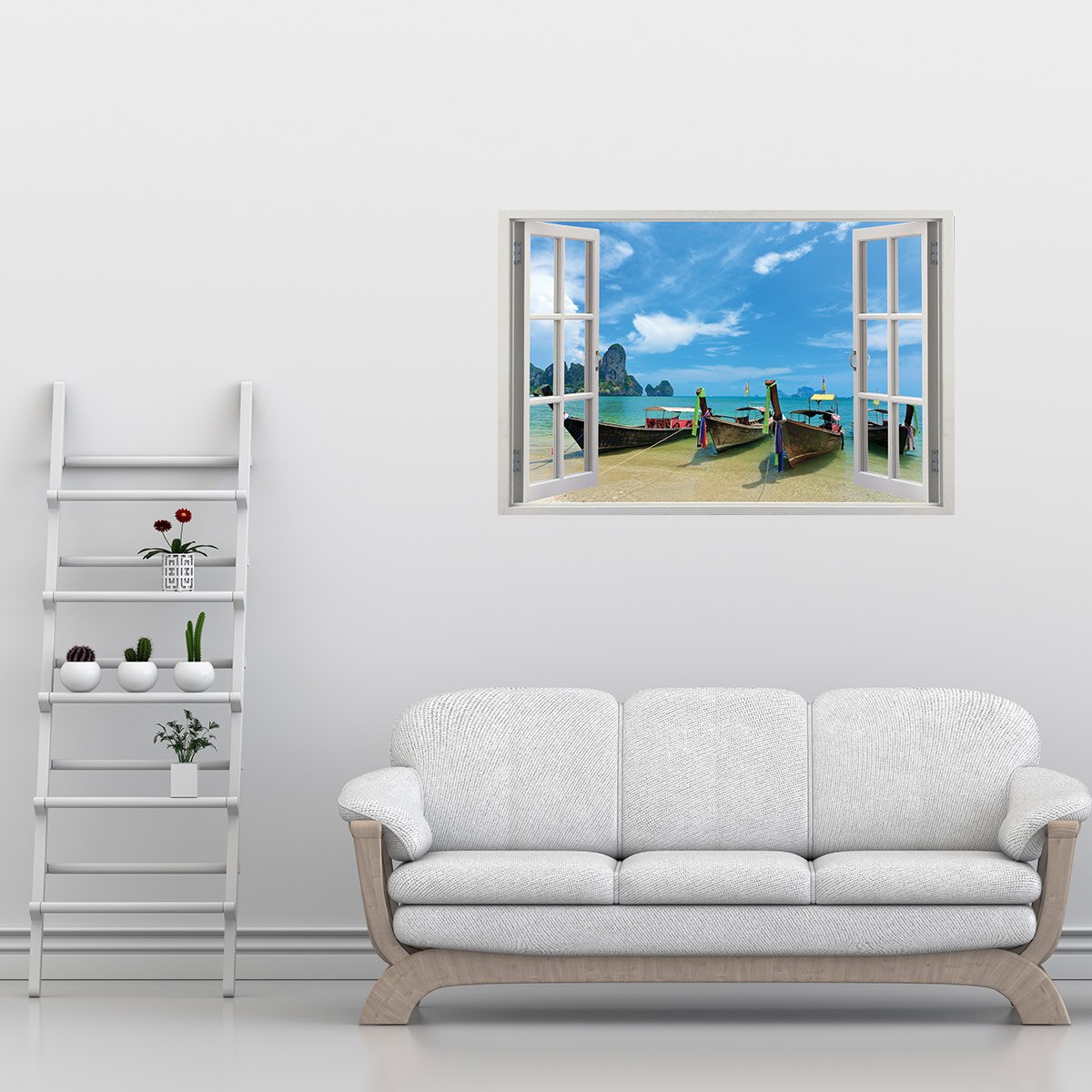 Sticker Fereastra 3D, Stickermania, Peisaj cu barci la malul marii, 90x130 cm