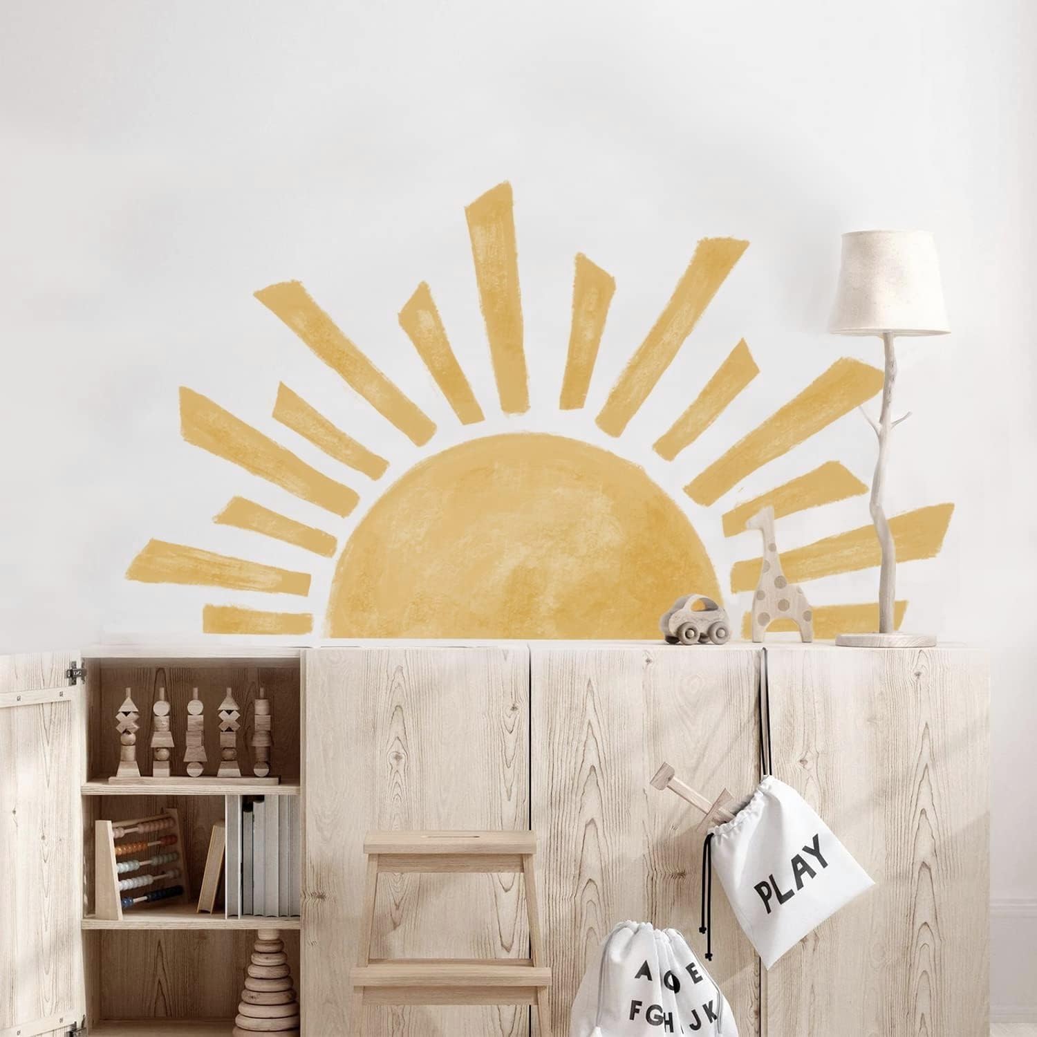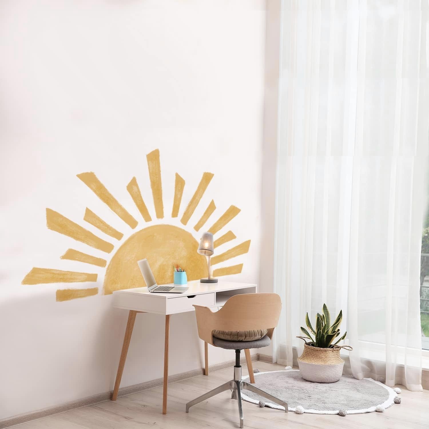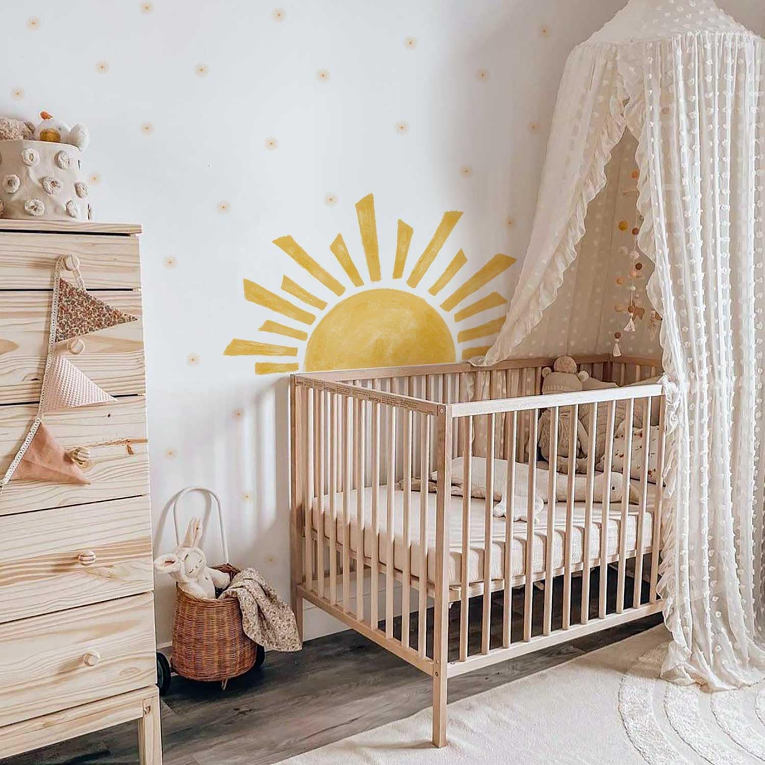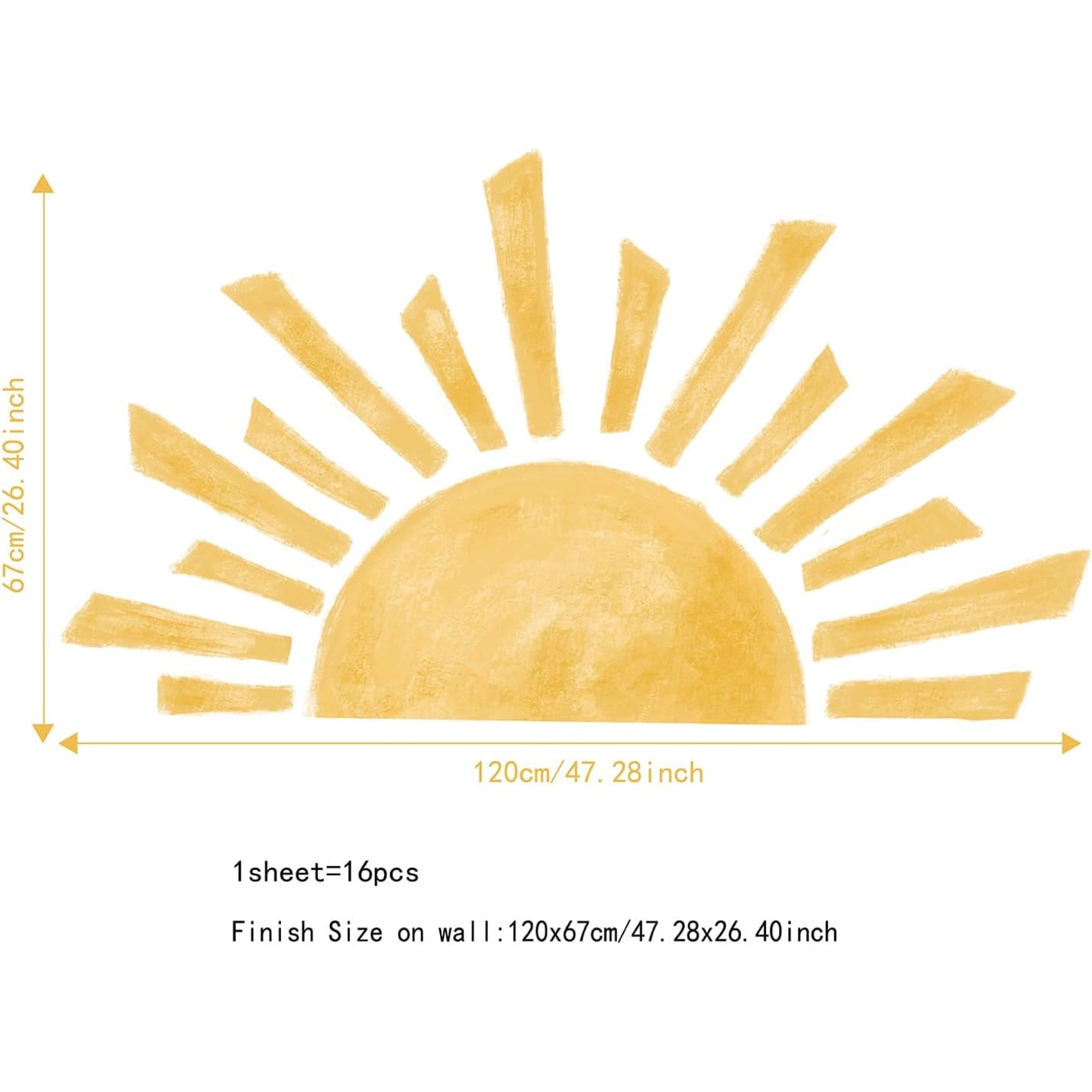 Sticker perete soare mare 120x67 cm cu 72 stele boho orange, autocolant autoadeziv usor de aplicat, pentru dormitor, camera copii, living, birou