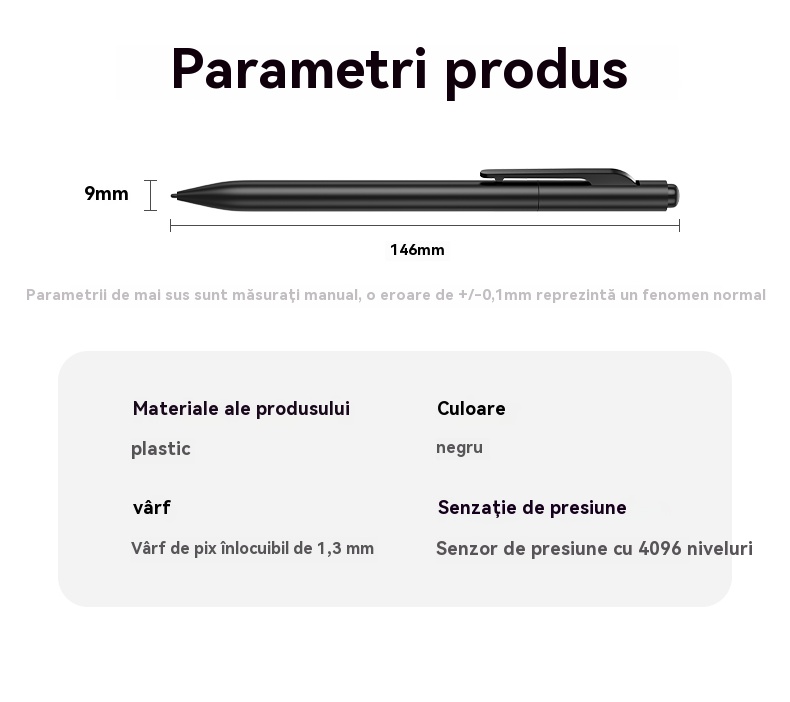 | Caracteristici speciale | Buton on/off Compatibila cu siteme Mac si iPad 1 x stylus pen Magnetic USB Tip C 3 x Varf de rezerva |
