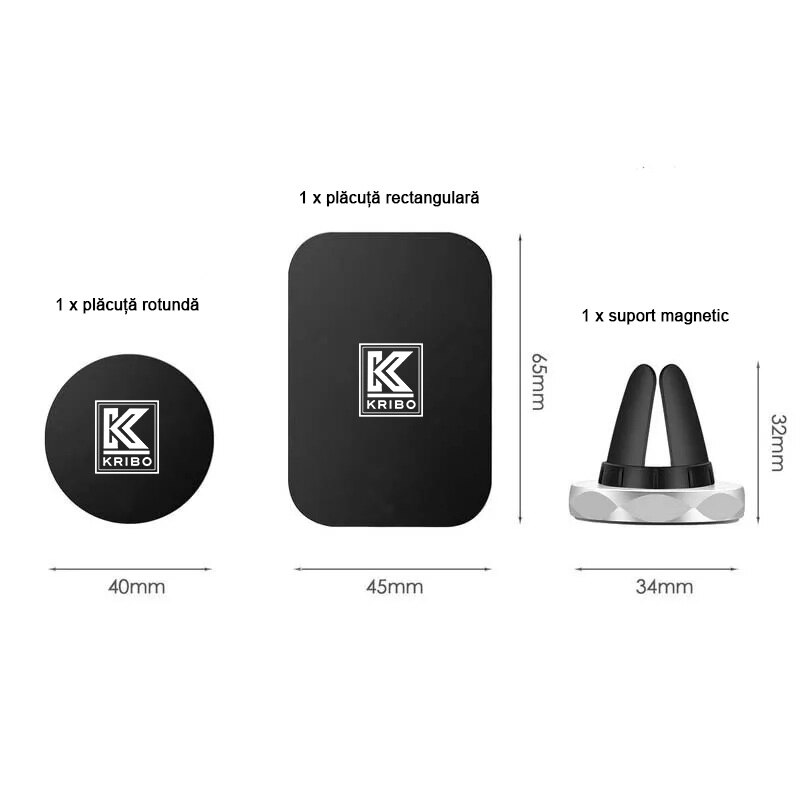 | Continut pachet | 1 x Placuta metalica rotunda 40 mm 1 x Suport auto magnetic 1 x Placuta metalica dreptunghiulara 45 x 65 mm |