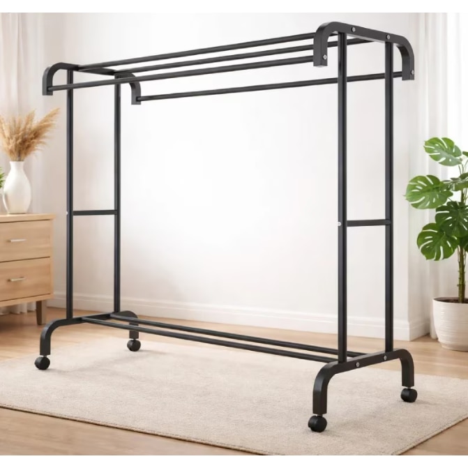 Acest suport haine cu bara dubla reprezinta o alternativa practica la dulapul clasic, fiind ideal pentru dressinguri deschise sau spatii mici unde este necesara optimizarea locului disponibil.