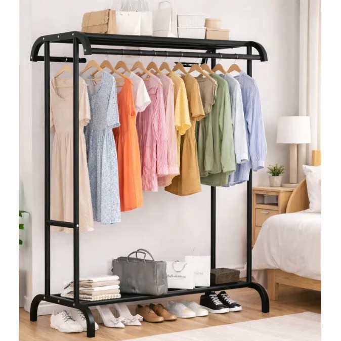 Suport haine metalic cu bara dubla si rafturi – organizare eficienta pentru dormitor, dressing sau magazin