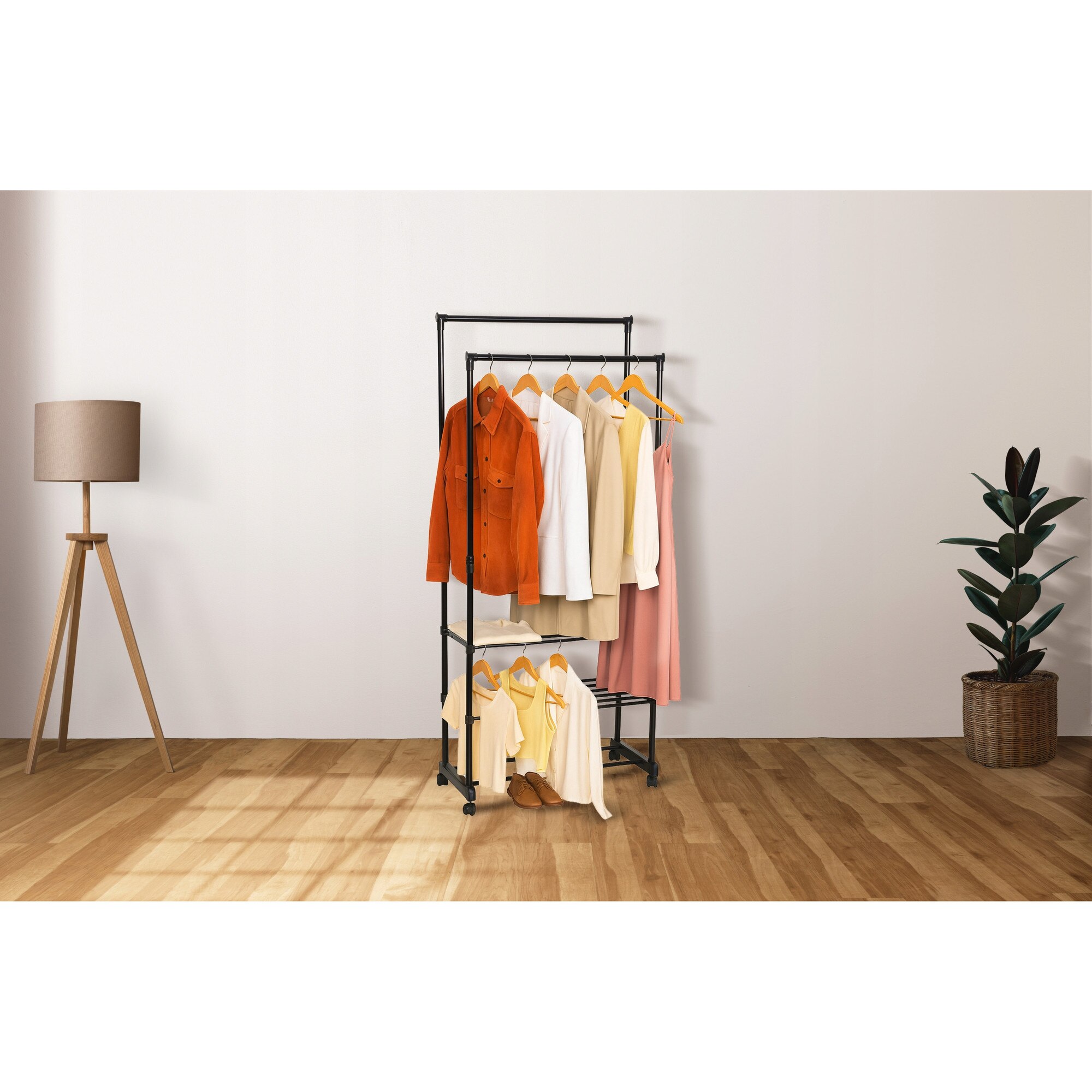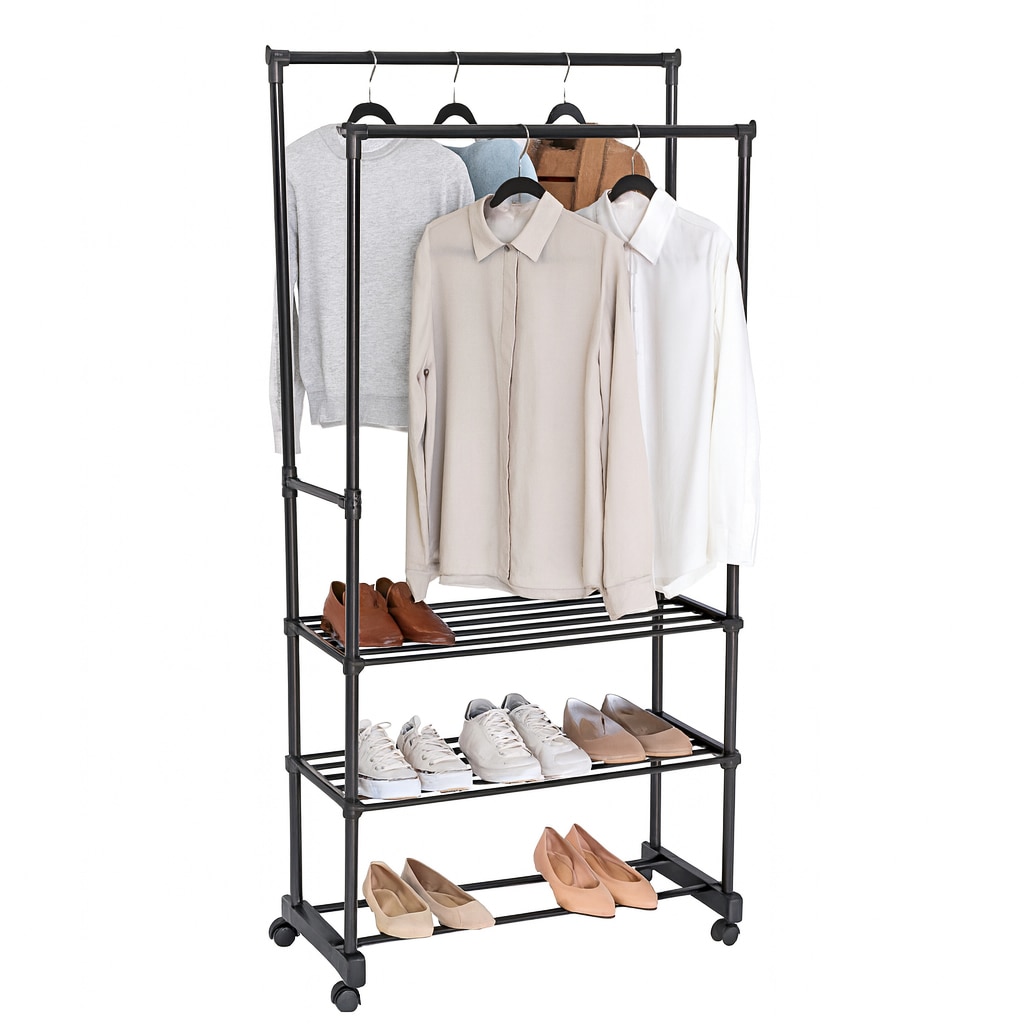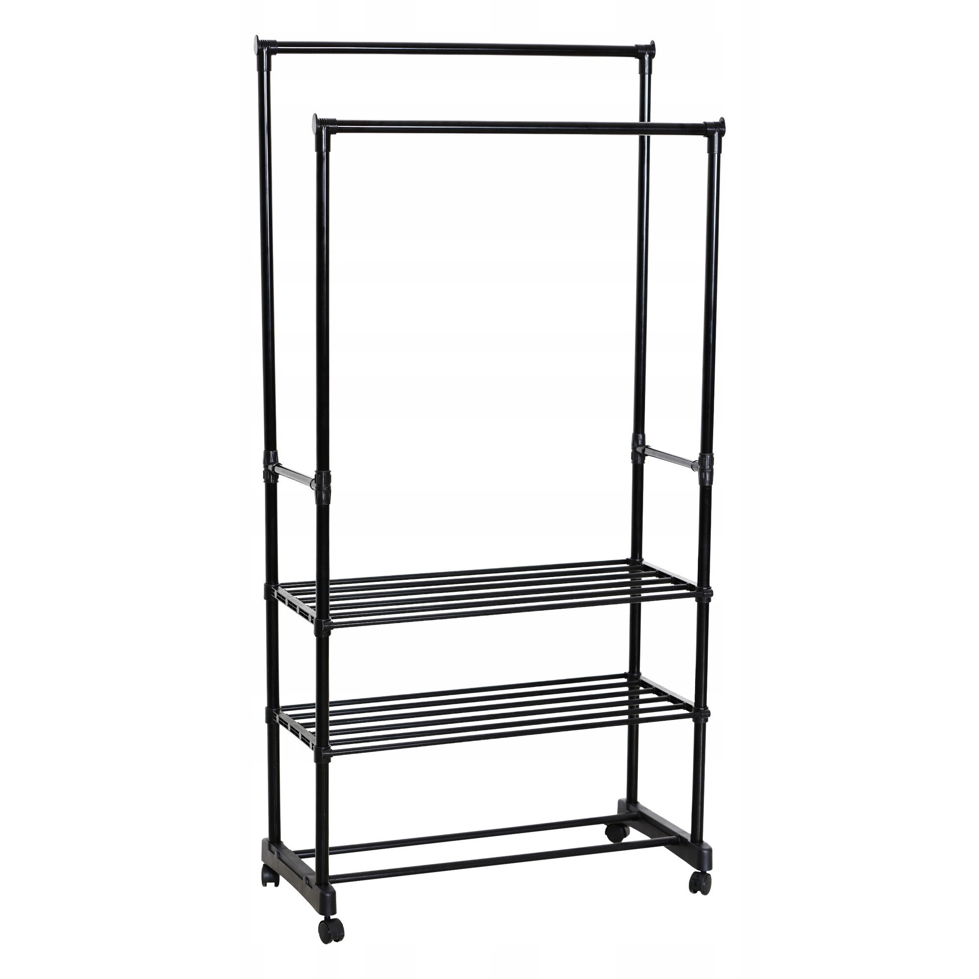 Suport pentru umerase si incaltaminte, Zola, 2 bari, 3 rafturi, 166 x 78 x 39 cm, negru