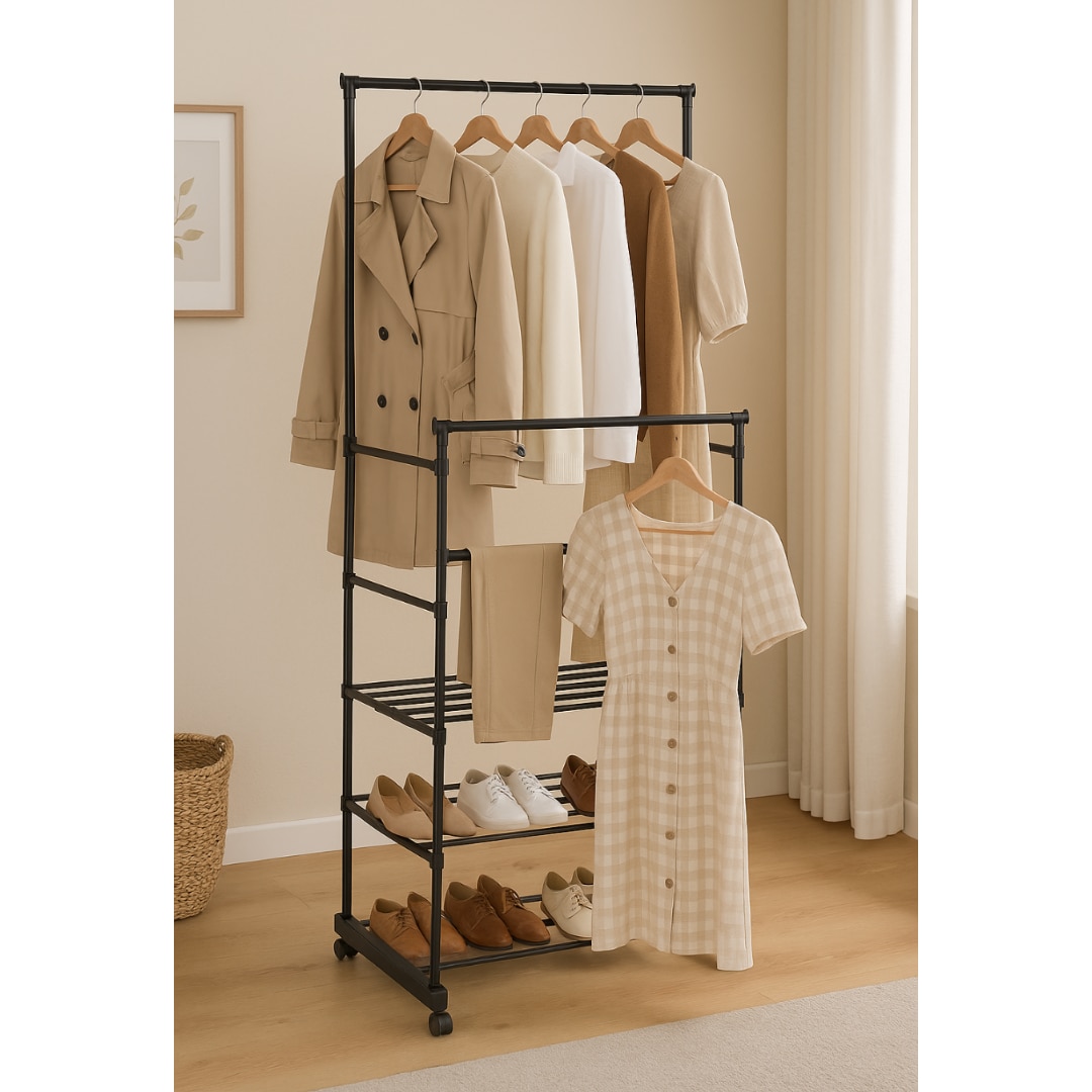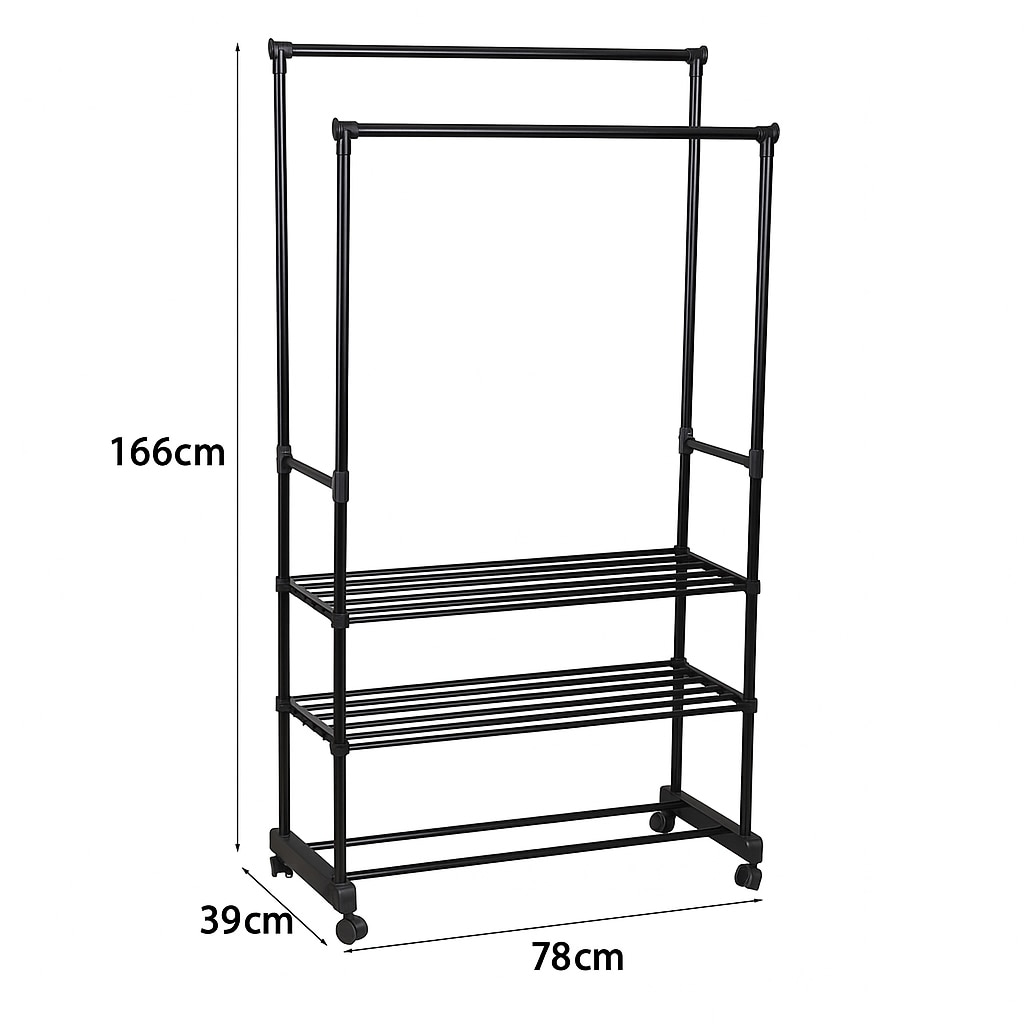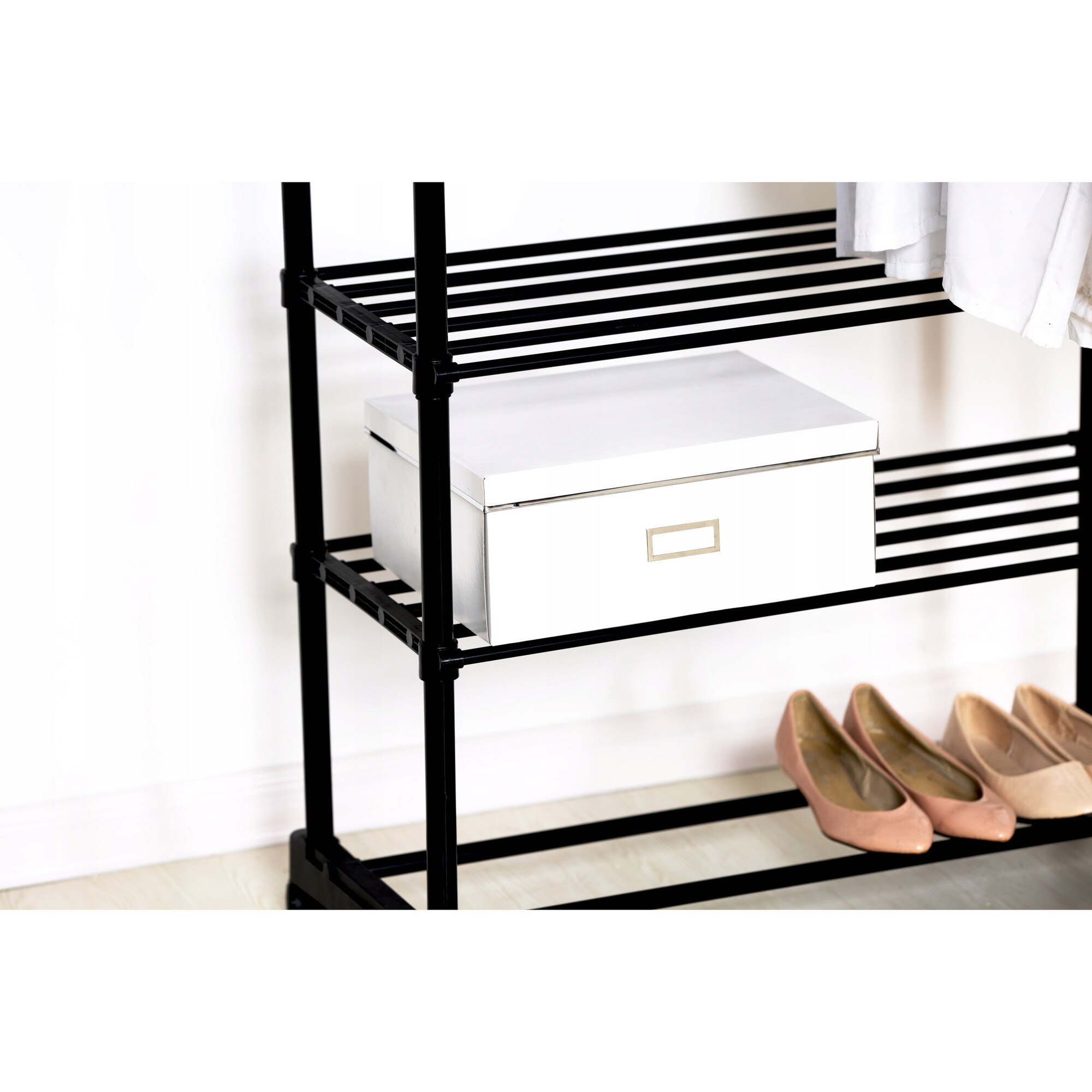 Suport pentru umerase si incaltaminte, Zola, 2 bari, 3 rafturi, 166 x 78 x 39 cm, negru