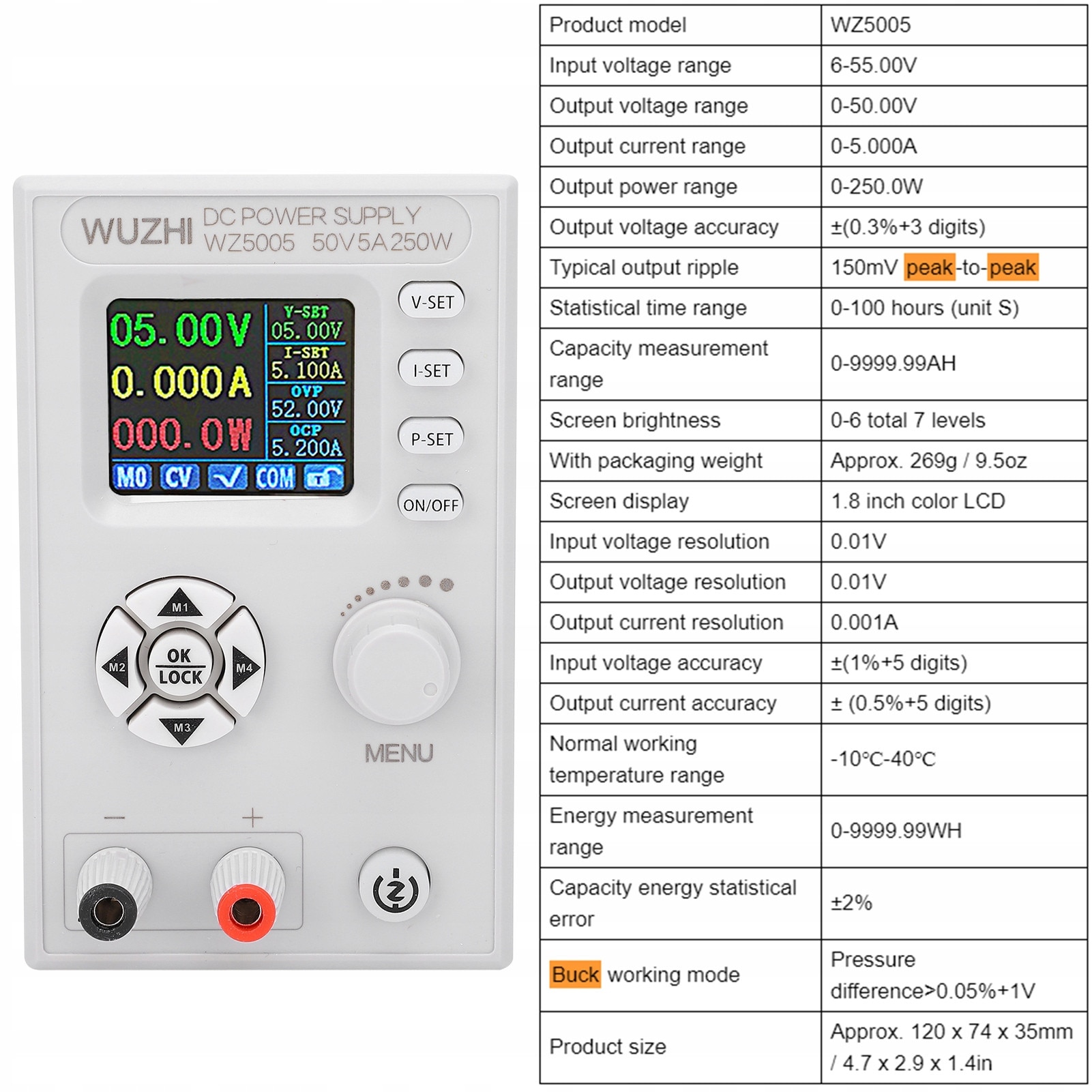Sursa de alimentare DC reglabila WZ5005, 0-50V, 0-5A, 250W, LCD 1,8 inch, 120x74x35mm