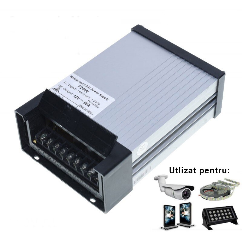 Sursa de Alimentare Slim Dalbi, 220V - 12V, 60A - 720W, Aluminiu, Fante de aerisire, 3 cai
