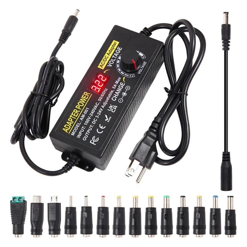 Sursa de alimentare universala reglabila 3-24 V, Rqiurpn, 120 W, 5A, Cu afisaj digital al tensiunii si 14 conectori, Convertor CA-CC, Negru