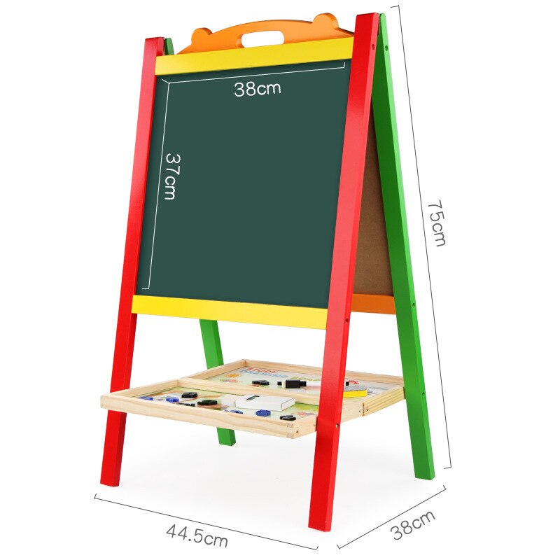 Tabla magnetica de scris si desenat multifunctionala cu 2 fete, 75 cm, marker, creta, cifre si litere magnetice, WOODEN WISDOM, Multicolor