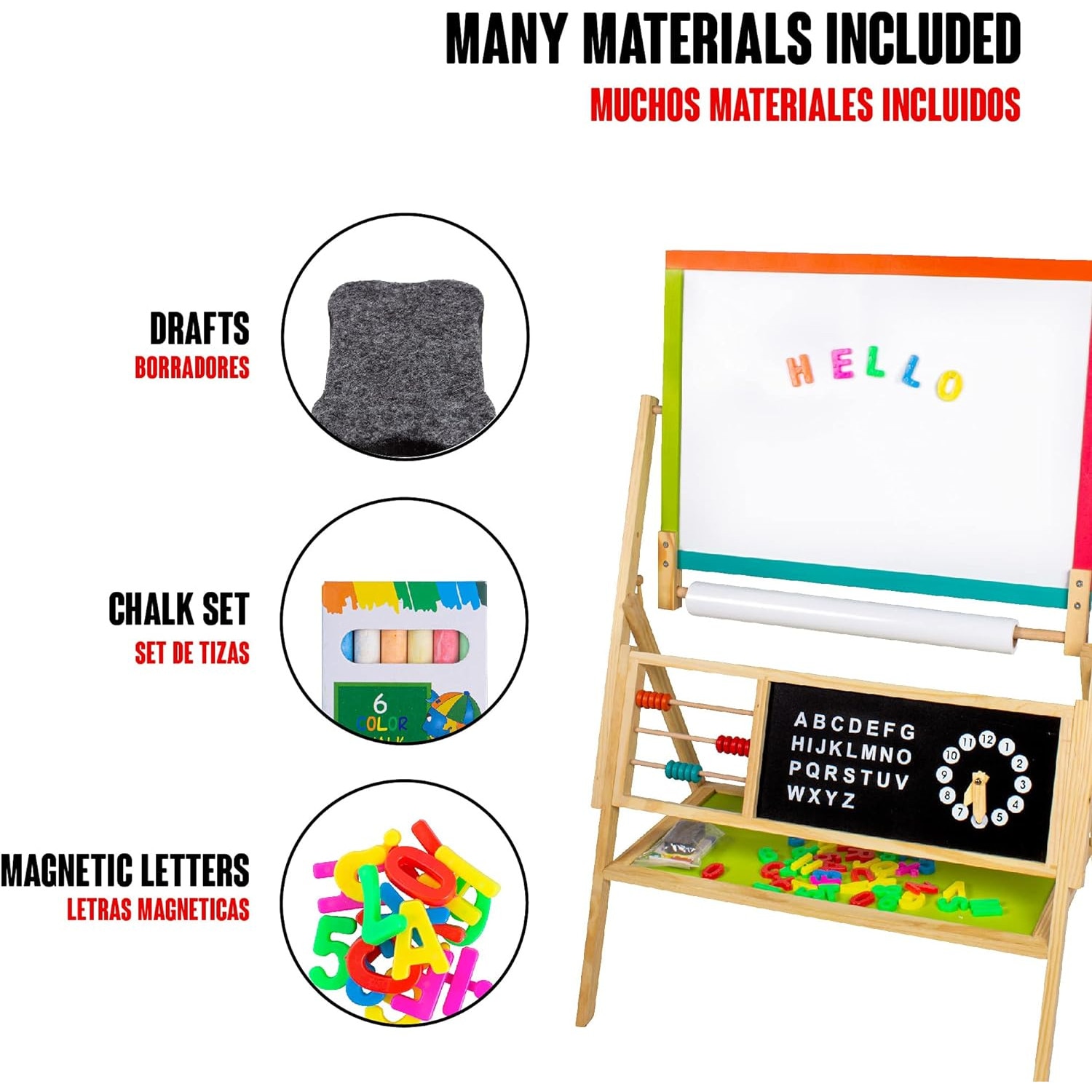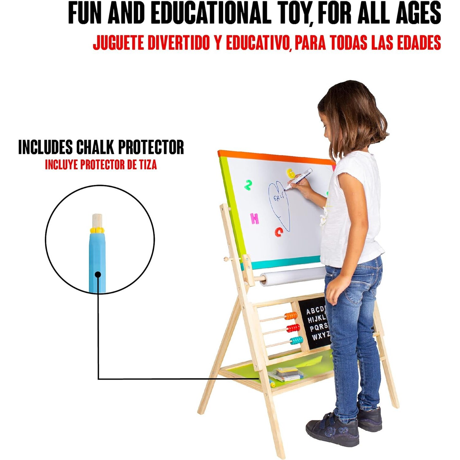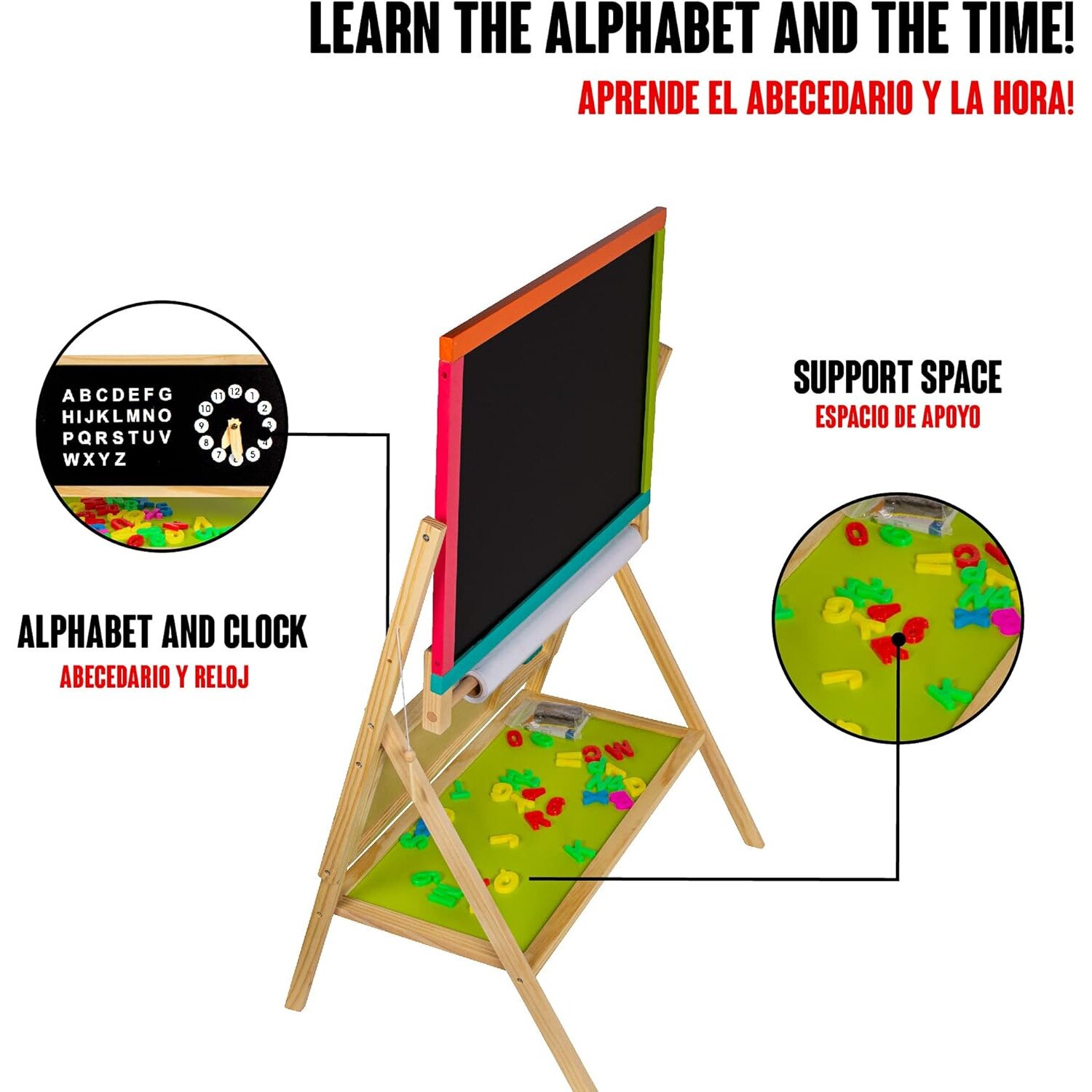 Tabla Magnetica Multifunctionala din Lemn 2 in 1 idealSTORE, Dimensiuni 64 x 50 x 96 cm, Include raft pentru depozitare accesoriilor Ceas pentru copii, Alfabet pentru invatarea literelor, Cifre Magnetice, Numaratoare, Creta Colorata, Marker, Hartie