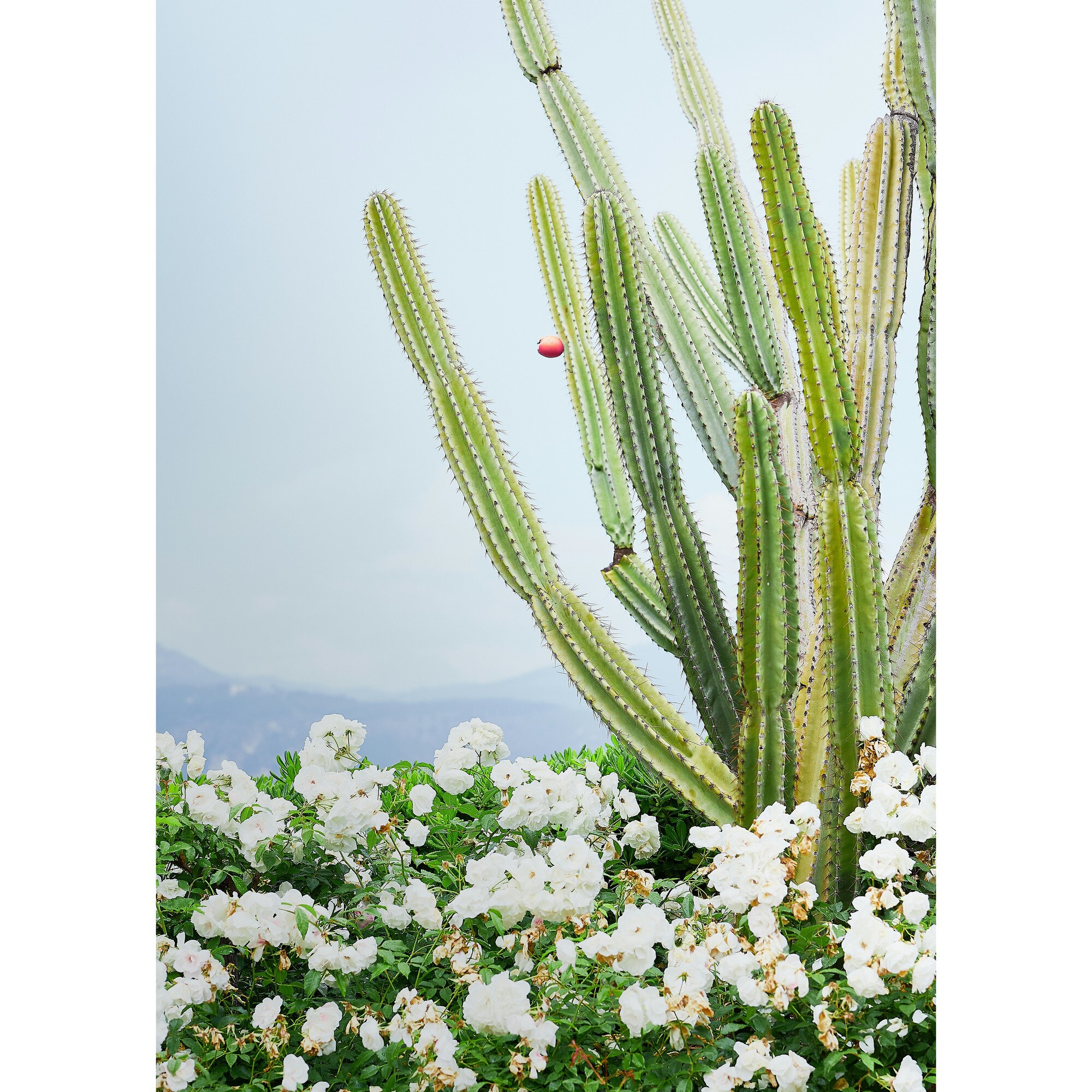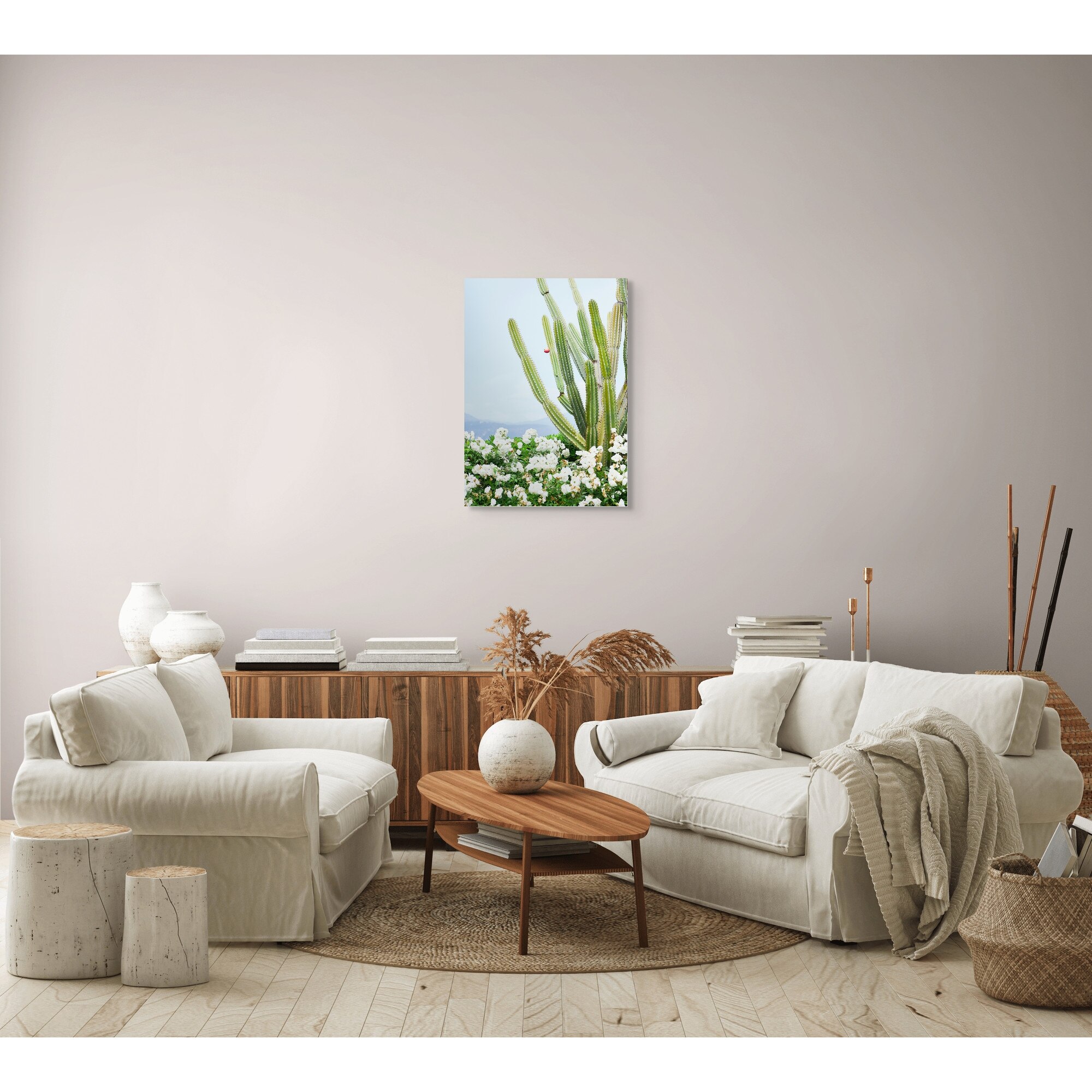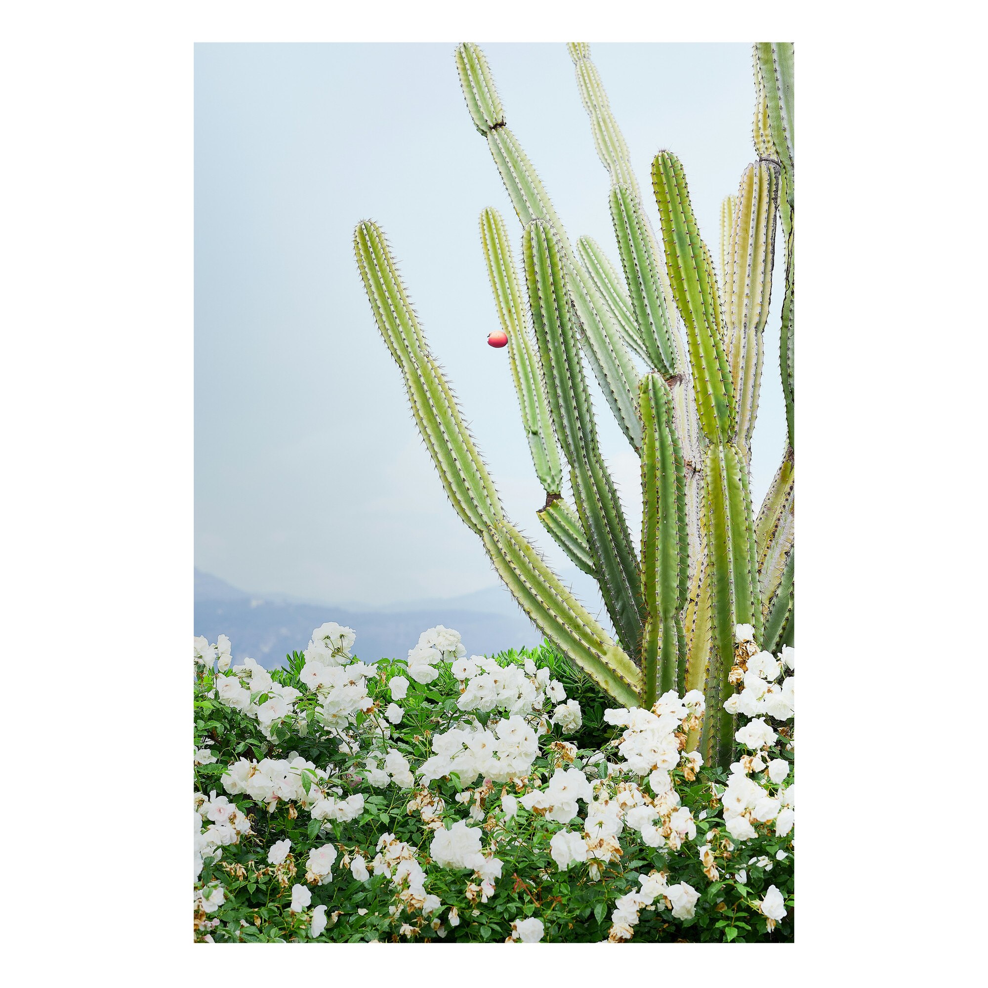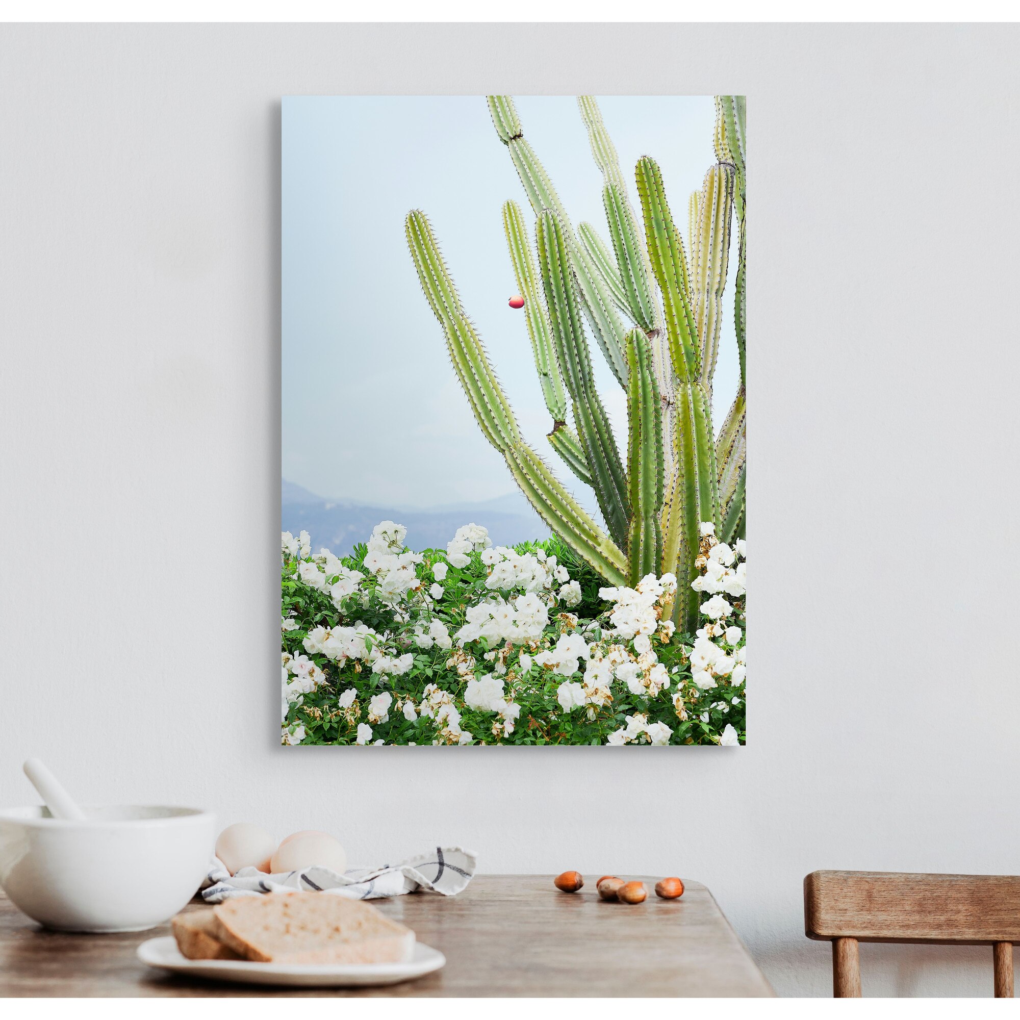 Tablou Canvas, "Cactusi si flori albe sub cer senin", Cactus, Flori, Cer, Verde, Alb, Peisaj, Plante, Natural., 50 x 70cm