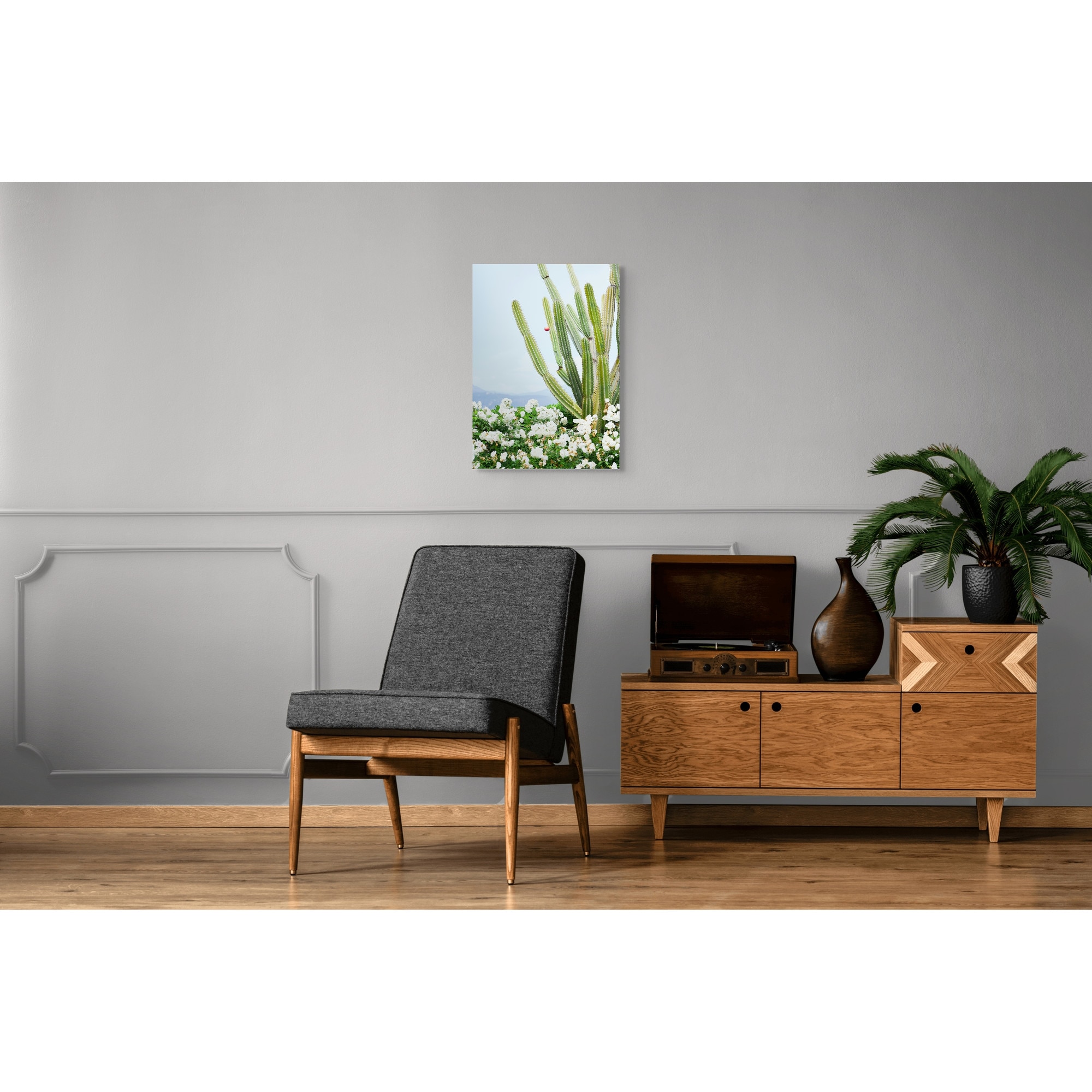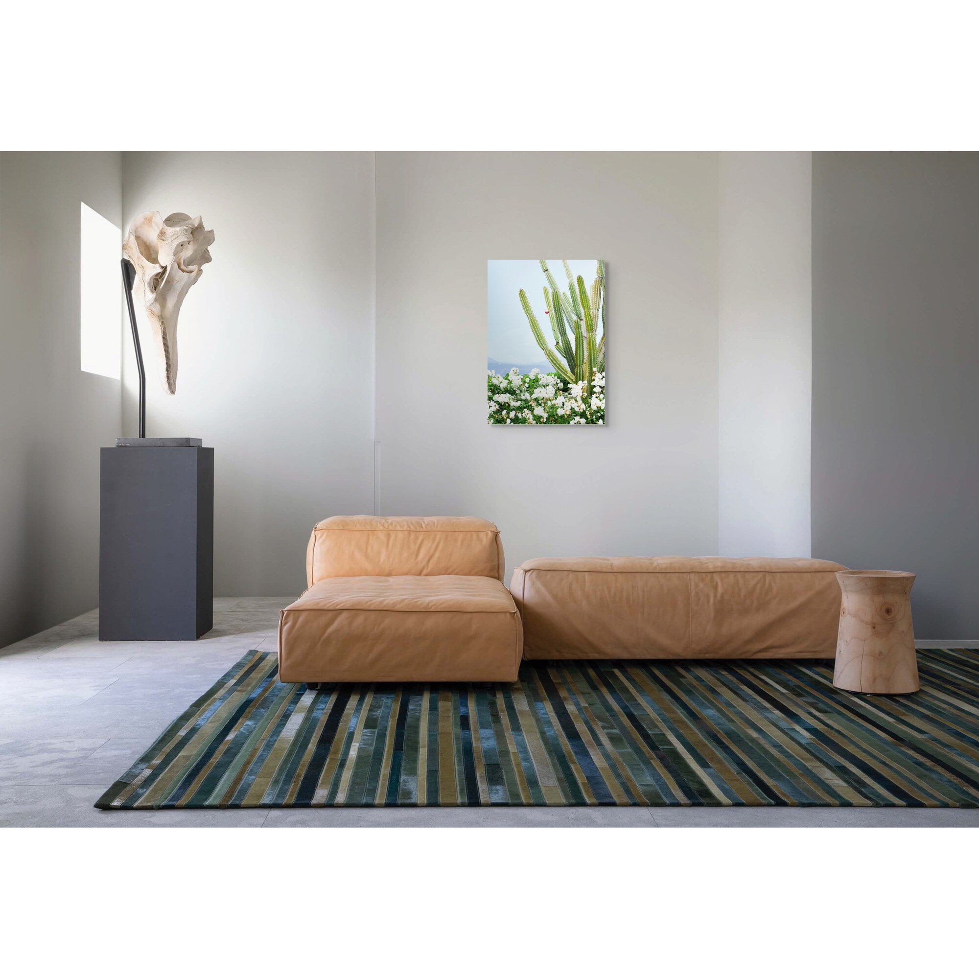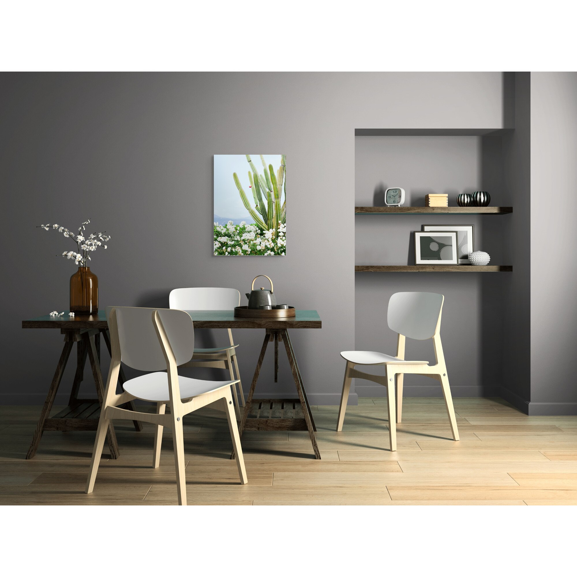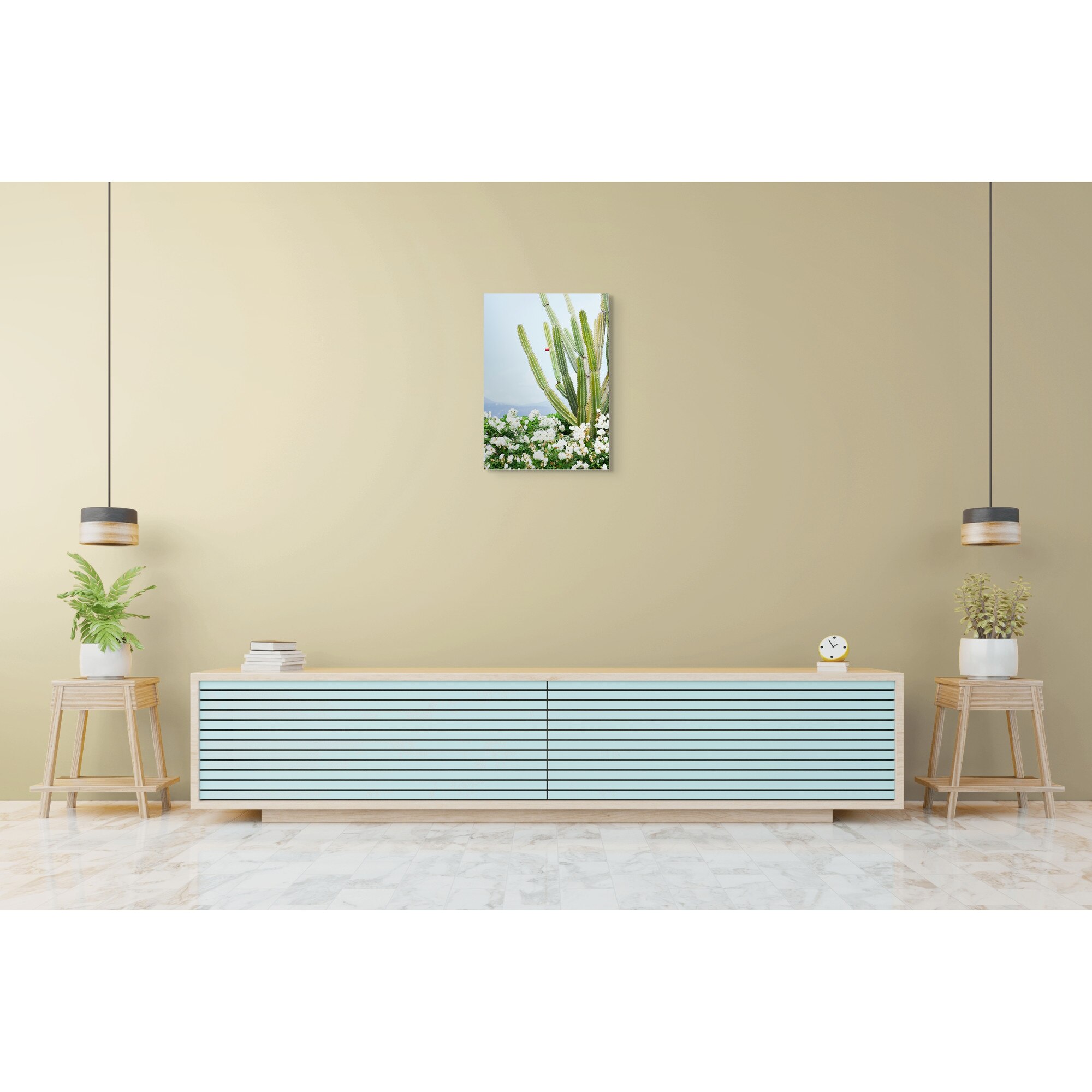 Tablou Canvas, "Cactusi si flori albe sub cer senin", Cactus, Flori, Cer, Verde, Alb, Peisaj, Plante, Natural., 50 x 70cm