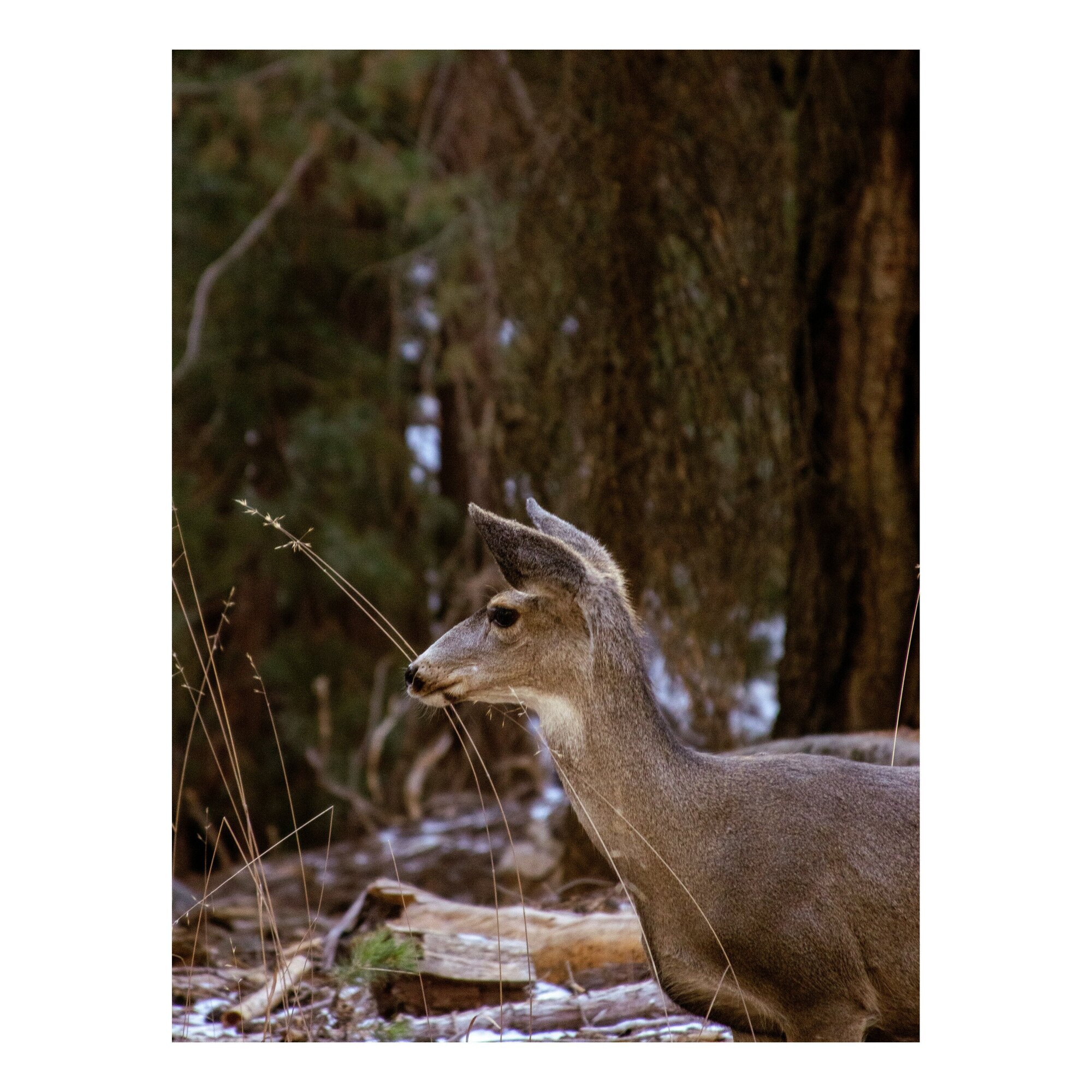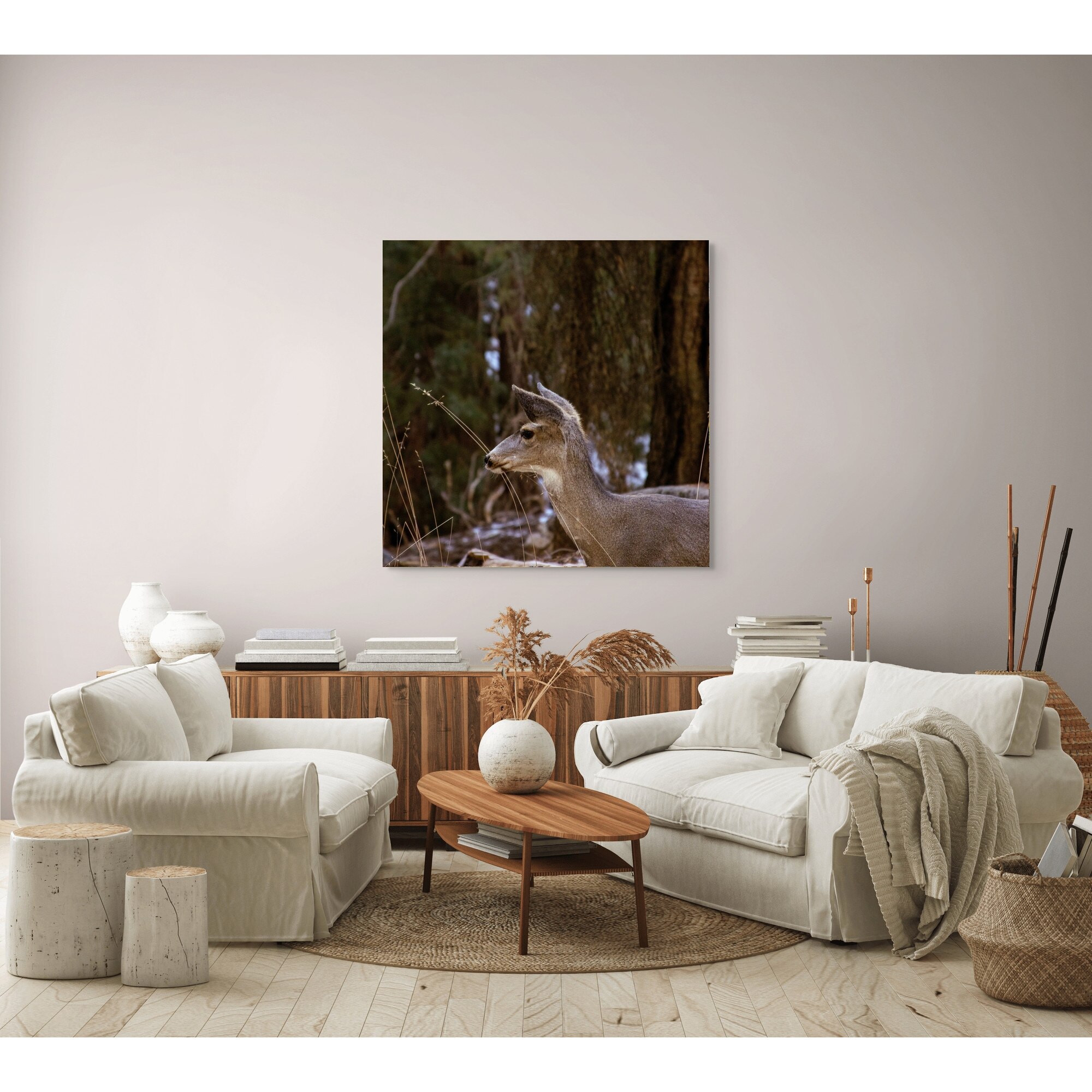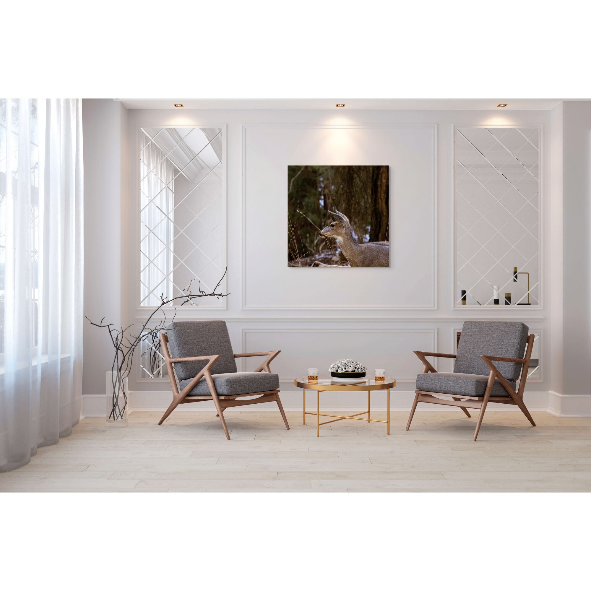 Tablou Canvas, "Caprioara printre copaci de iarna", Cerb, Padure, Natura, Blana, Vanatoare, Salbaticie, Pasnic, Tacut., 100 x 100cm