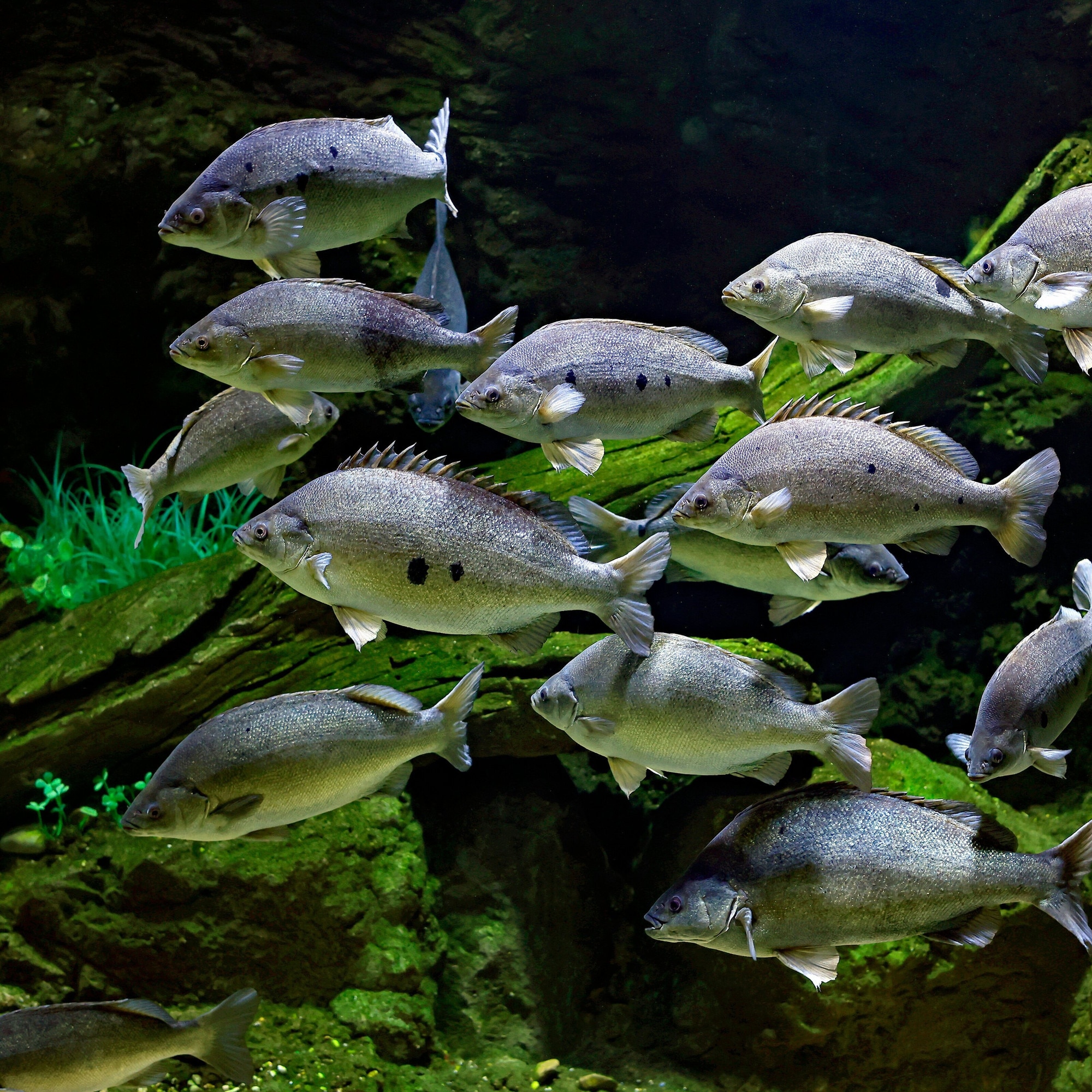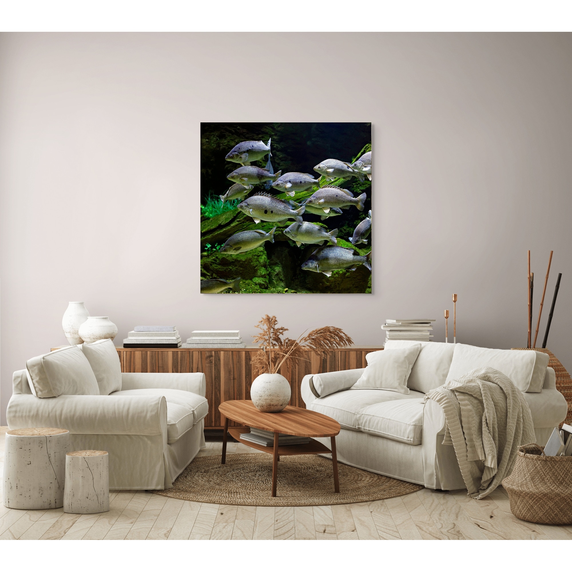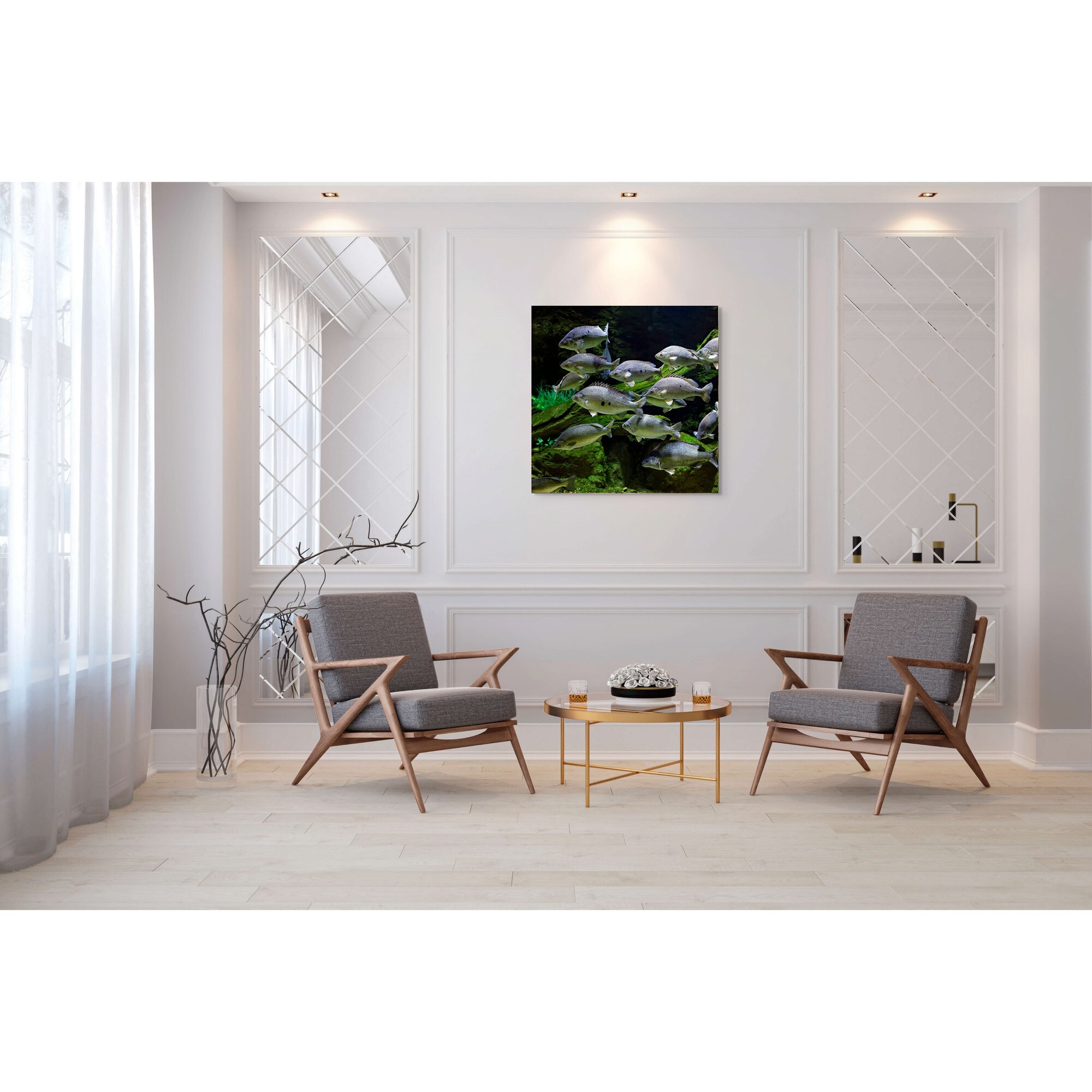 Tablou Canvas, "Dansul tacut al pestilor subacvatici", Pesti, Acvariu, Verdeata, Inot, Apei, Subacvatic, Vietuitoare, Mediu, Grup, Acvatic., 100 x 100cm