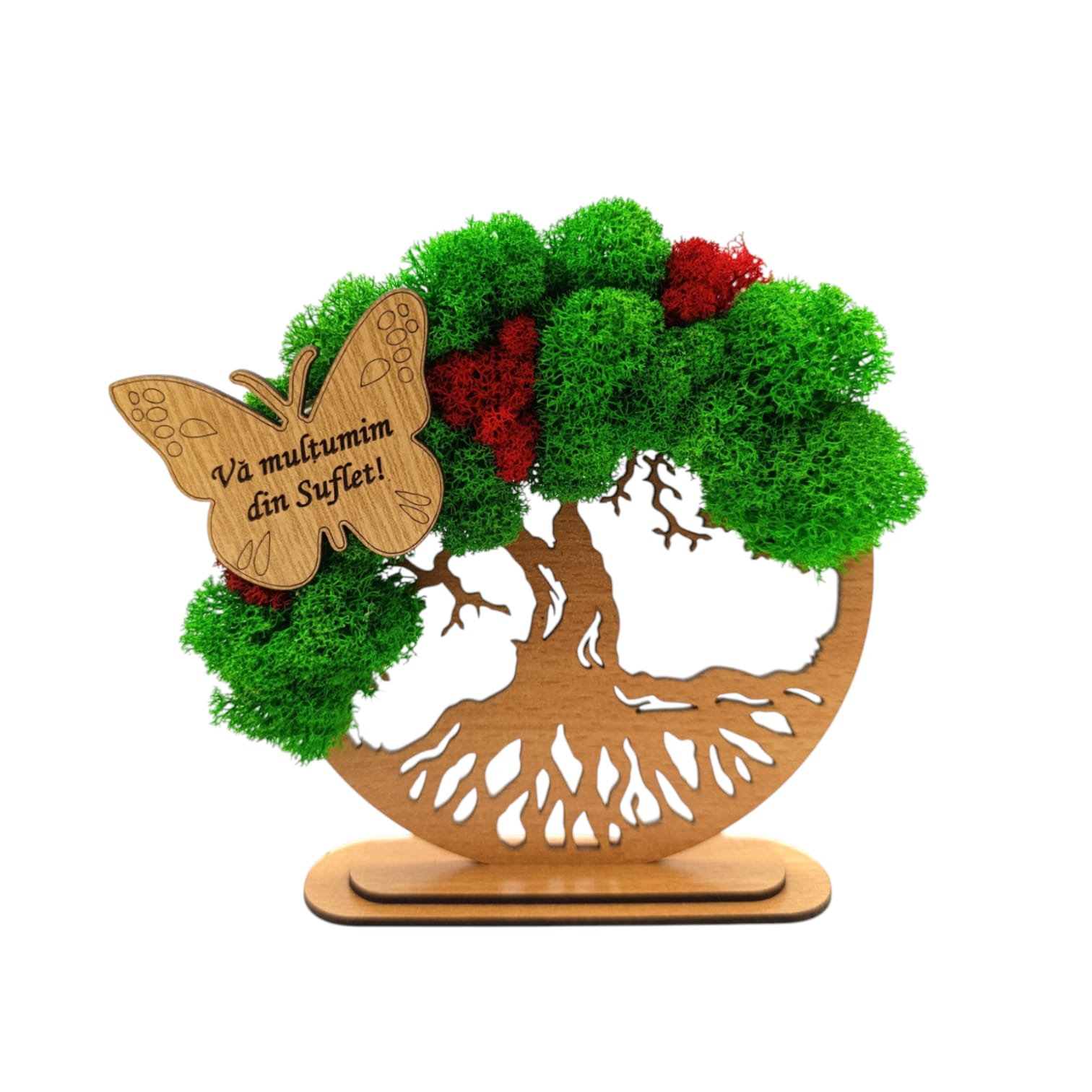 Tablou copacul vietii cu licheni naturali stabilizati, decorat cu fluture cu mesaj standard pentru Profesoara/Diriginta, dimensiune 10cm, maro