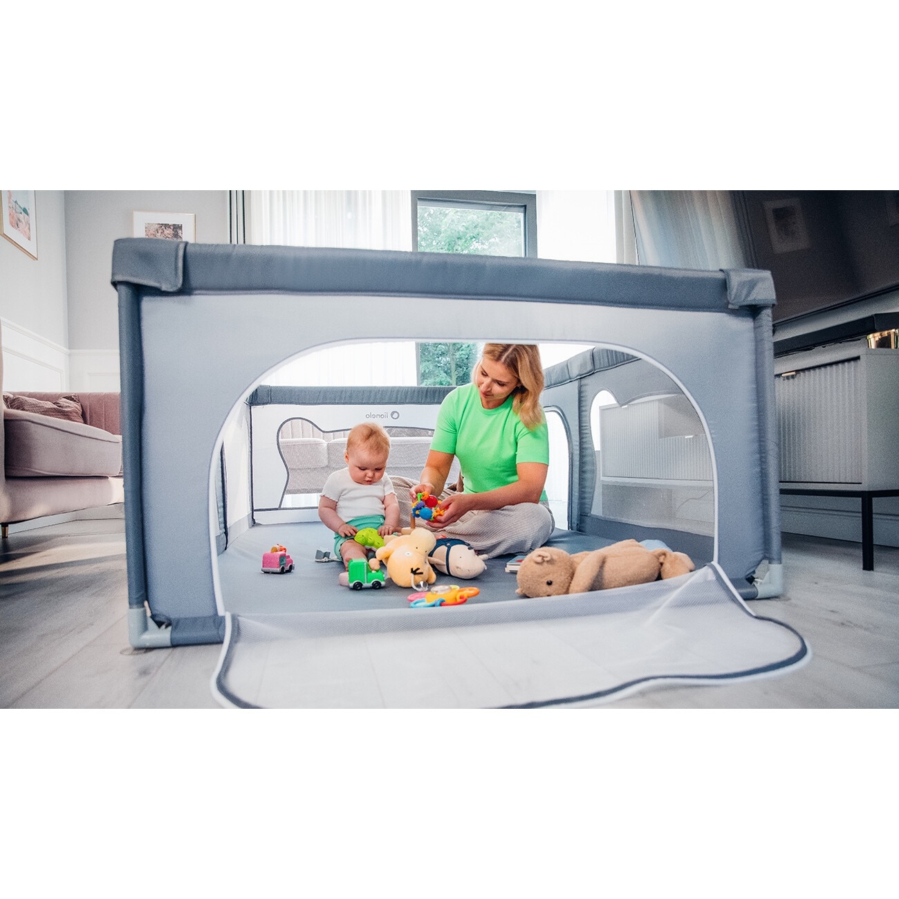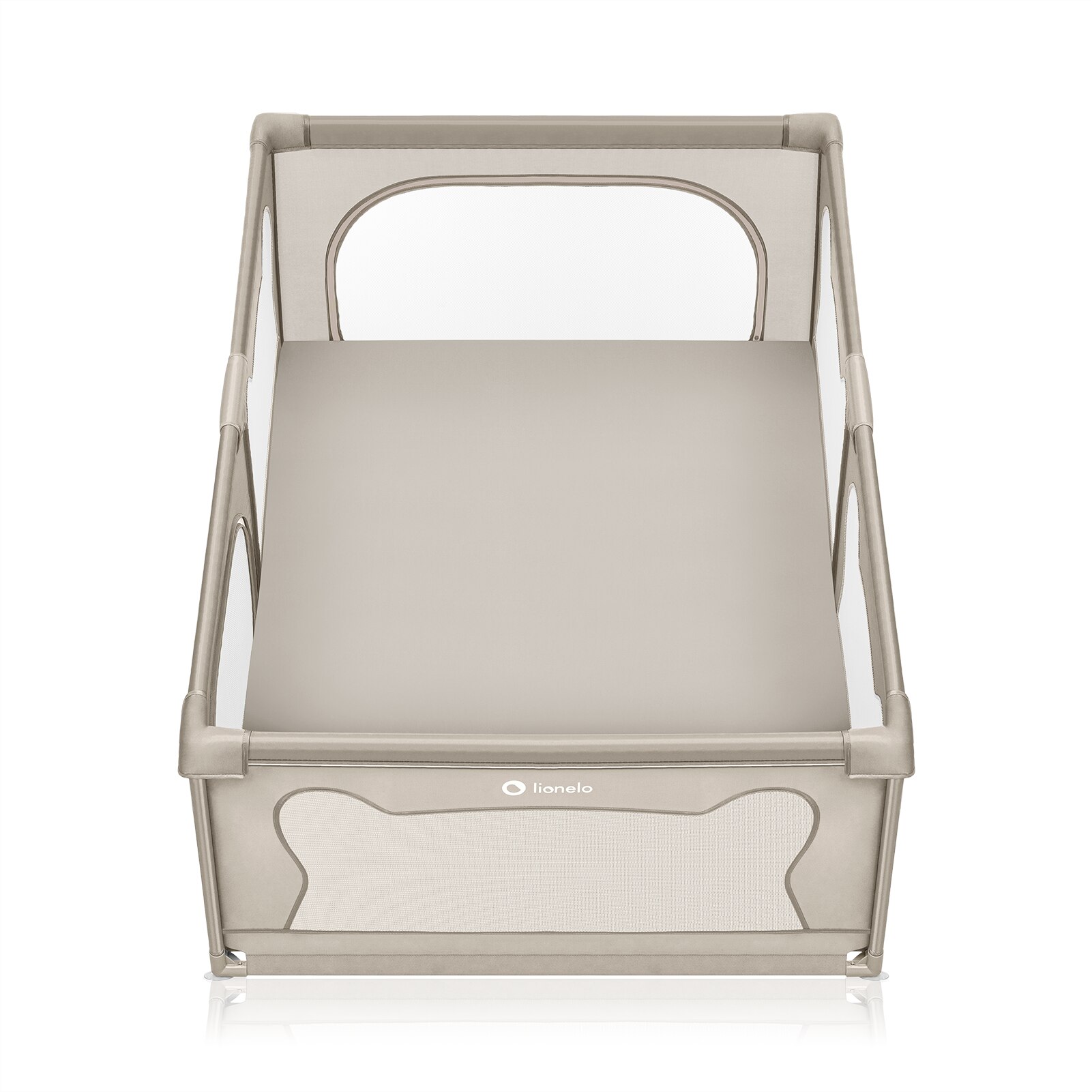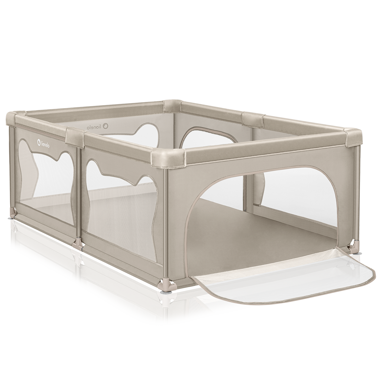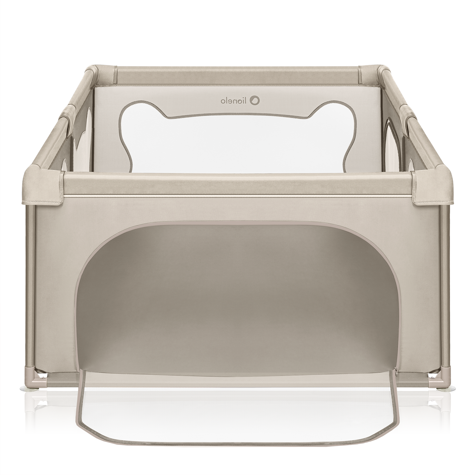 Tarc de joaca copii, Lionelo, Willow, 127 x 187 cm, Pliere compacta, Include geanta de transport, Din plasa, Cu doua intrari laterale si fermoar, Cu ventuze pentru stabilitate, Conform cu EN 12227:2010, Bej