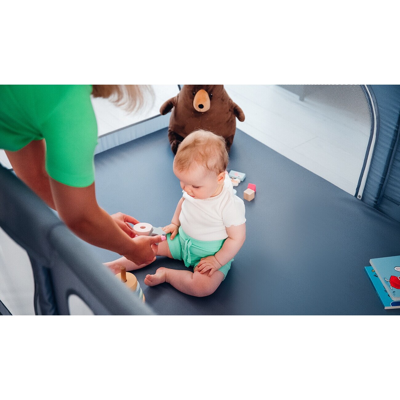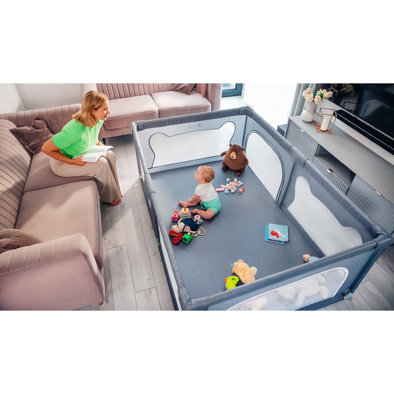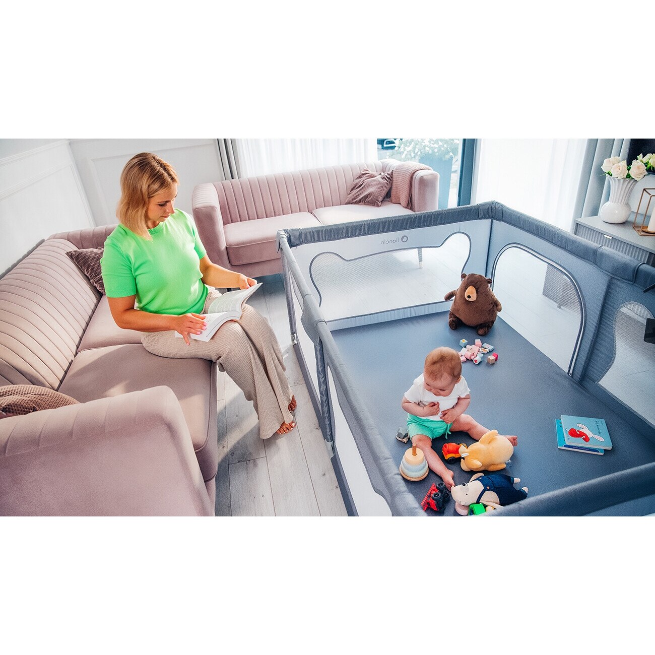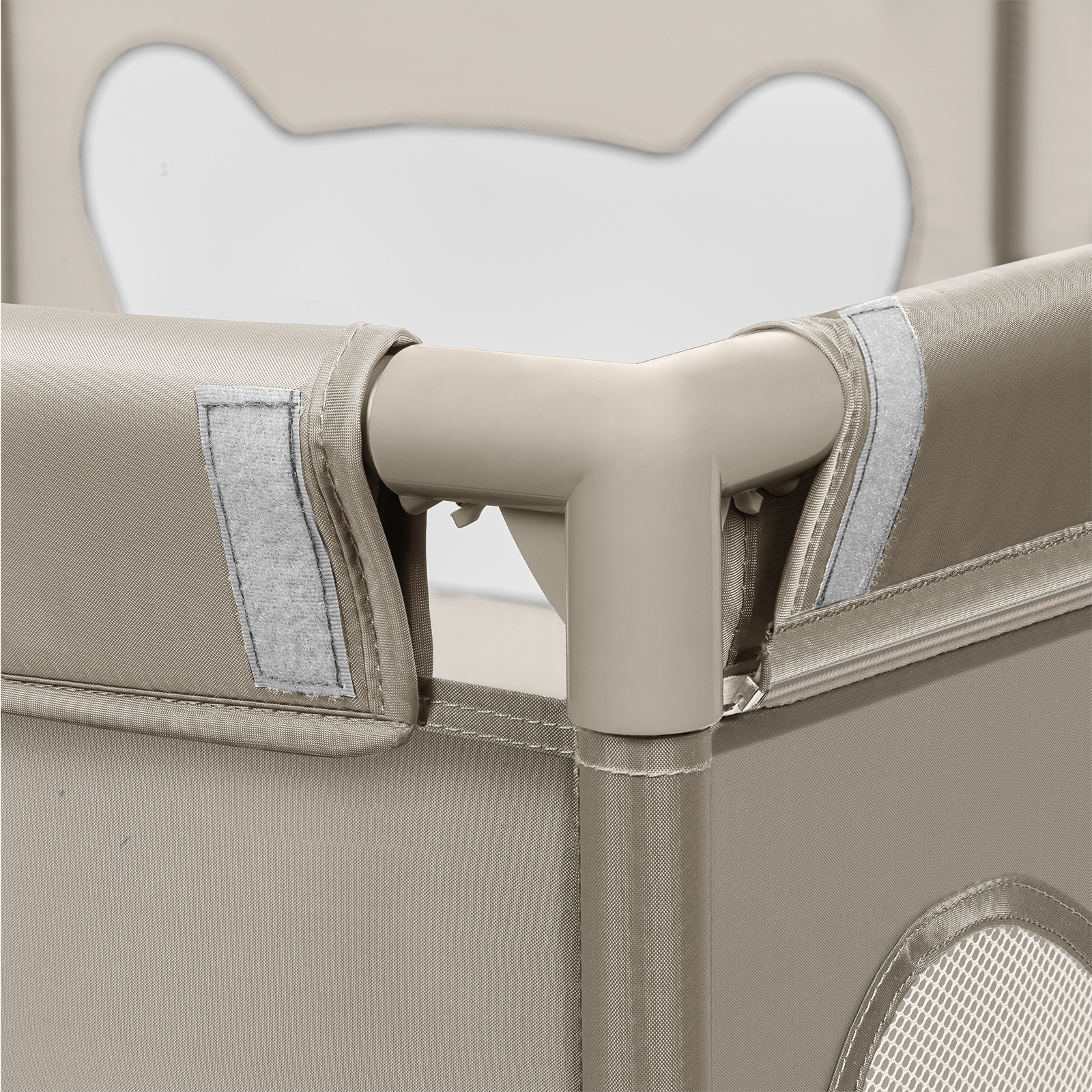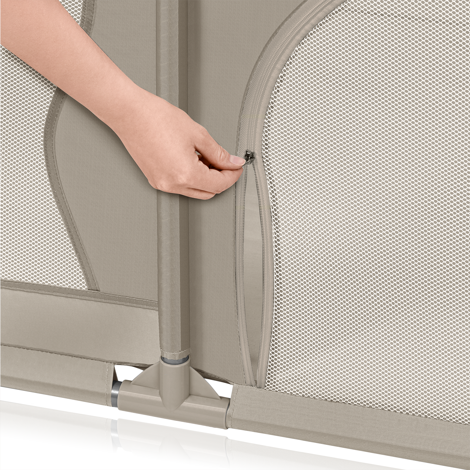 Tarc de joaca copii, Lionelo, Willow, 127 x 187 cm, Pliere compacta, Include geanta de transport, Din plasa, Cu doua intrari laterale si fermoar, Cu ventuze pentru stabilitate, Conform cu EN 12227:2010, Bej