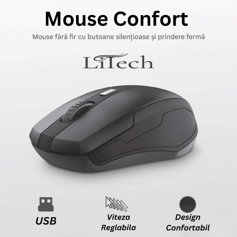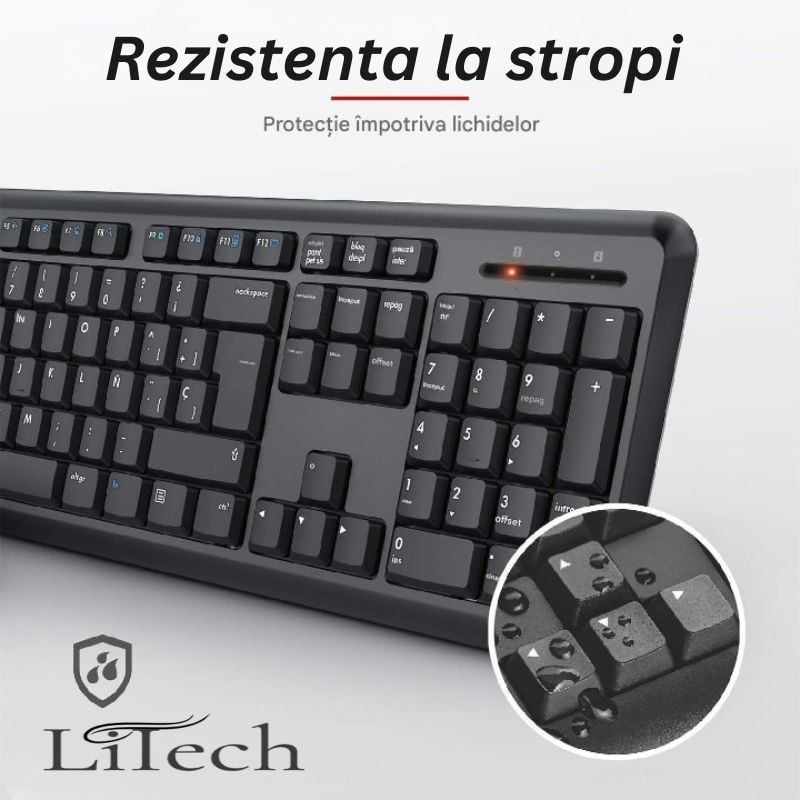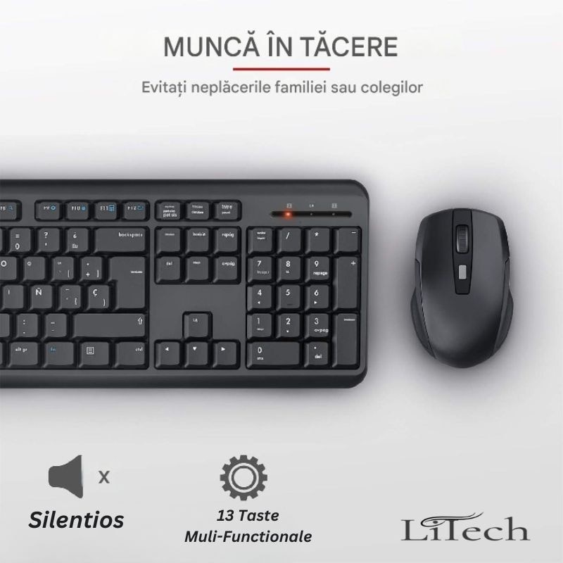 Tastatura si Mouse Fara Fir LiTech® QWERTY Spaniola, Taste Silentioase, 13 Taste Office & Multimedia, Un Singur Receptor USB, Compatibil Windows/Mac/PC/Laptop, Design Ergonomic, Ideal Birou