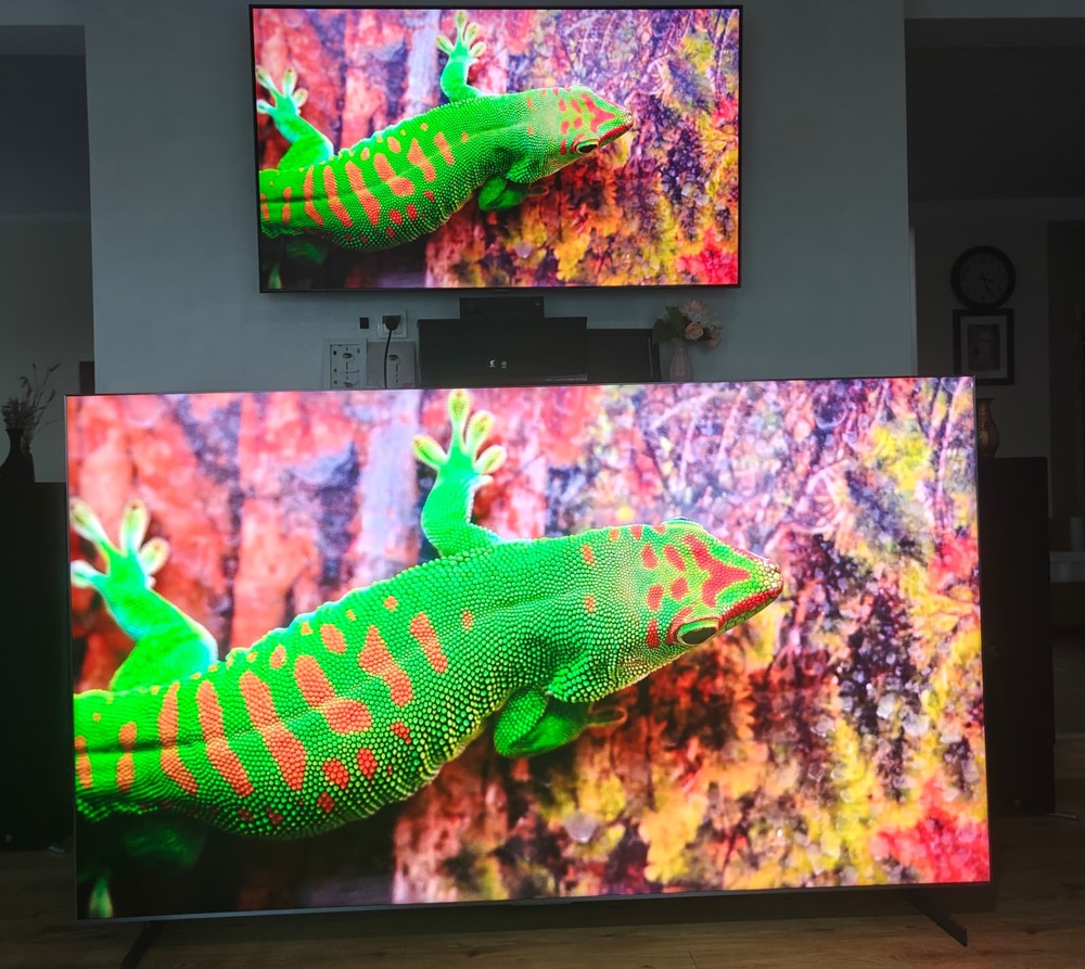 Este imens. Te obisnuiesti cu el si iti par retul televizoarelor mici. Eu tin luminozitatea pe 15 din 100. Chiar nu este nevoie de mai mult. Deasupra lui este un ecran de videoproiector de 110 inch. Nu il mai folosim. La 98' inch.. Si culori mult mai bune este super.