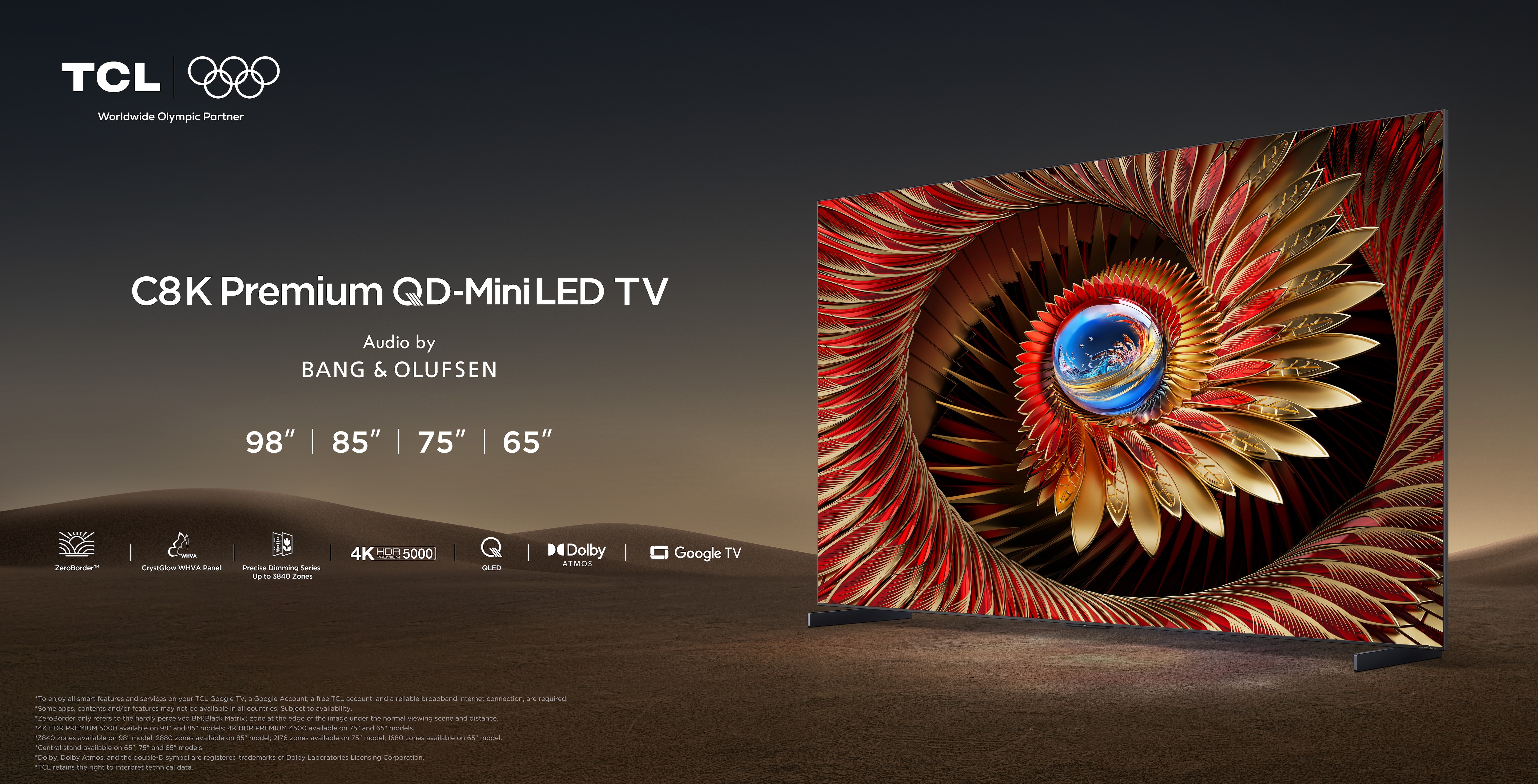 Televizor TCL QD-MiniLed 65C8K, 164 cm, Smart Google TV, 4K Ultra HD, 100Hz, Sunet Bang & Olufsen, Clasa D (Model 2025)