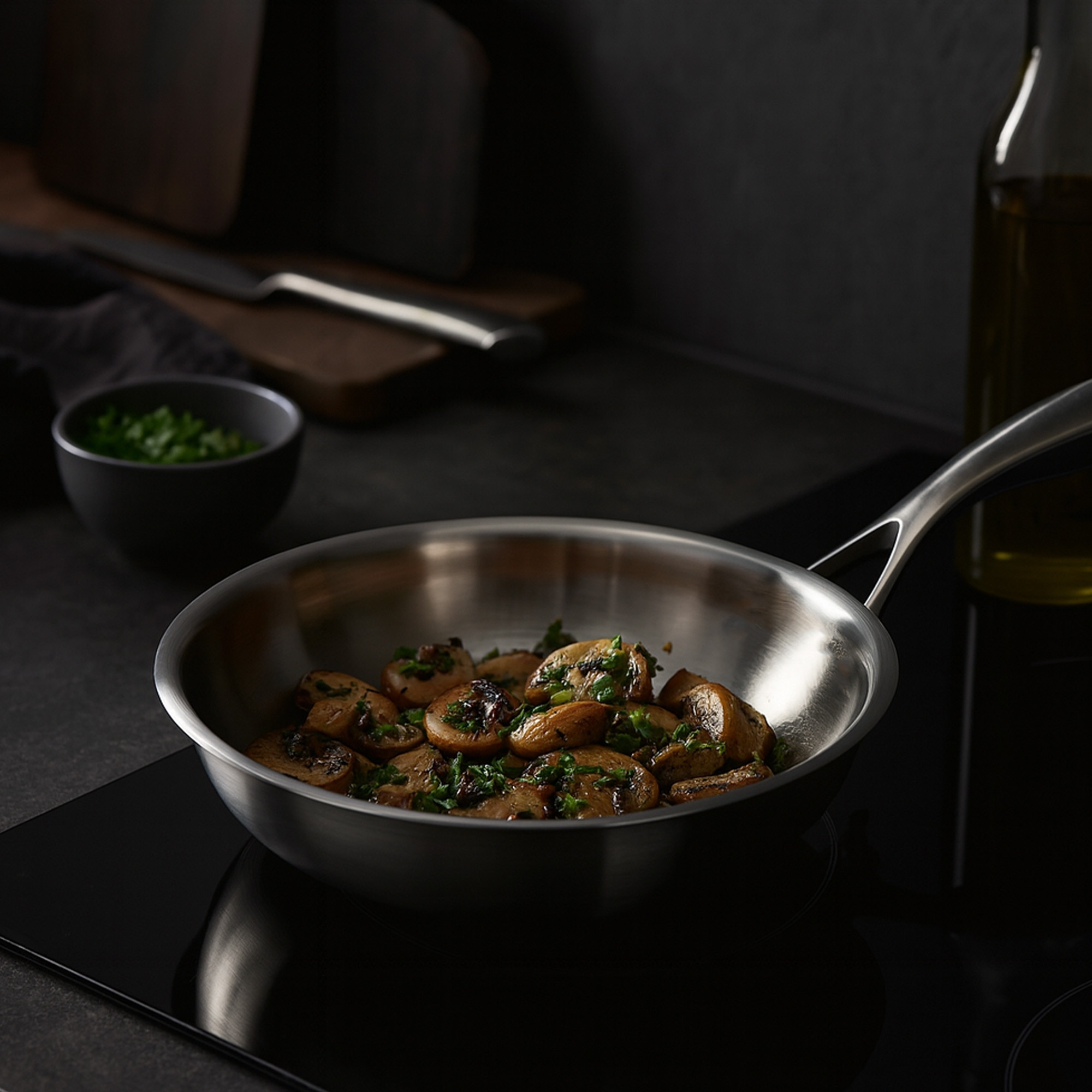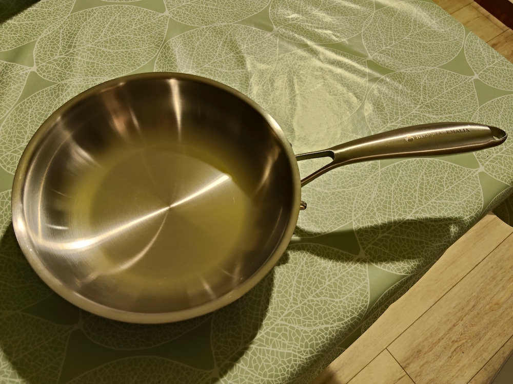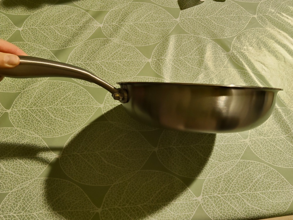 Mânerul este prins de tigaie cu două șuruburi, și se poate demonta dacă este necesar. Finisajul este profi, satinat pe ambele părți. Buza tigăii este făcută să înlesnească transferul mâncărilor și mai ales al lichidelor sau sosurilor.