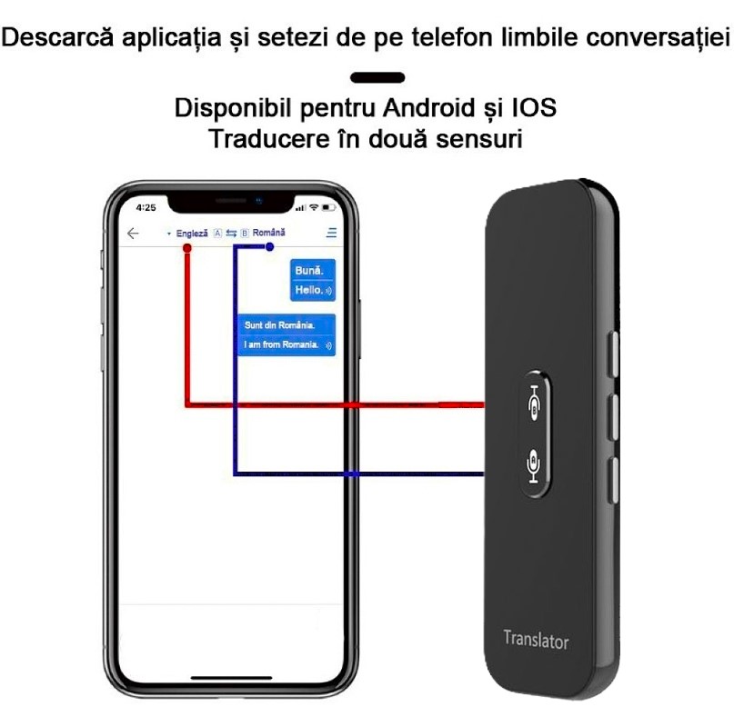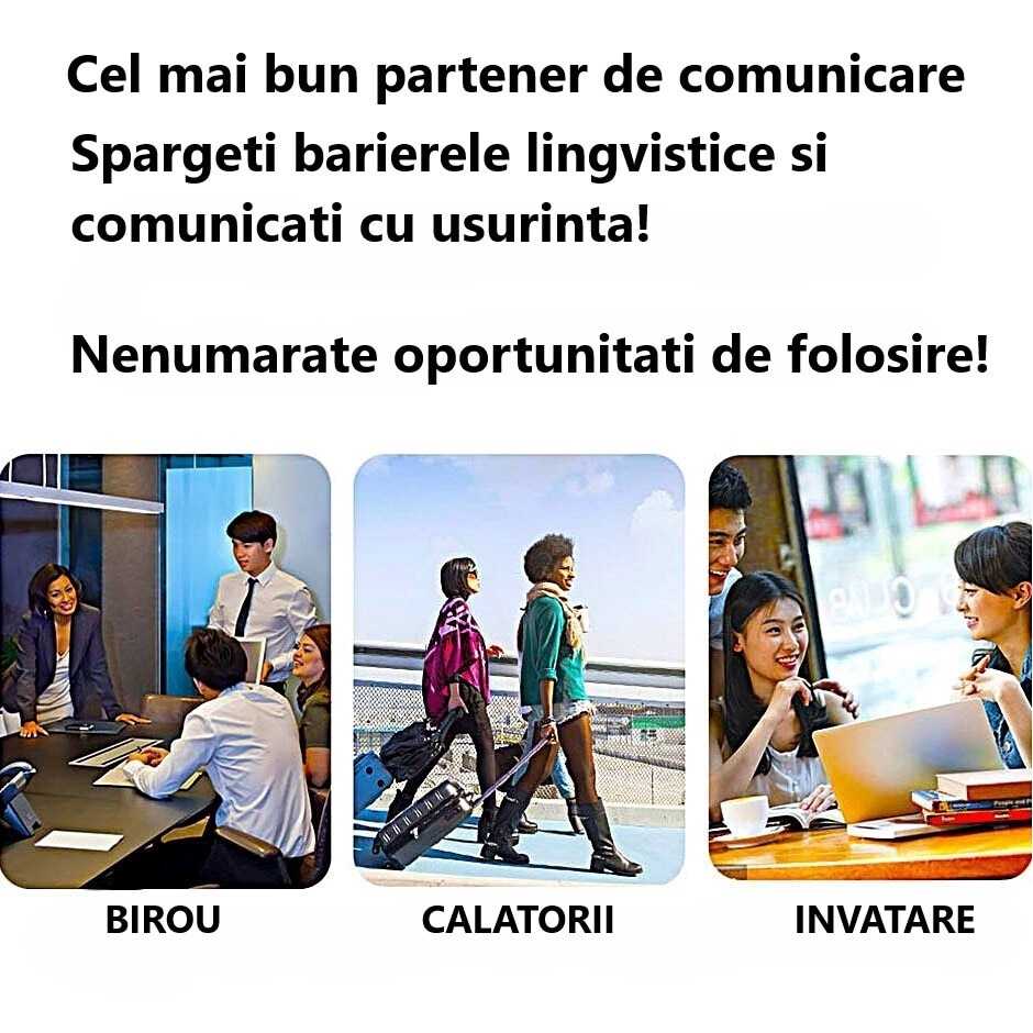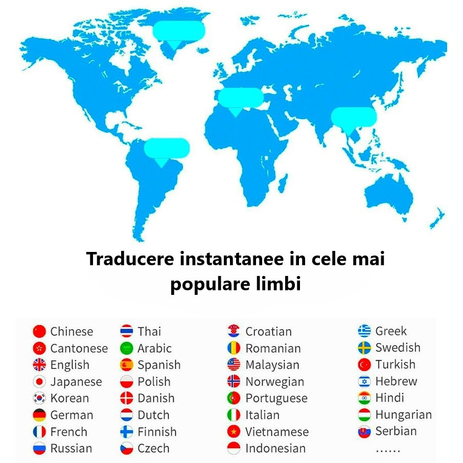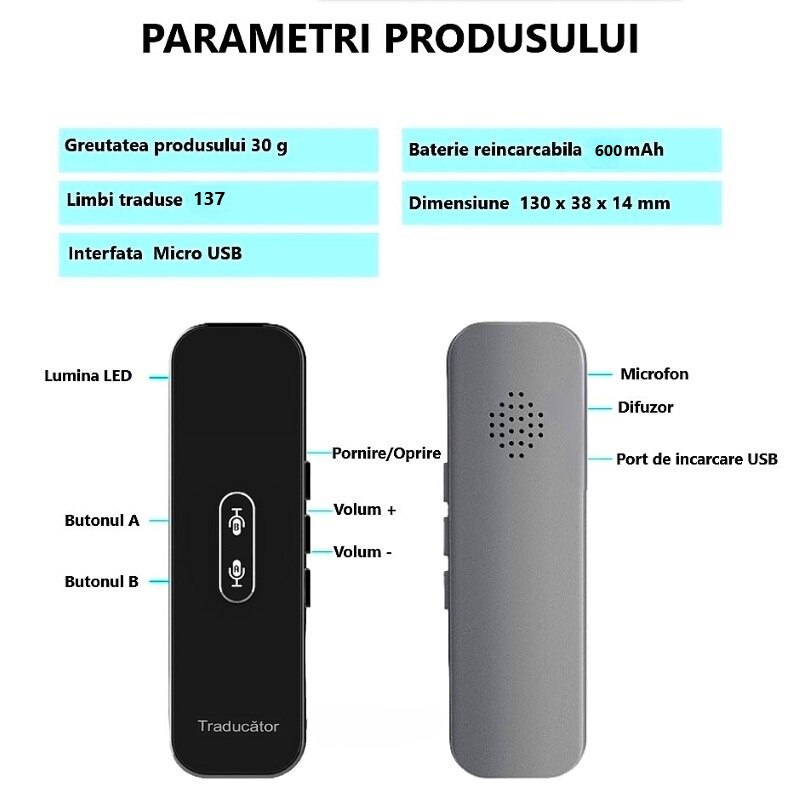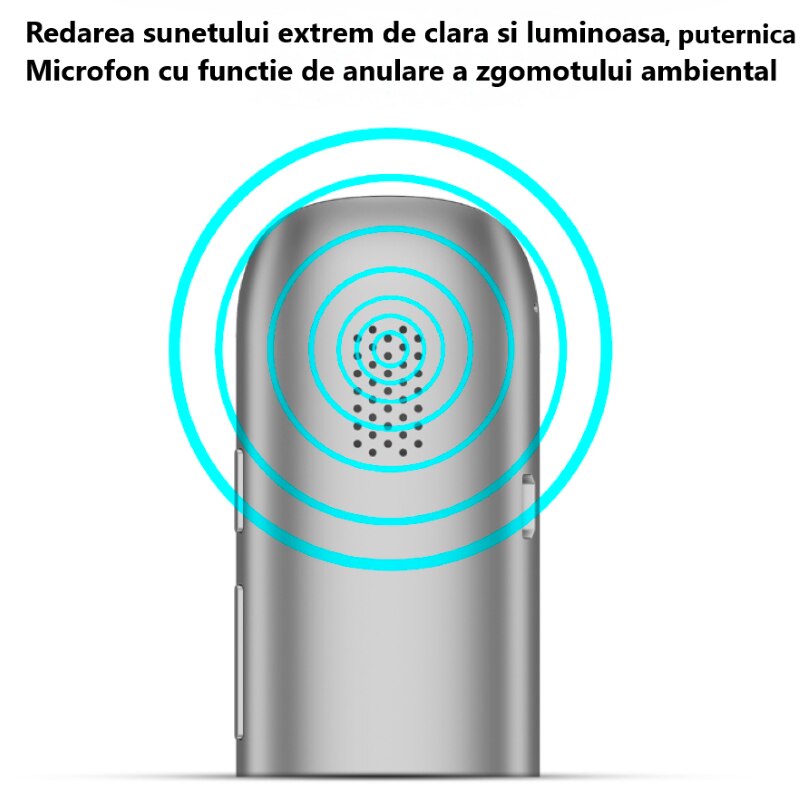 | Altele | Baterie reincarcabila Compatibil Android si iOS Aplicatie dedicata pentru smartphone SMART Bluetooth 5.0 Compatibilitate universala Incarcare: USB-C Anulare zgomot de fond Microfon Dual Perfect pentru utilizarea in interior si exterior Baterie durabila: 800 mAh Incarcare rapida 2 ore Portabil si usor Traducere vocala Traducere text Traducere foto Instalare facila Precizie ridicata de recunoastere a vocii Utilizare indelungata: continua 48 ore, stand-by 30 zile Difuzor puternic Traducere instantanee in 137 limbi |
