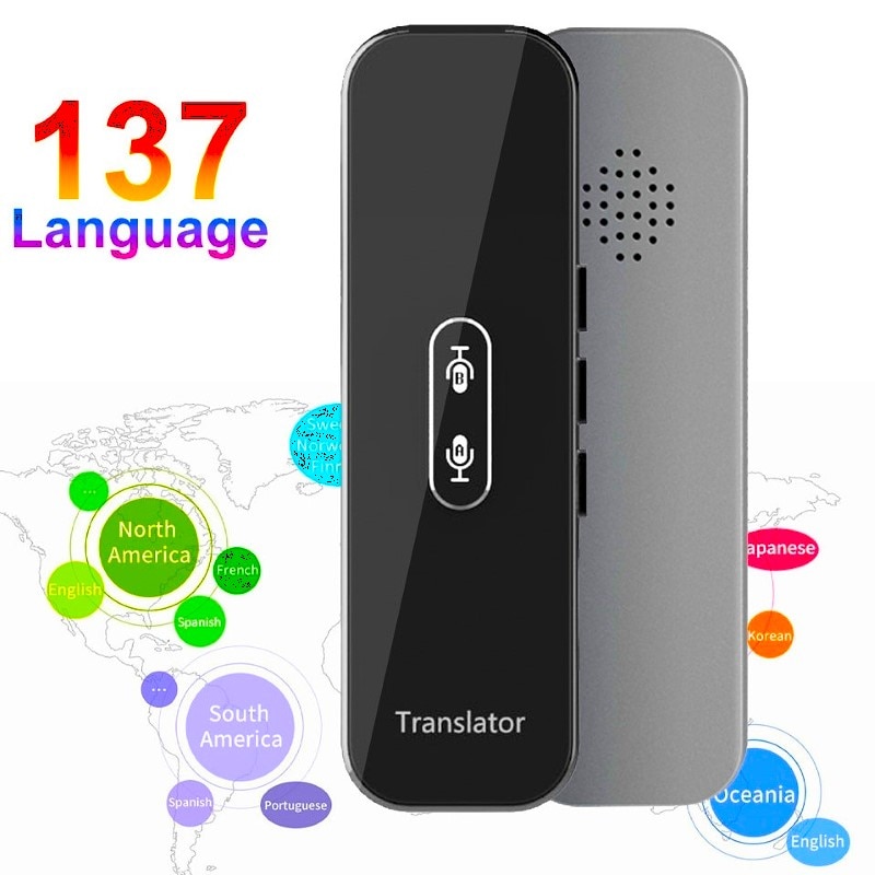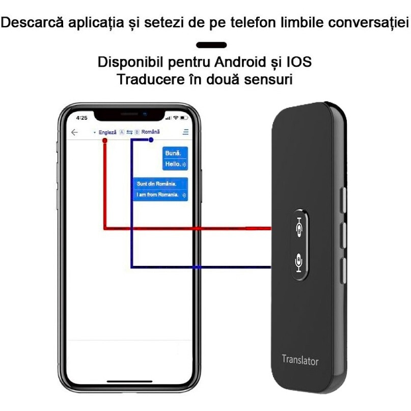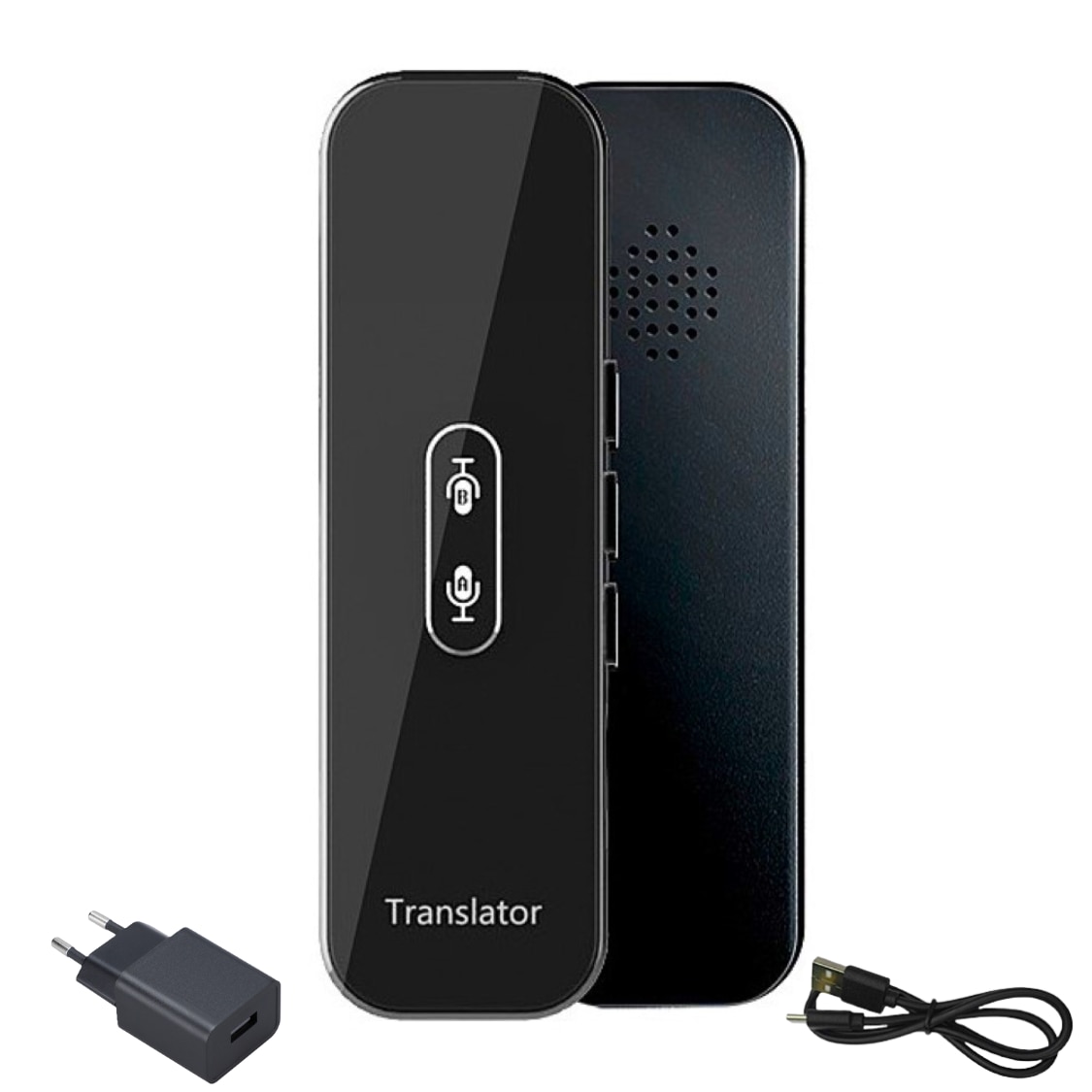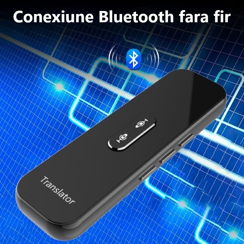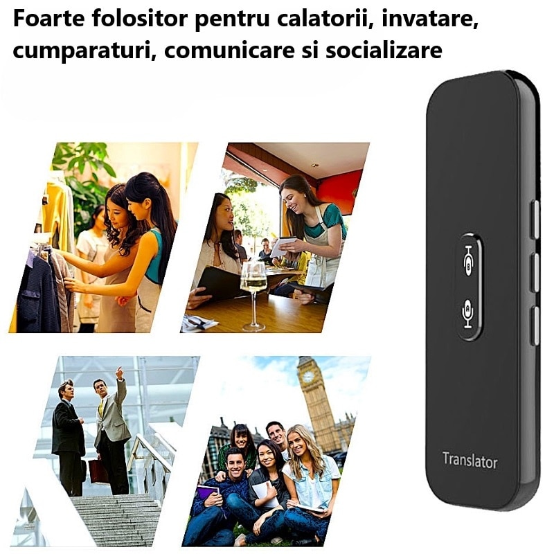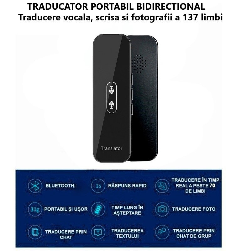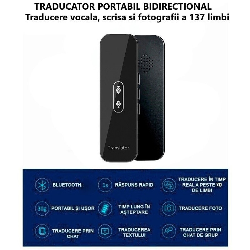 Traducator inteligent bidirectional online Bluetooth 72DESI, 104 de limbi, traducere foto, vocala si scrisa, inregistrare vocala, difuzor dual, carcasa neagra + Incarcator 5V