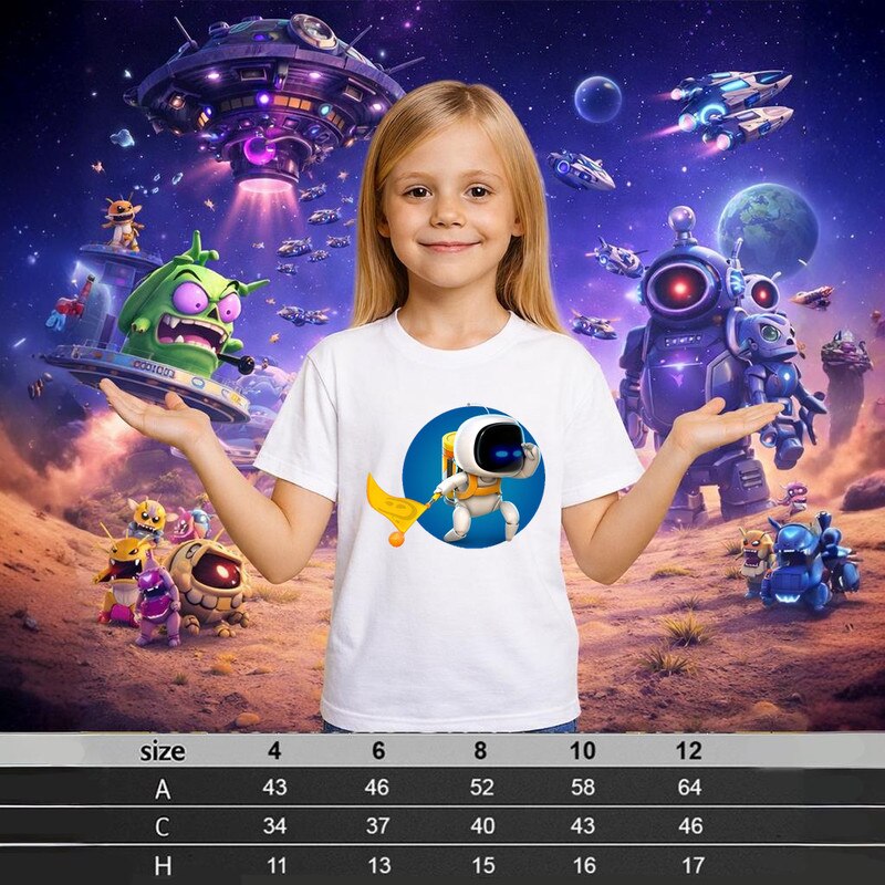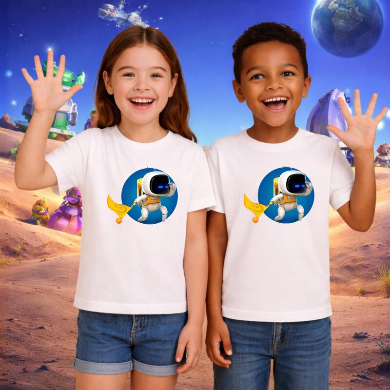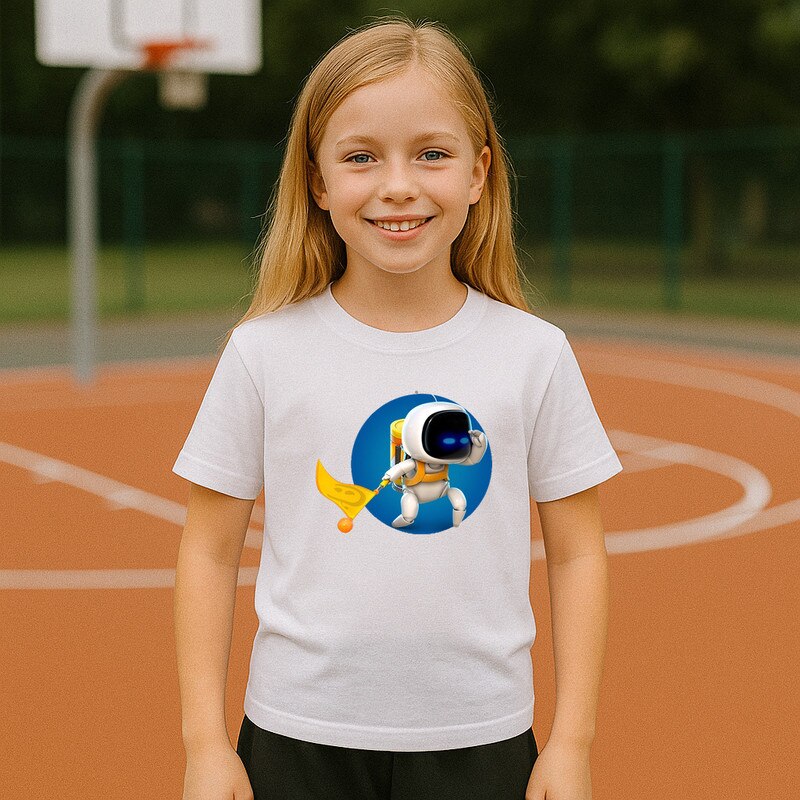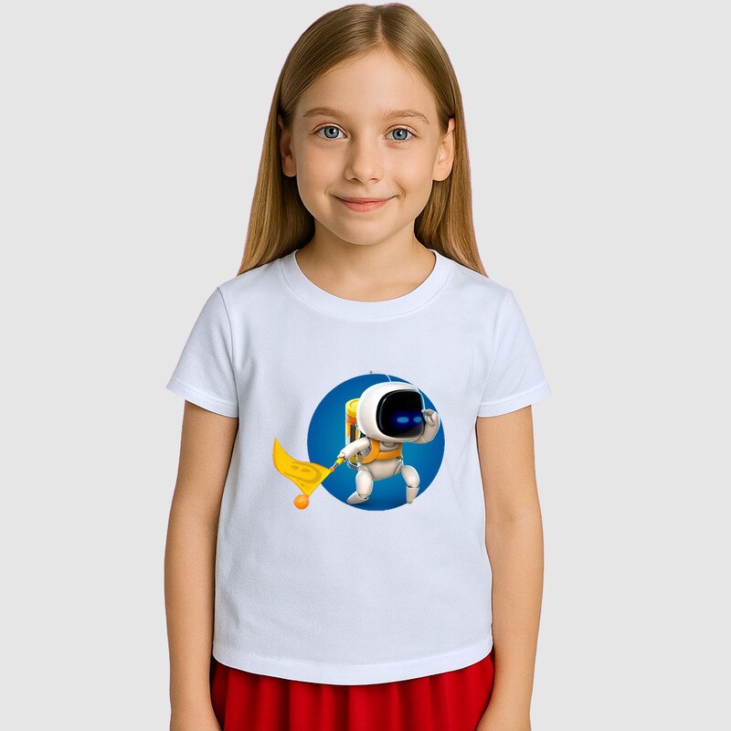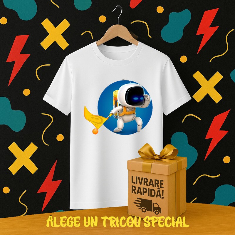 Tricou Astro Bot personaj cu steag stil animat. Copii, 100% Bumbac, Cri-Flo, Culoare Alb, Marime 5-6 ani, 122 CM