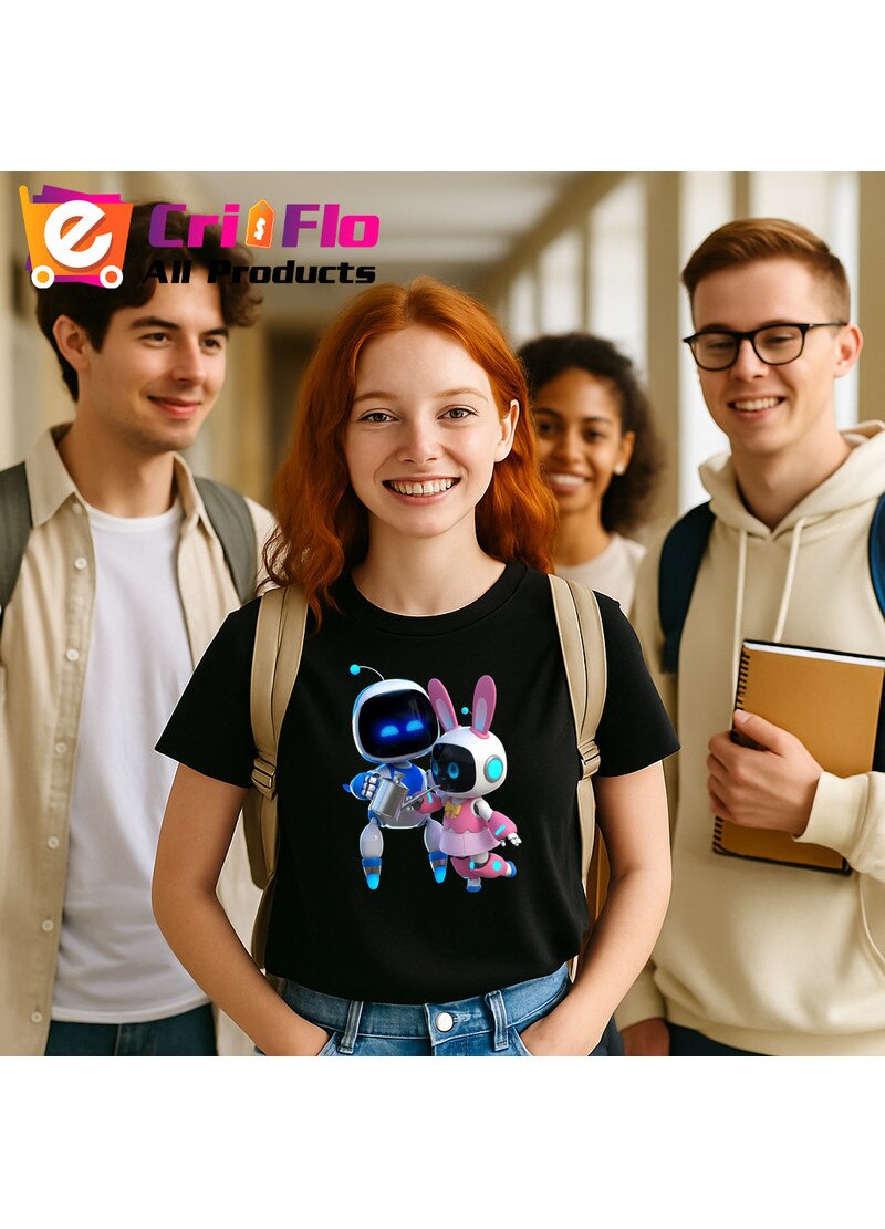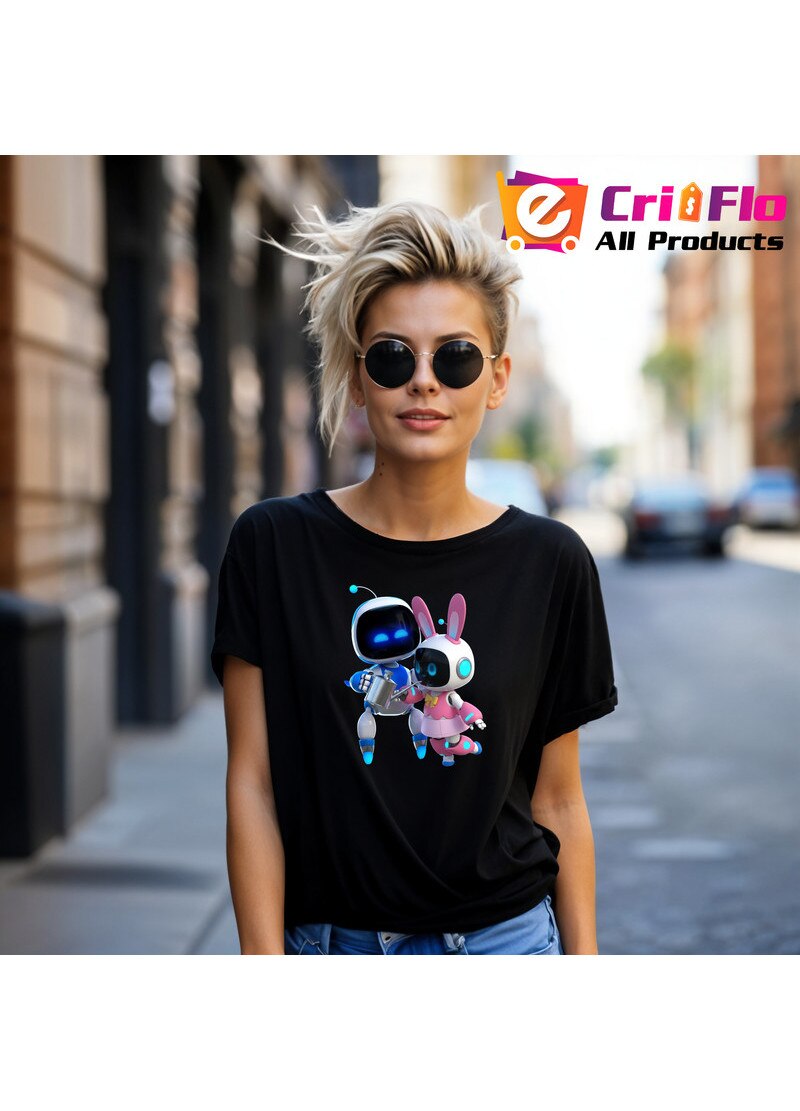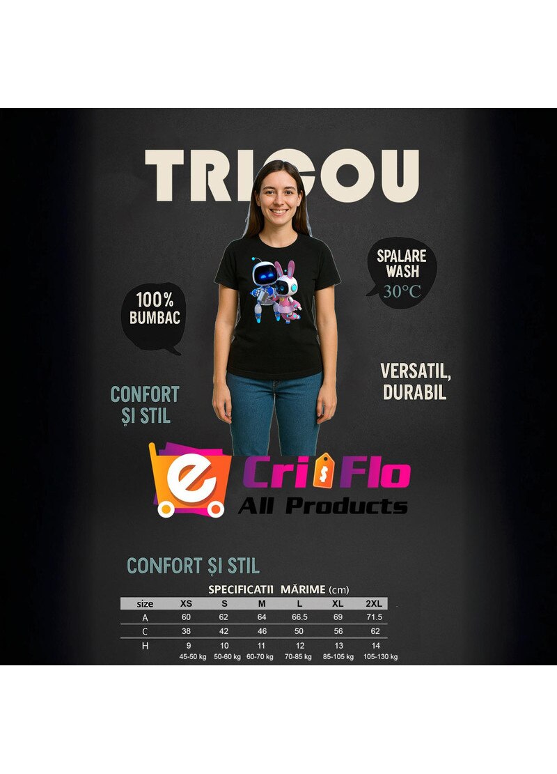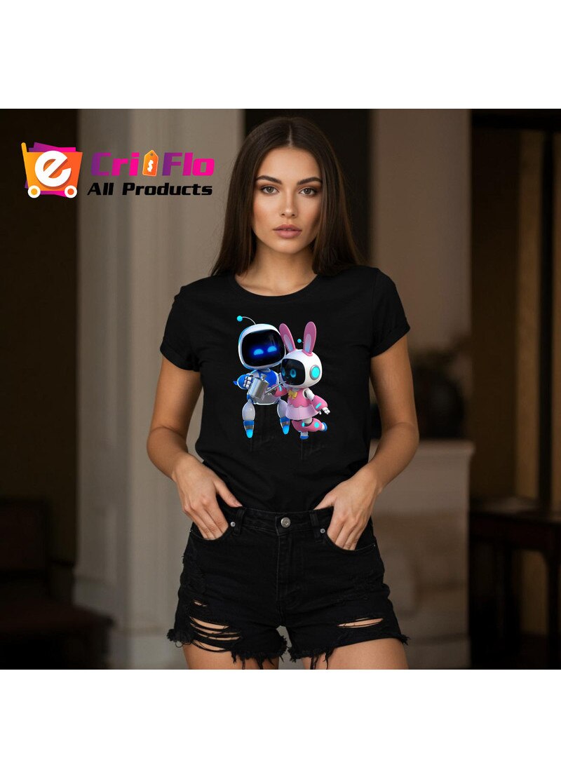 Tricou Astro Bot personaje cuplu joc video, Dama, 100% Bumbac, Cri-Flo, Culoare Negru, Marime XL