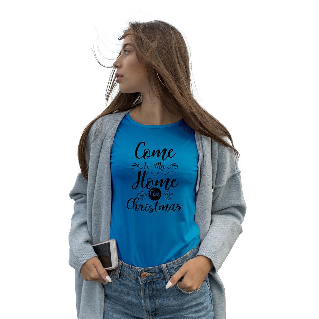 Tricou dama cu mesaj personalizat "Come to my home for Christmas", bumbac, Oktane, turcoaz, S