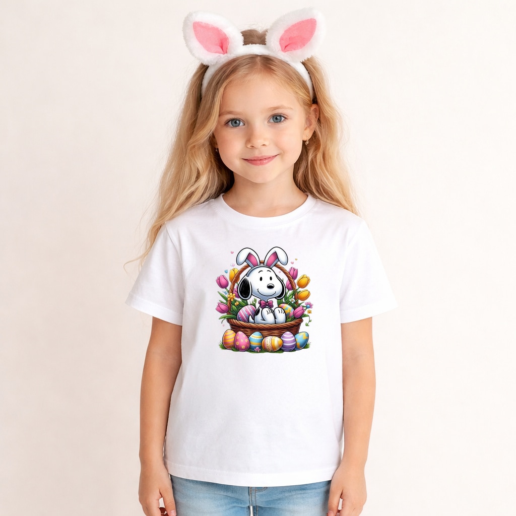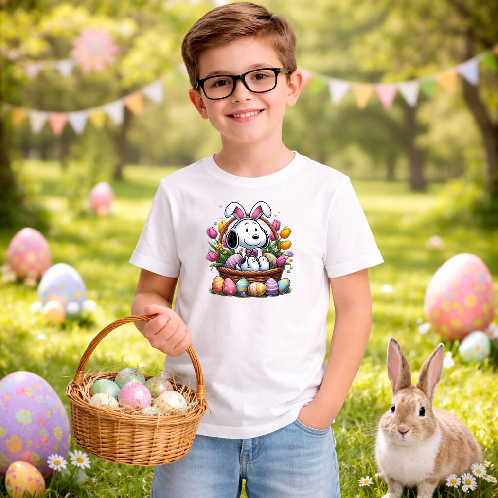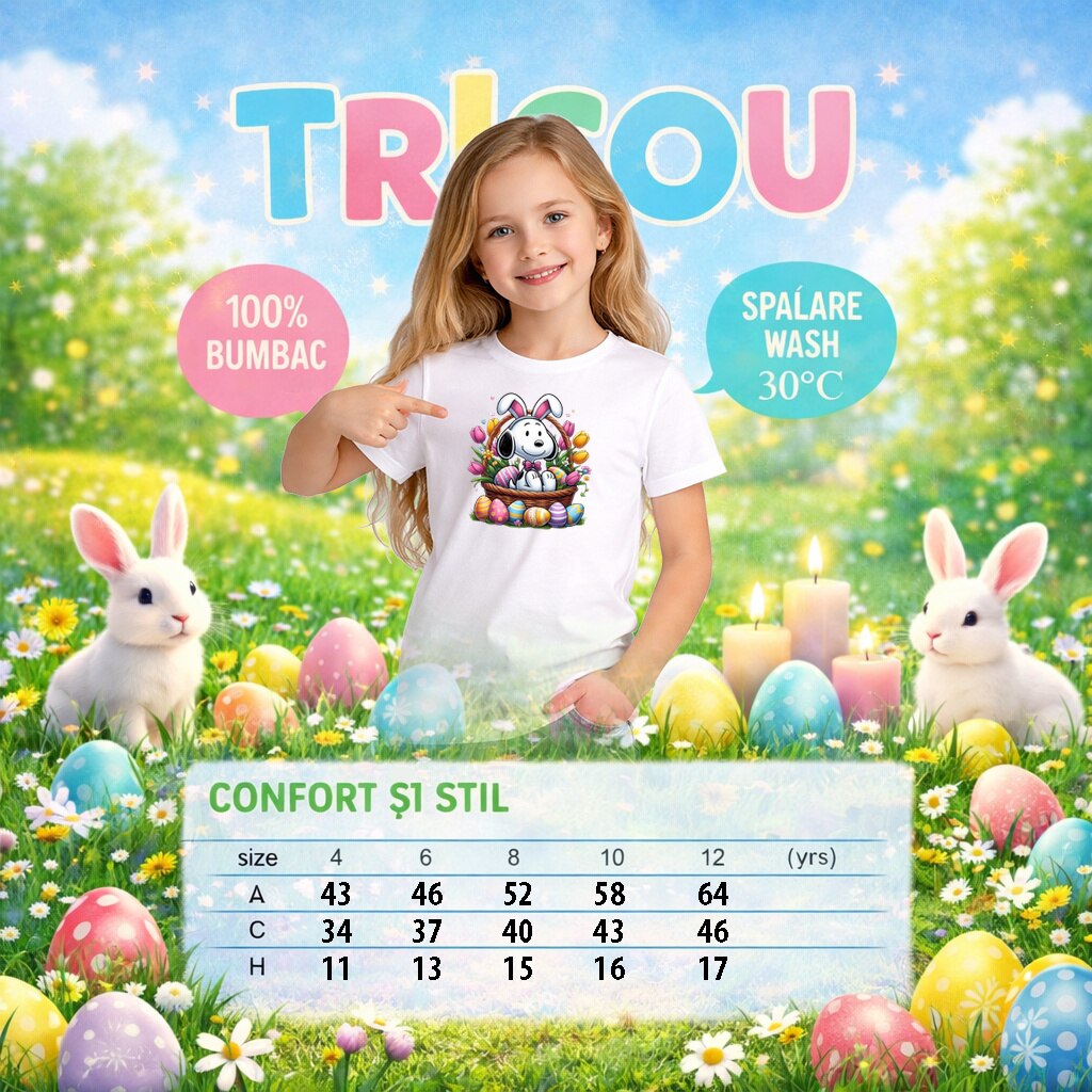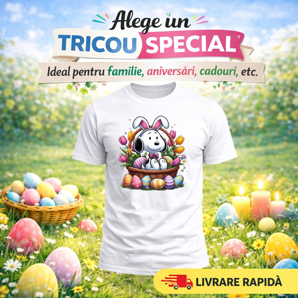 Tricou Paste Snoopy Paste Cos Oua Colorate Floral V2, Copii, 100% Bumbac, Cri-Flo, Cadou Aniversare Evenimente, Culoare Alb, Marime 7-8 ani, 134 CM