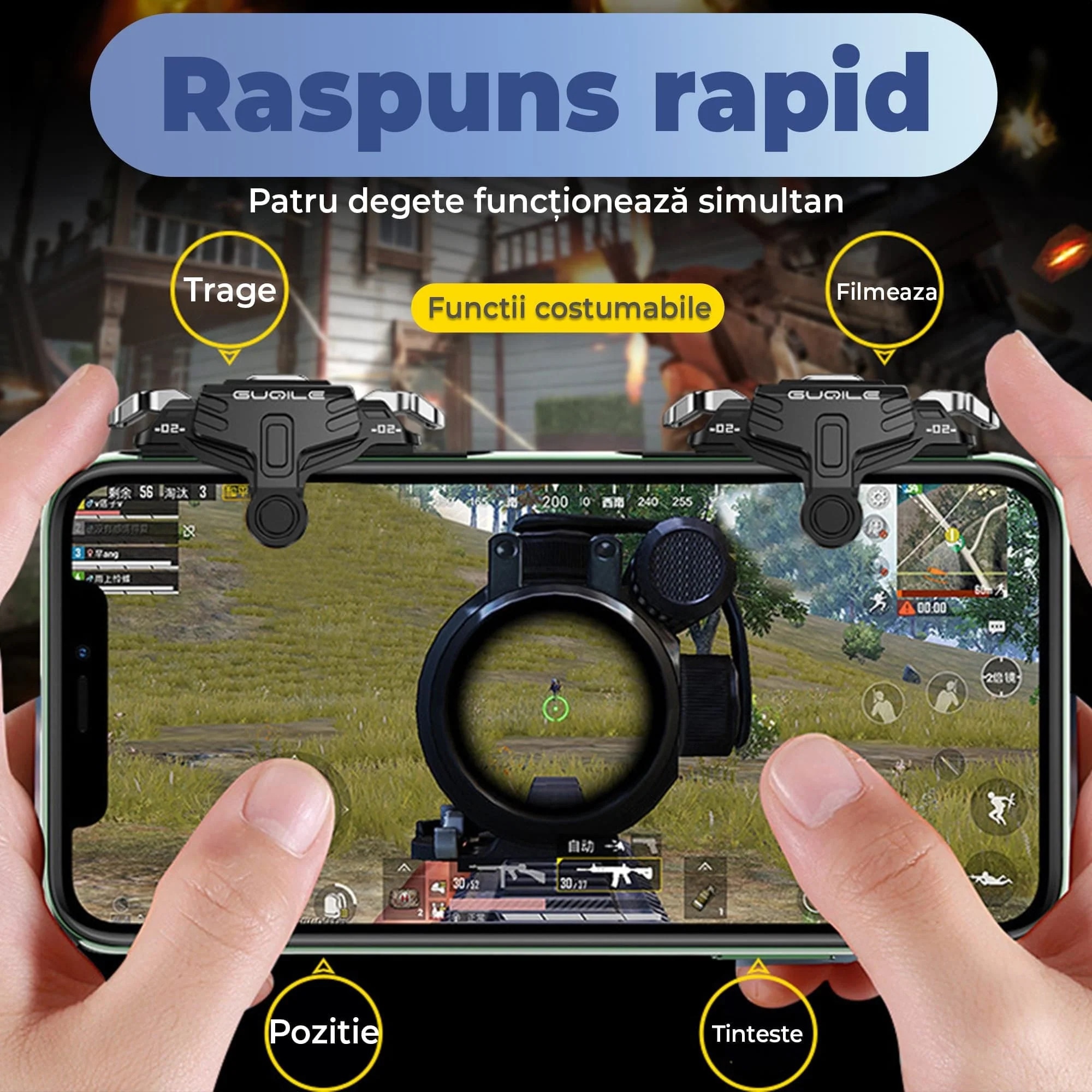 Triggere Gaming Mobile Universale – Controller cu 4 Butoane pentru Telefon si Tableta, Compatibil PUBG, Fortnite, COD, Design Ergonomic, Plug & Play, Reactie Instantanee, Negru